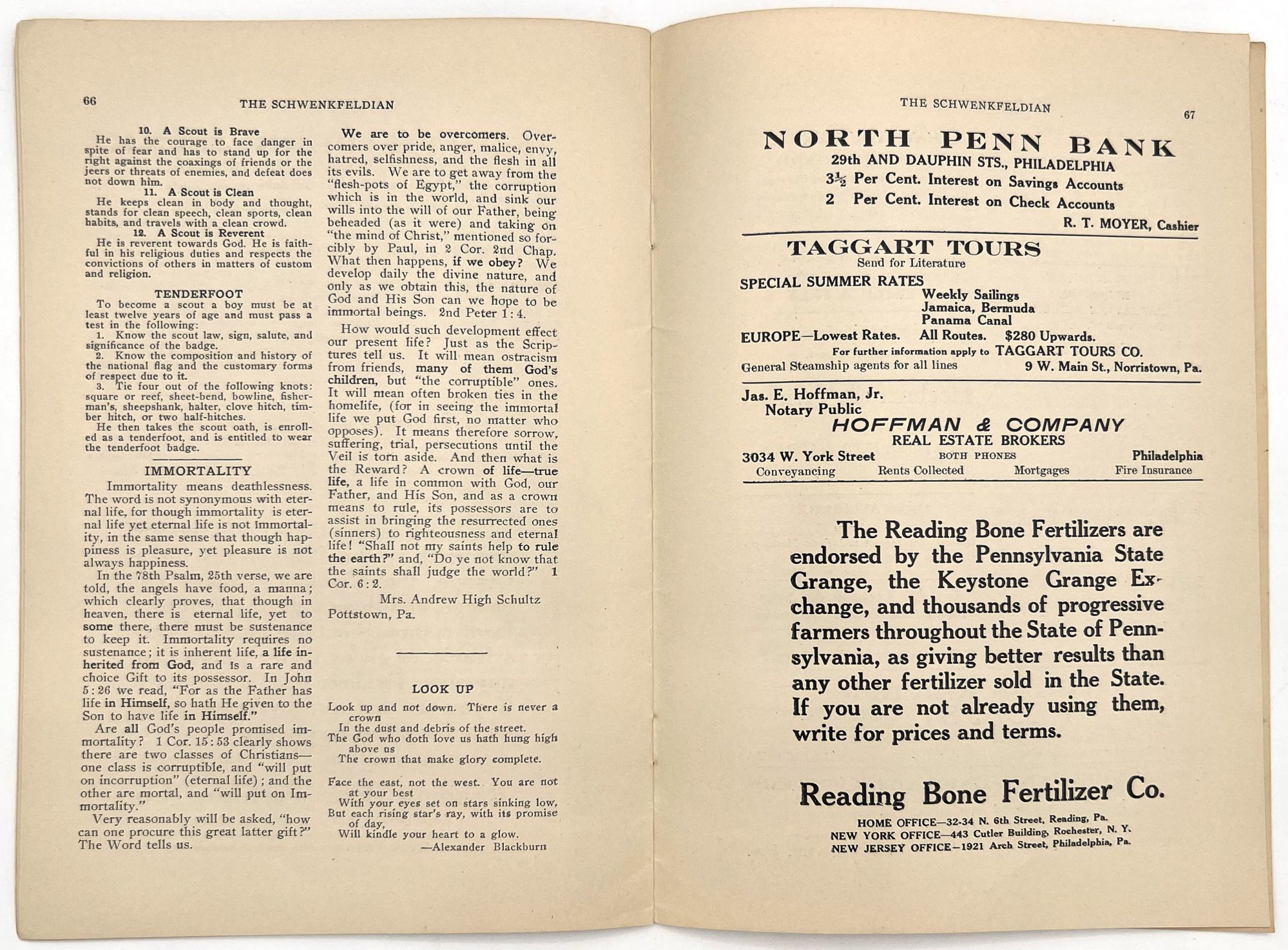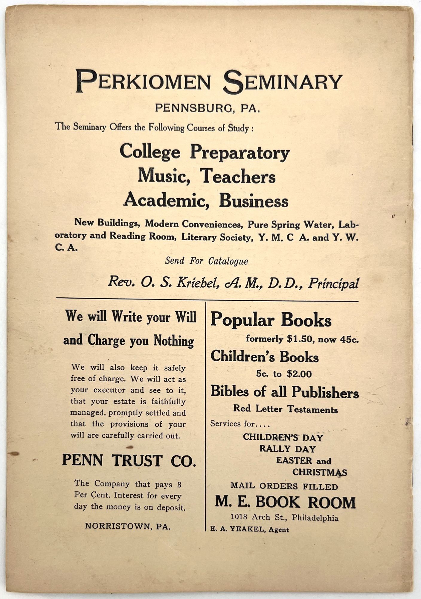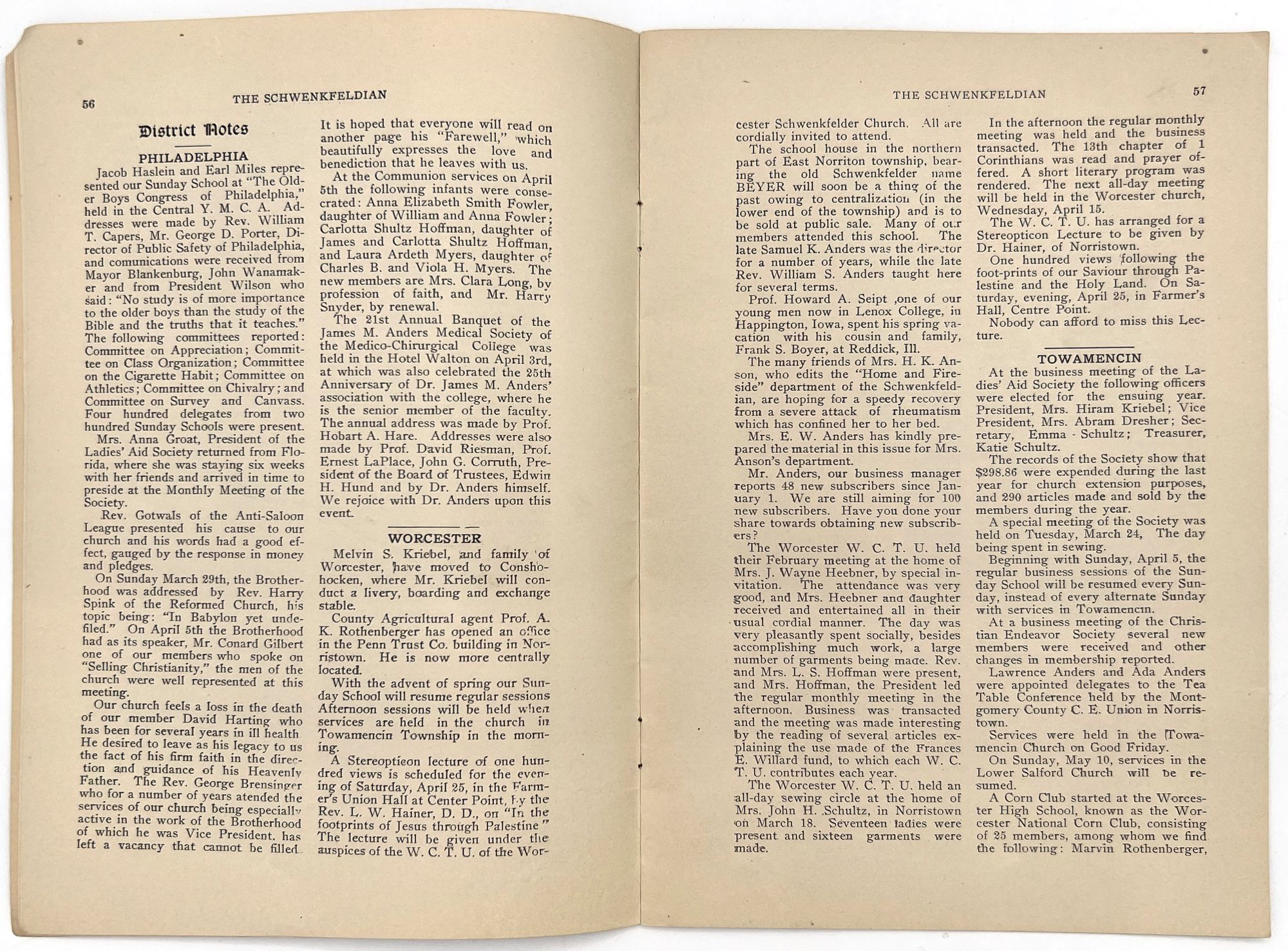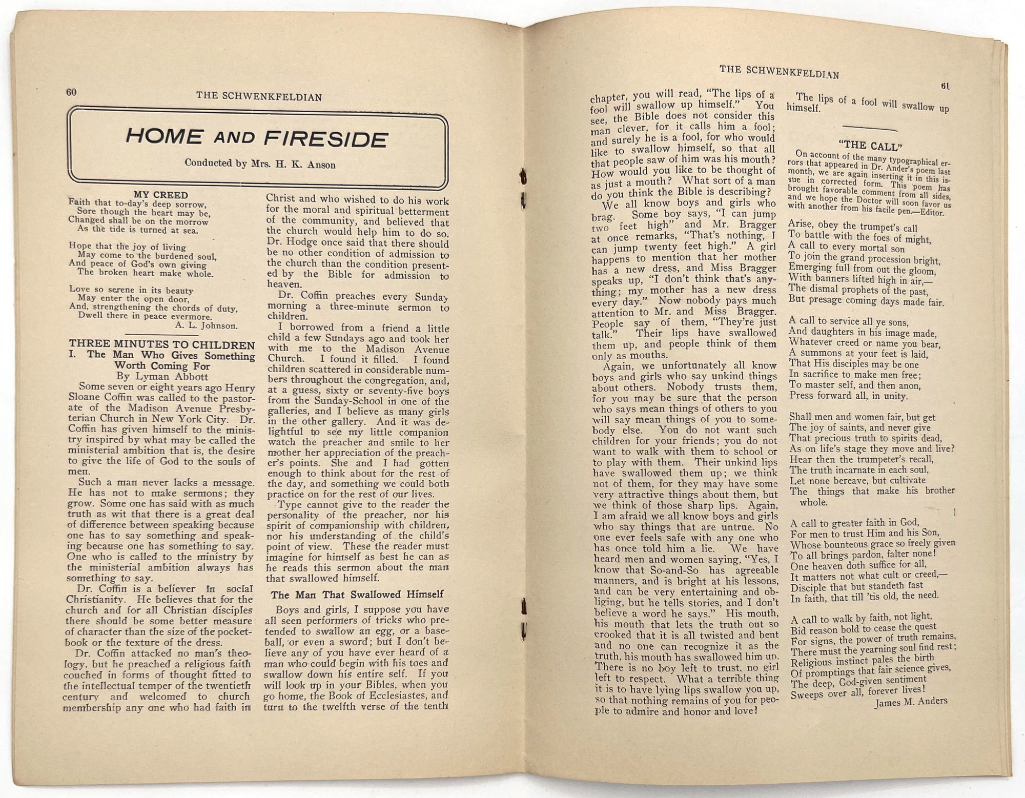 Norristown, Pennsylvania: Published by the General Conference of the Schwenkfelder Church, 1914. Very good. Minor rust staining from staples.. The April 1914 issue of "The Schwenkfeldian", a serial published "by the General Conference of the Schwenkfelder Church" in Pennsylvania. The Church was formed in the early 1900s and follows the teachings of the Protestant Reformation figure Caspar Schwenkfeld von Ossig (1489-1561). Schwenkfelders have existed in the United States since the 1700s. This issue of "The Schwenkfeldian" contains poetry, a report on their recent conferences, member news (e.g. recent deaths or meetings), an article on local Boy Scout groups, and a section titled "Home and Fireside" by "Mrs. H.K. Anson" with moral advice for children. Single vol. (10" by 6.75"), pp. [53]-68, stapled in original printed wrps.