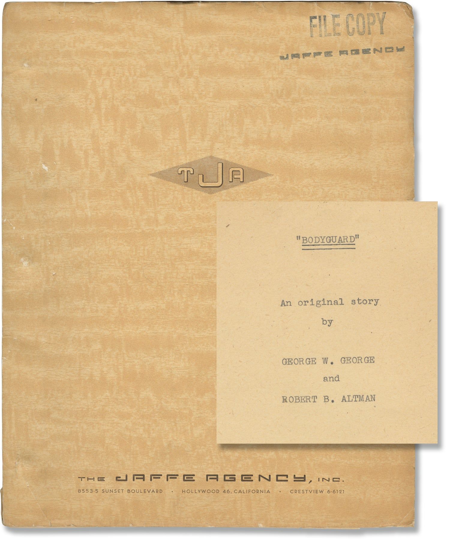 Tan agency wrappers ("The Jaffe Agency" printed at the bottom of the front wrapper, and with their diamond TJA logo at the center), Title page present, with credits for screenwriters Altman and George. 55 leaves, with last page of text numbered 54. Mimeograph duplication. Pages about Near Fine with a small chip at the bottom right corner of the title page, wrapper Very Good plus, internally bound with three gold brads.