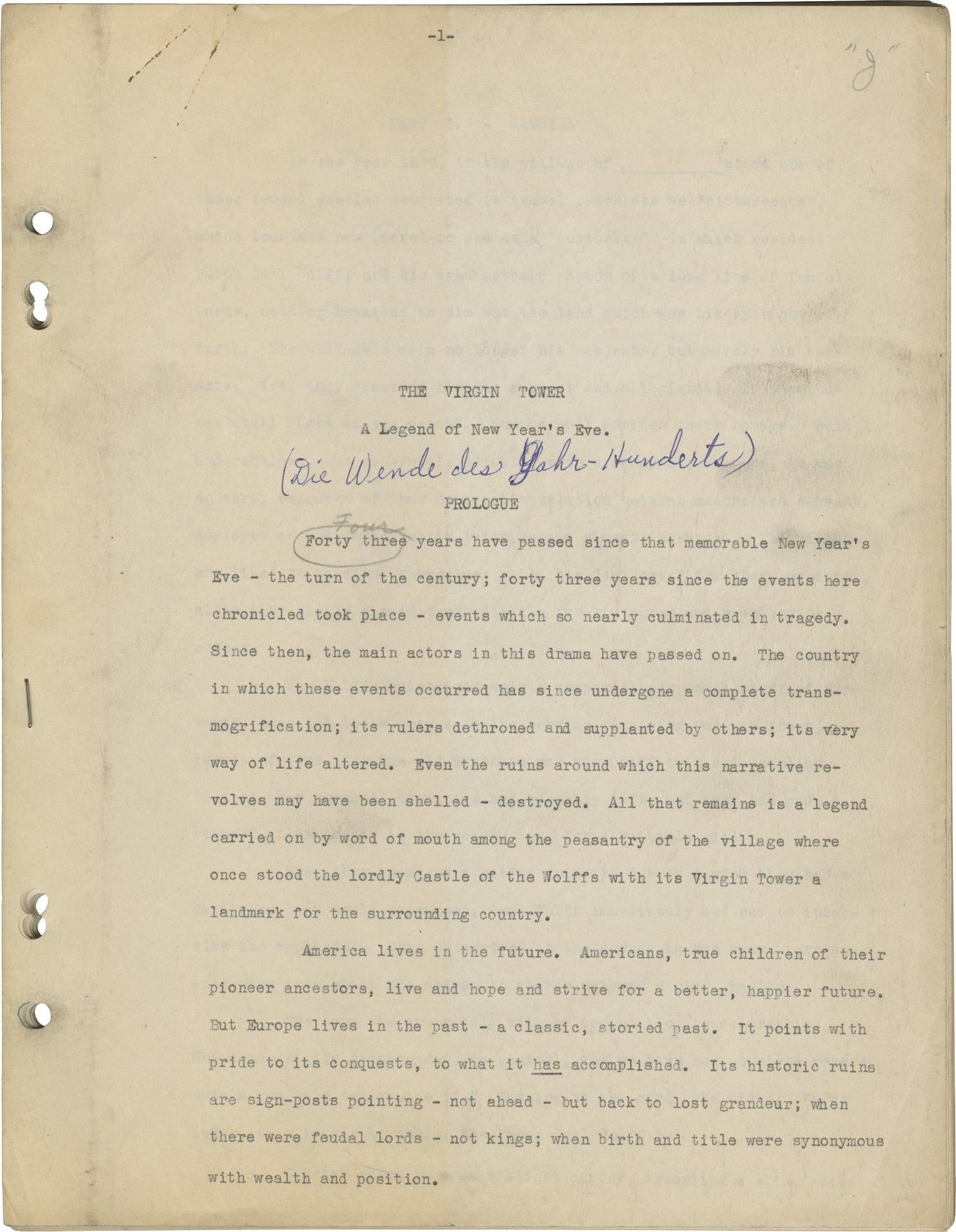 Brown wrappers with red quarter-cloth binding, with a typed label affixed to the front wrapper, noting titles "Were-Wolf" and "Der Jungfernthurm," along with credit for Swem. Typescript, rectos only. Approximately 250 pages. Pages Very Good plus, wrapper Very Good plus, bound with two gold brads.