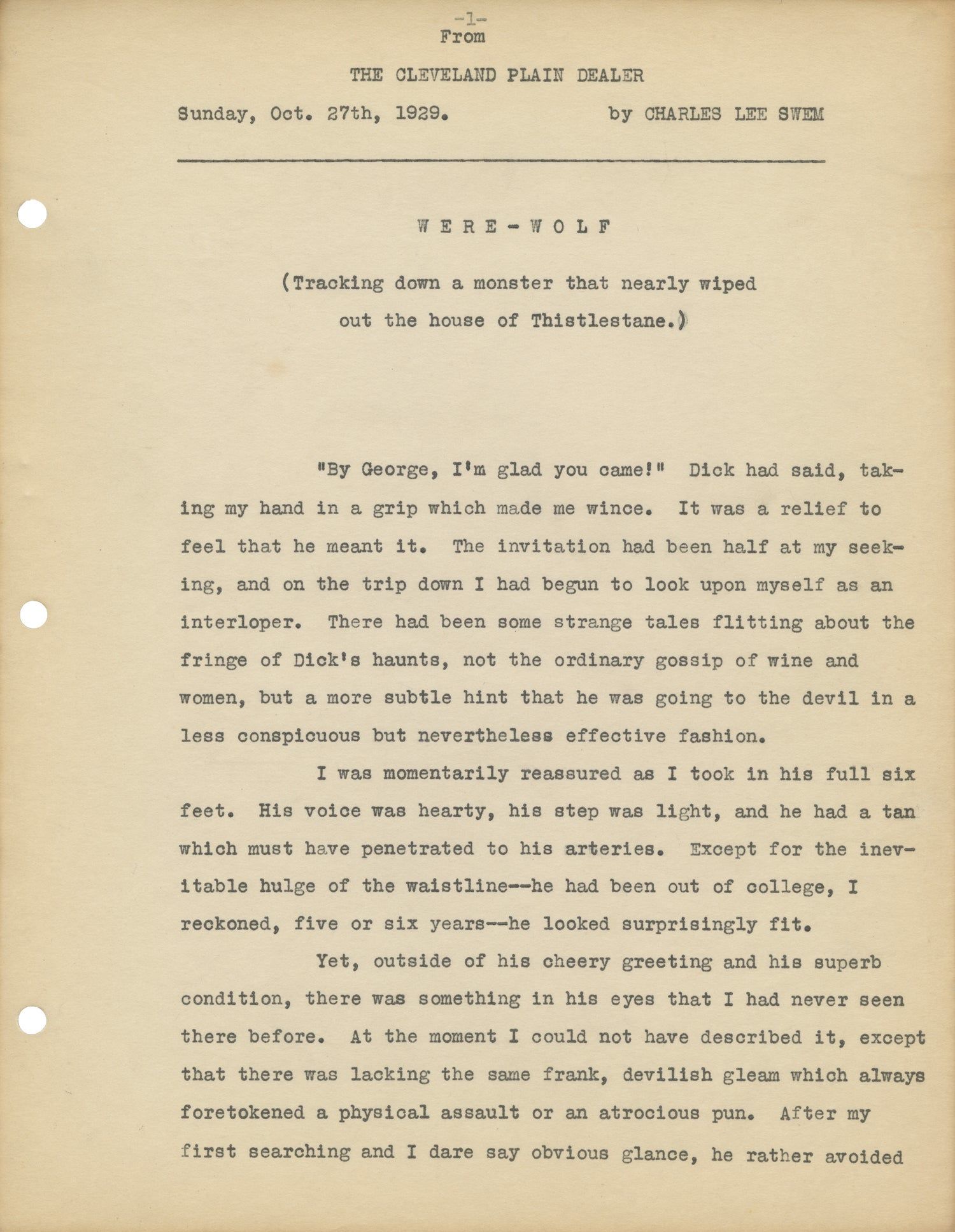 Title page of "Werewolf" mentions "The Cleveland Plain Dealer" and a date of October 27, 1929. Swem's novel appears to have been serialized by the newspaper in 1929 as part of its Fiction and Feature section.