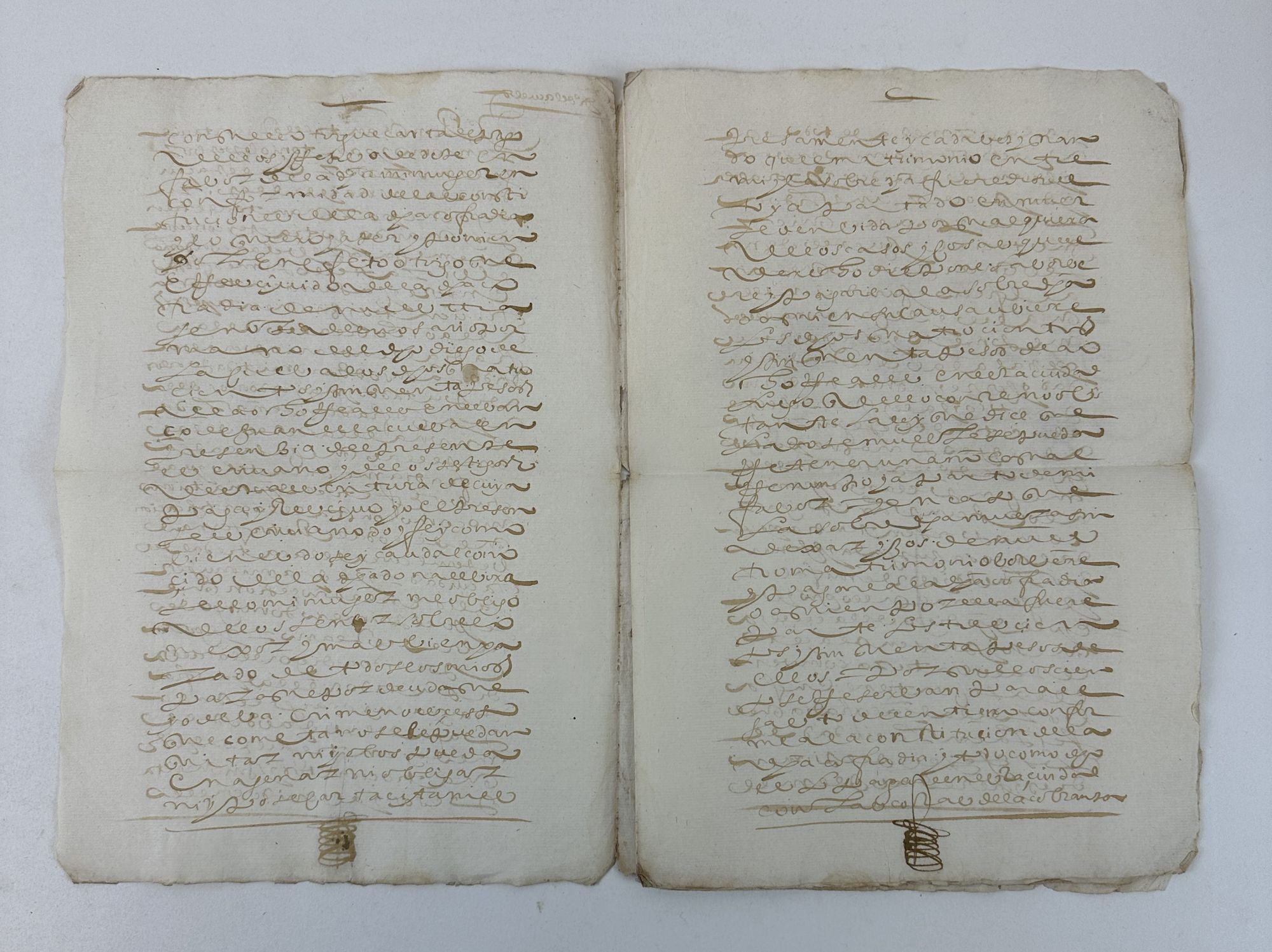 Spain, 1630. Legal Document (w. 8.5 in. x h. 12 in.), 5 pages. A manuscript legal document on vellum, written in letra procesal, dated 1630. In Very Good condition overall with age toning, wear to corners and edges (with a few small tears along edges and creases), and a 3 in. x 3 in. tear to final leaf.