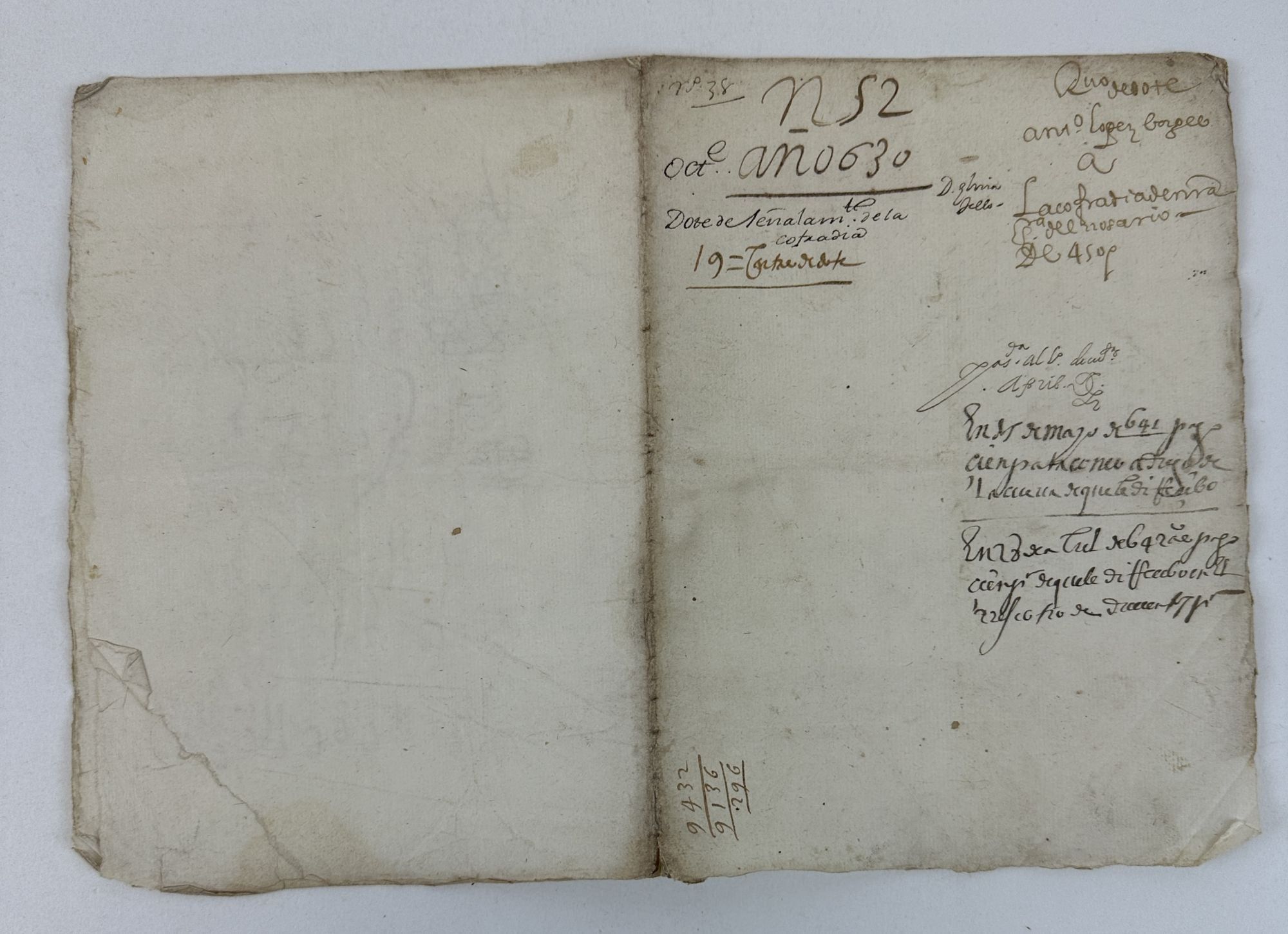 A complete escritura de dote (dowry contract), executed in 1630, between Antonio López Borges[?] and La Cofradía del Rosario, concerning the marriage settlement and dowry of 450 pesos. The document sets out the terms of the marriage, the property and obligations recognized, and the mutual rights and securities accorded to the parties. Extensively signed at the end by the principals and multiple witnesses, with ornate notarial rúbricas. Docketed on the verso as “No. 52, Año 1630” with further notes of registration. RW Consignment. Shelved at Rockville, Room A, General Ephemera Part 2. 1402800. Special Collections.