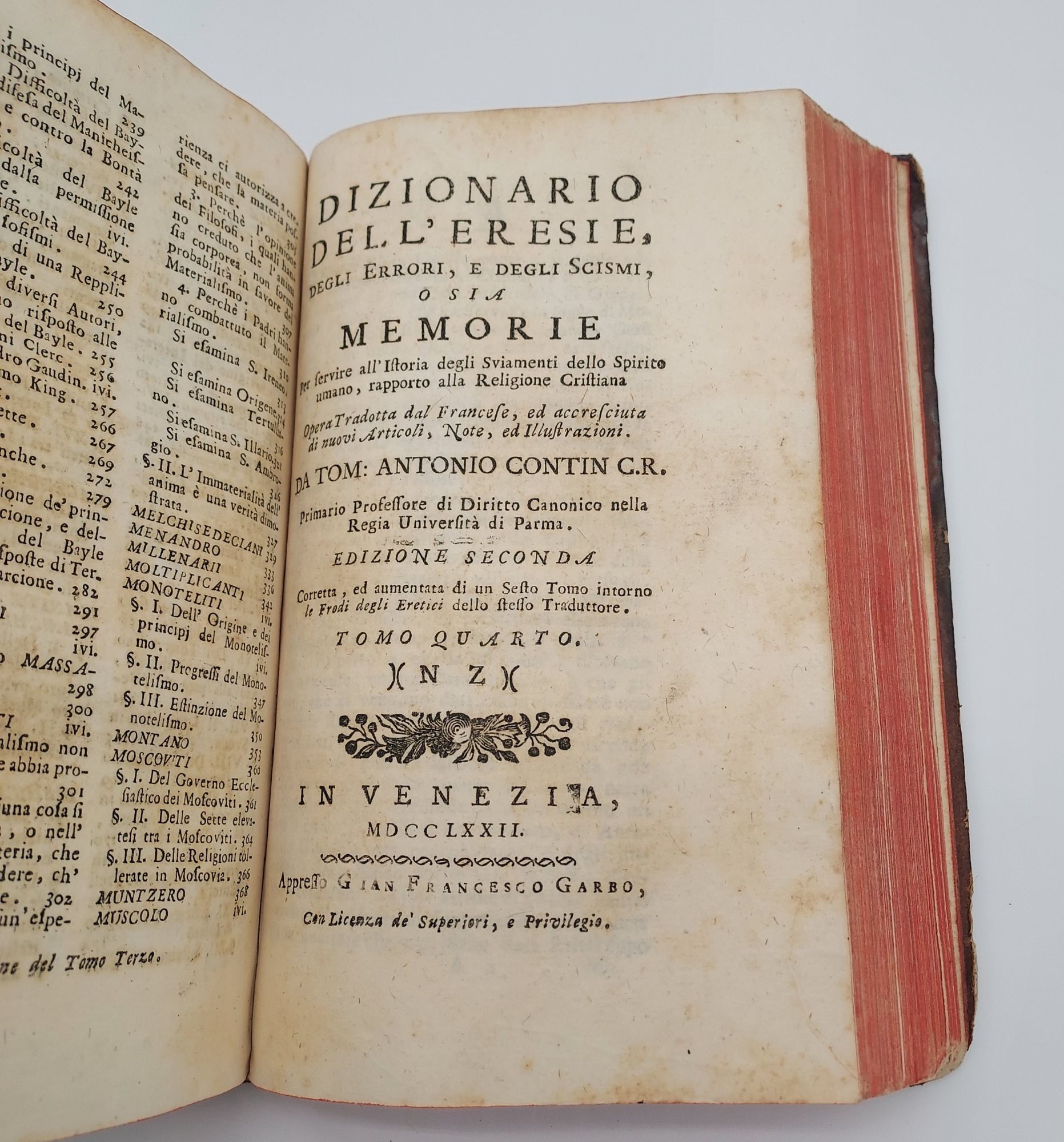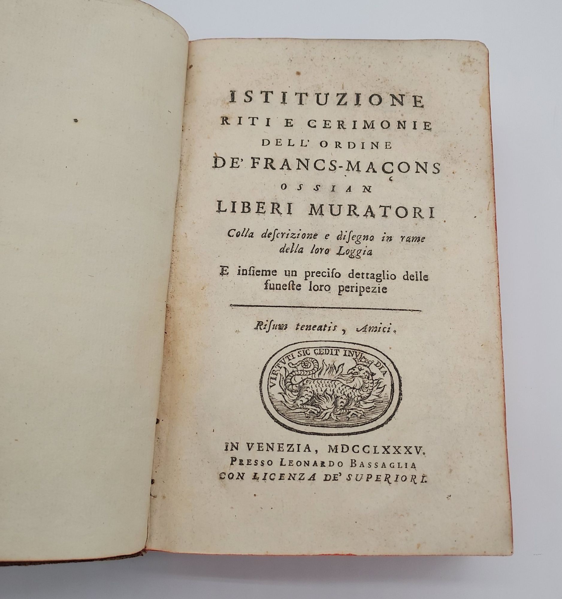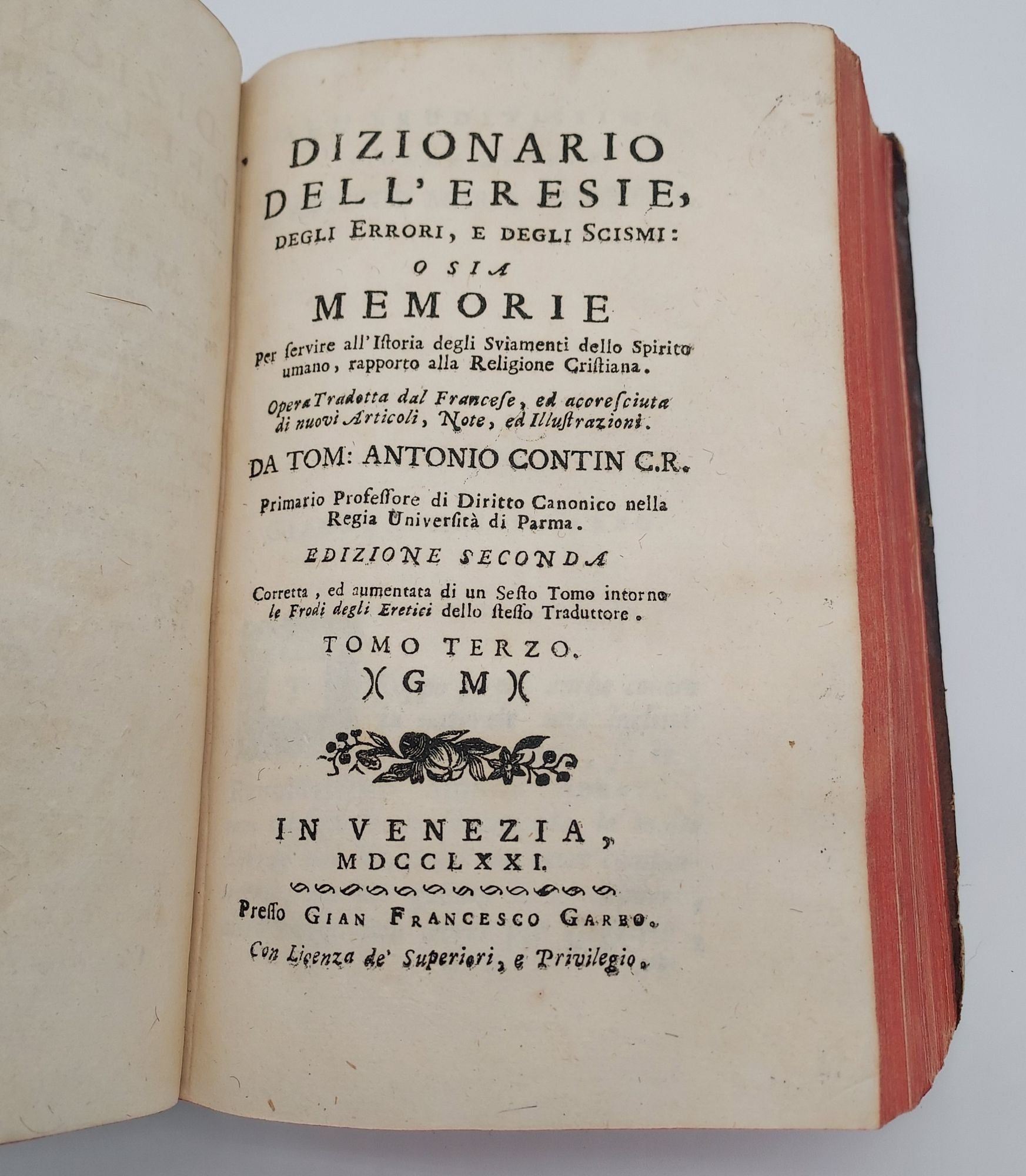 Venezia: Presso Leonardo Bassaglia; Presso Gian Francesco Garbo, 1785. Leather Bound. Very Good. 95; 370; 352pp. Duodecimo [18.5 cm] Mottled leather with gilt stamping on the spine. Publisher's red stain to the text block edges. Marbled endpapers. Some rubbing and chipping to the leather at the extremities. Underlying boards exposed periodically along the edges. Very occasional light foxing to the pages. Small loss from bottom margin corner of p. 117/18 of second work. Regular errors in the printing of page numbers, but no text missing. Italian text. This copy is from the personal library of Kent Walgren, Mormon scholar, bookseller, and author of the definitive bibliography of freemasonry, with his brief markings in pencil on the front free endpaper. Pages exceptionally bright. Opens with a rare work on Freemasonry, written anonymously. Followed by parts 3 and 4 of Pluquet's work on Christian heretics translated by Tomasso Antonio Contin.