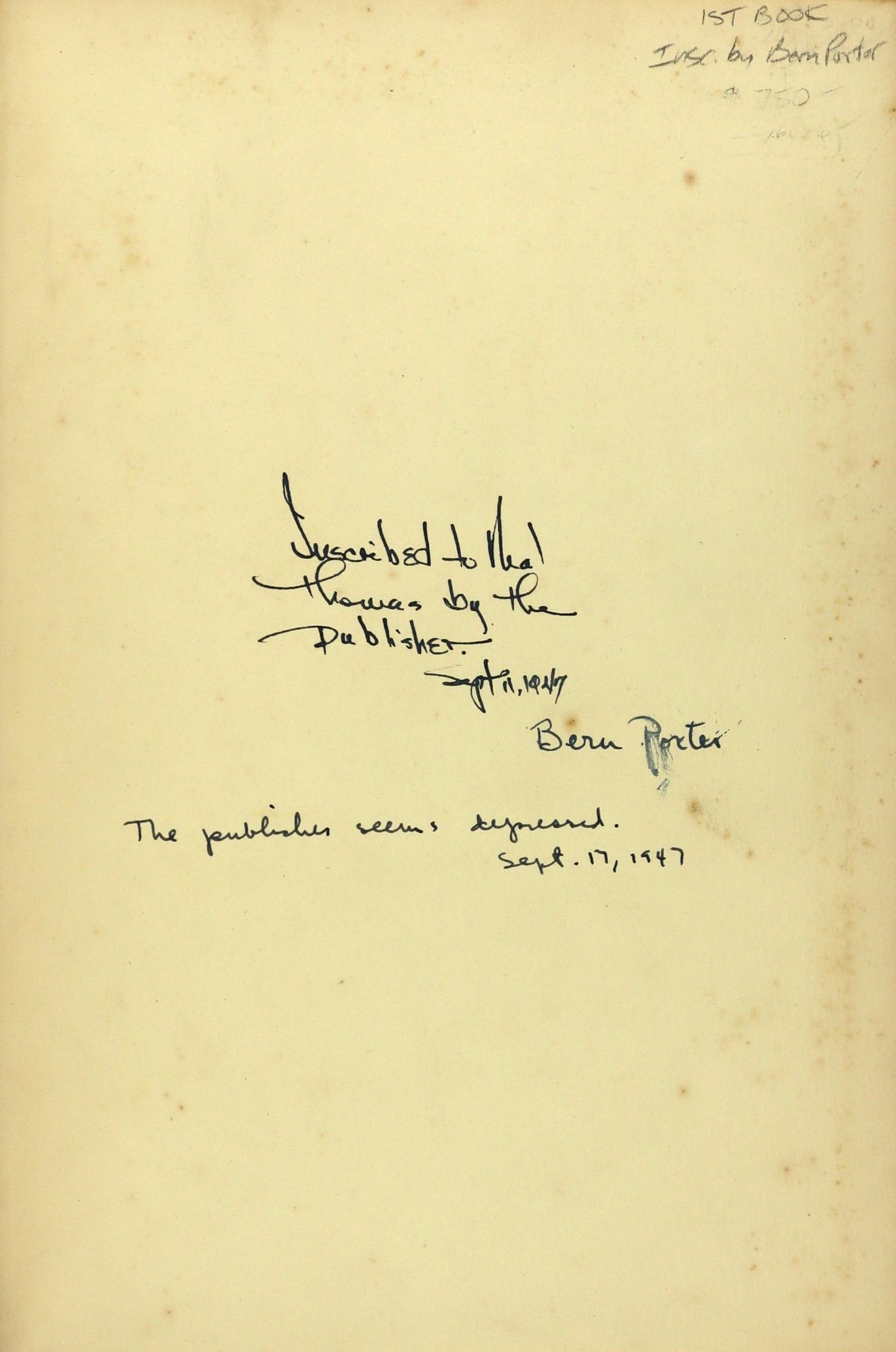 Berkeley, CA: Bern Porter, 1946. Very Good -. Berkeley, CA: Bern Porter, 1946. First Edition. Octavo; original striped boards with red lettering; no dust jacket, presumably as issued; 42pp. Spine backing separated but present, with chips and exposure along joints; fragile though binding remains sound; Porter's address written to rear pastedown, else unmarked. Good to Very Good. Signed by publisher Bern Porter at front free endpaper with inscription, "Inscribed to Neal Thomas by the publisher. Sept 11, 1947. Bern Porter," and in a different hand, "The publisher seems depressed. Sept 17, 1947."