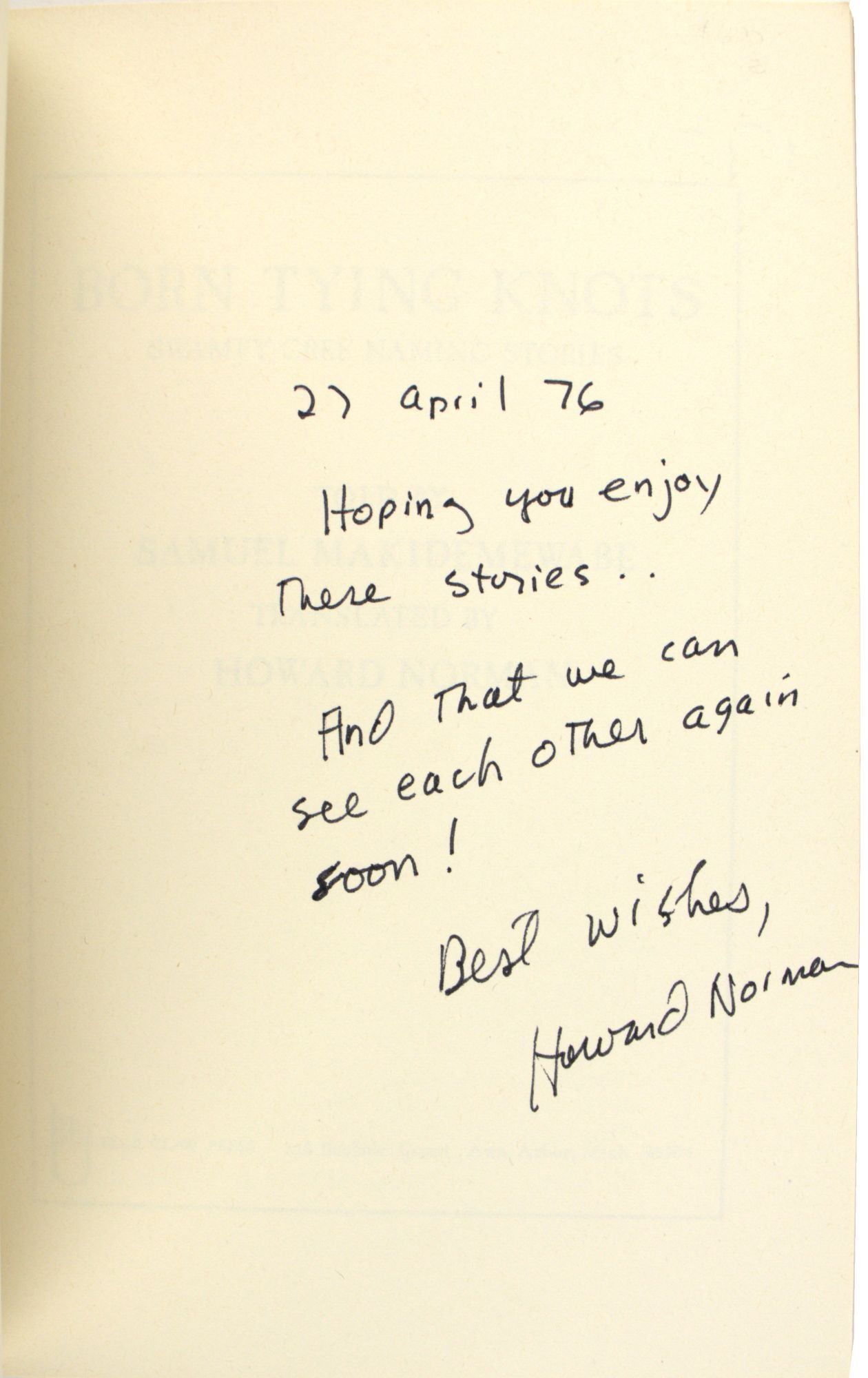 Ann Arbor, MI: Bear Claw Press, 1976. Very Good +. Ann Arbor, MI: Bear Claw Press, 1976. First Edition. Signed by Howard Norman with brief inscription to preliminaries. Octavo; 39pp. Illustrated wraps. Light rubbing to wraps with a few minor scuffs; spine a touch sunned; binding sound and pages unmarked; a Very Good or better copy of Norman's first book, uncommon signed.