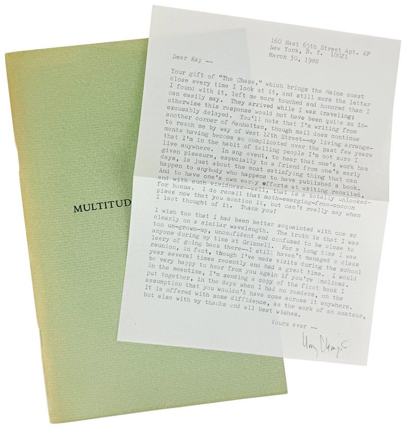 Together with a one-paged typed letter with the same date and recipient, evidently a former Grinnell classmate who had gotten in touch with Clampitt after discovering her latest poetry collection "Archaic Figure" (1987). "[T]o hear that one's work has given pleasure, especially to a friend from one's early days, is just about the most satisfying thing that can happen to anybody who happens to have published a book...I wish too that I had been better acquainted with one so clearly on a similar wavelength. The truth is that I was too un-grown-up, unconfident and confused to be close to anyone during my time at Grinnell." Clampitt then offers Kay a copy of this, her first book, famously not published until the poet was in her fifties.