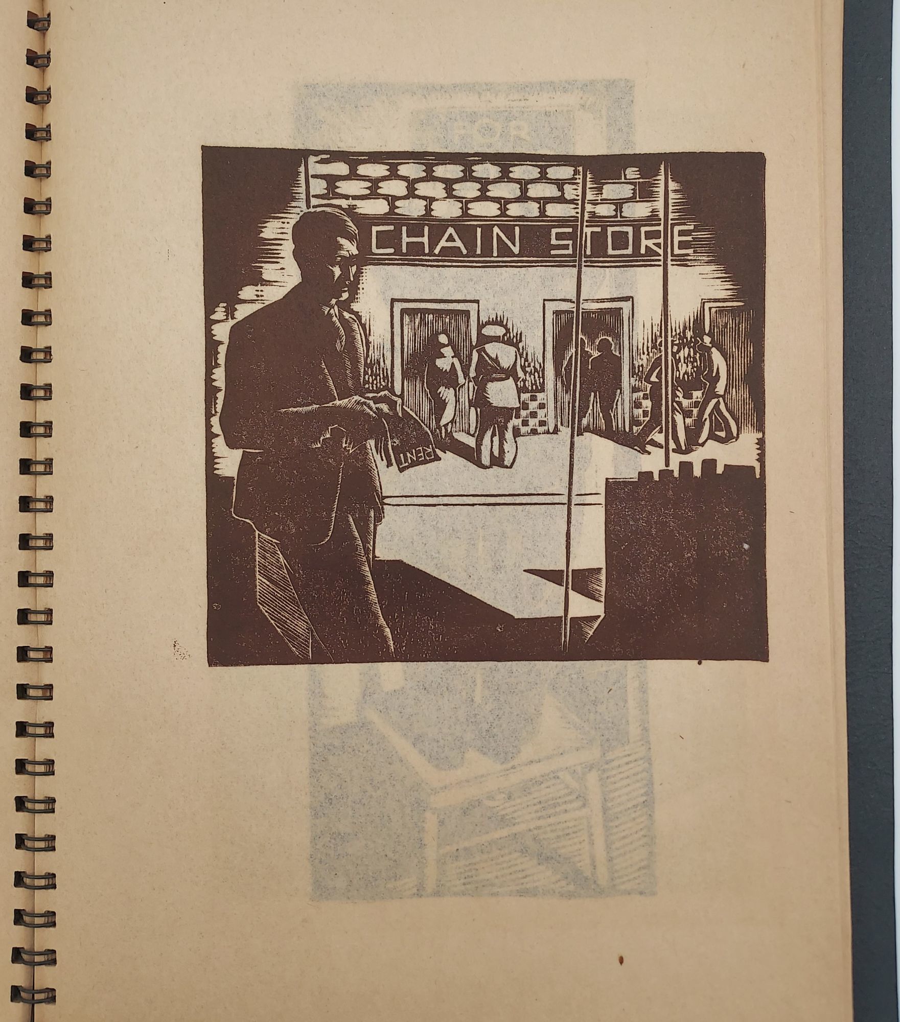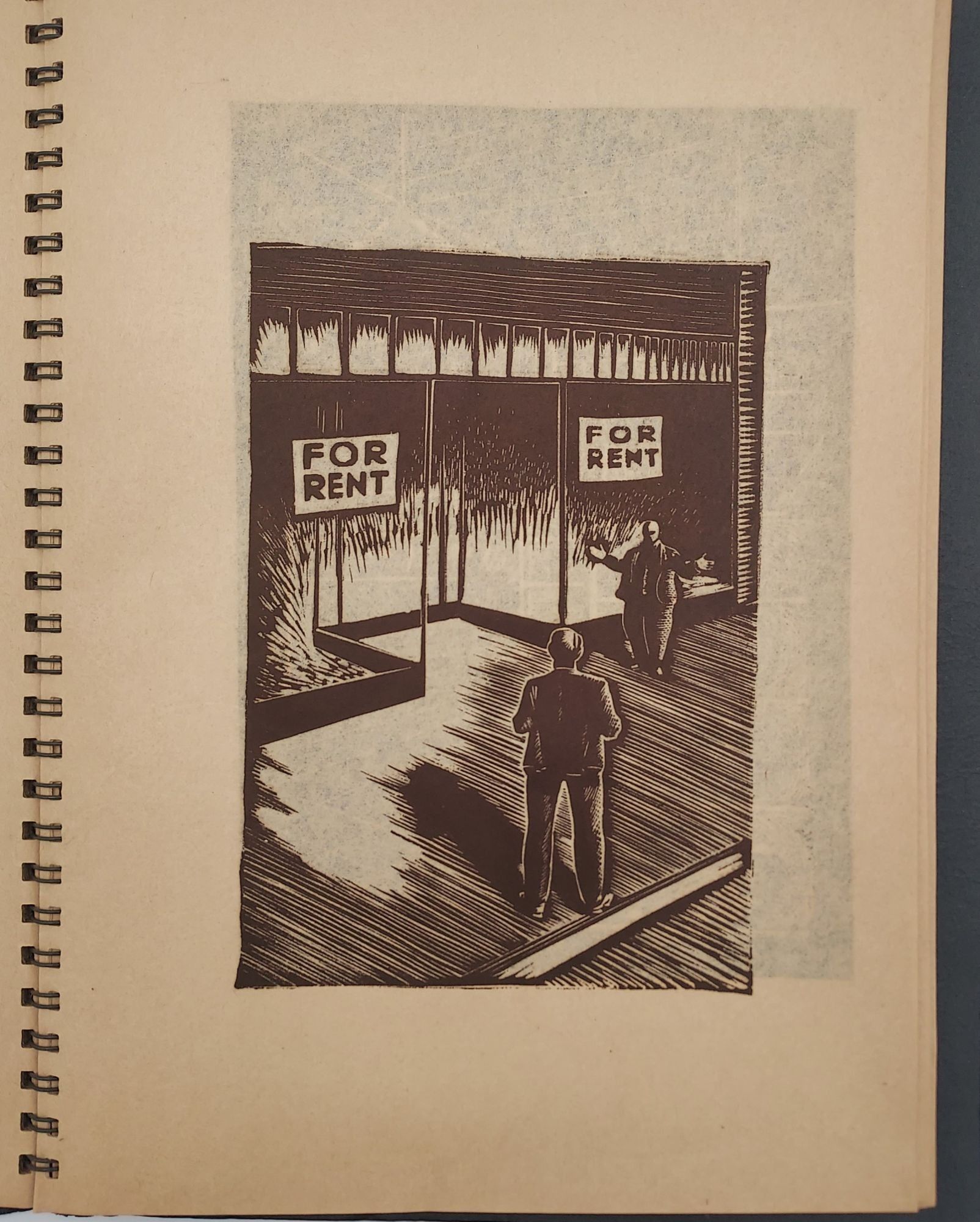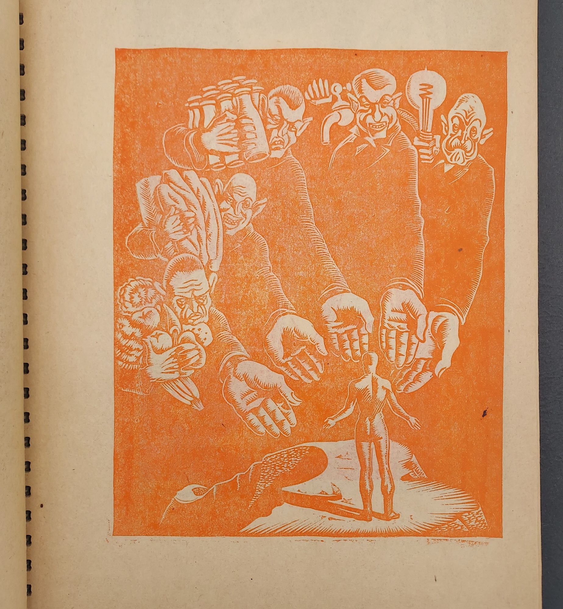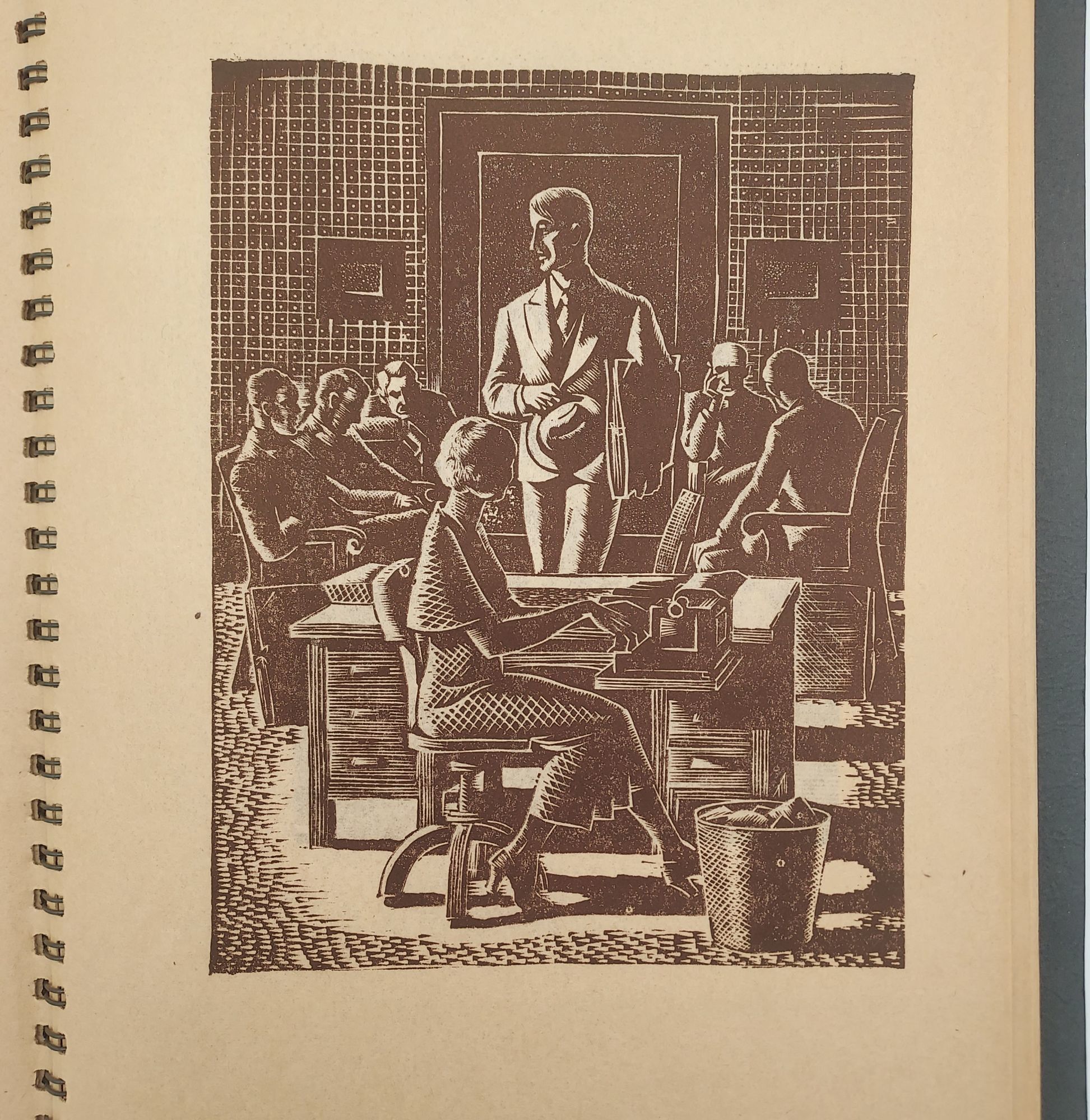[San Francisco, CA], 1940. Second handmade edition. Paperback. Very Good +. Quarto [26.5 cm] in textured black wraps with the image of the man with the "white collar" printed in white on front wrap. Metal comb binding. The leaves are of a fine thin paper tissue. Covers professionally and very expertly reattached. Corners of wraps and spine ends skillfully restored. Very subtle discoloration to the top and bottom edges of the inside of the wraps. In a custom thin card tuxedo box. No afterword by John L. Lewis. It was likely excised, as some considered his style of running the United Mine Workers of America to be a bit dictatorial. A chronicle of the aftermath of the 1929 stock market crash. The second of two editions hand-made and assembled by Patri. Contains a page with the simple orange linocut stating: "Second Edition". This page precedes a page reading "A Home Made Book". With an introduction by Rockwell Kent. The linocuts differ from the first published edition in that they are here printed in brown and orange, not black and gray. Very rare.