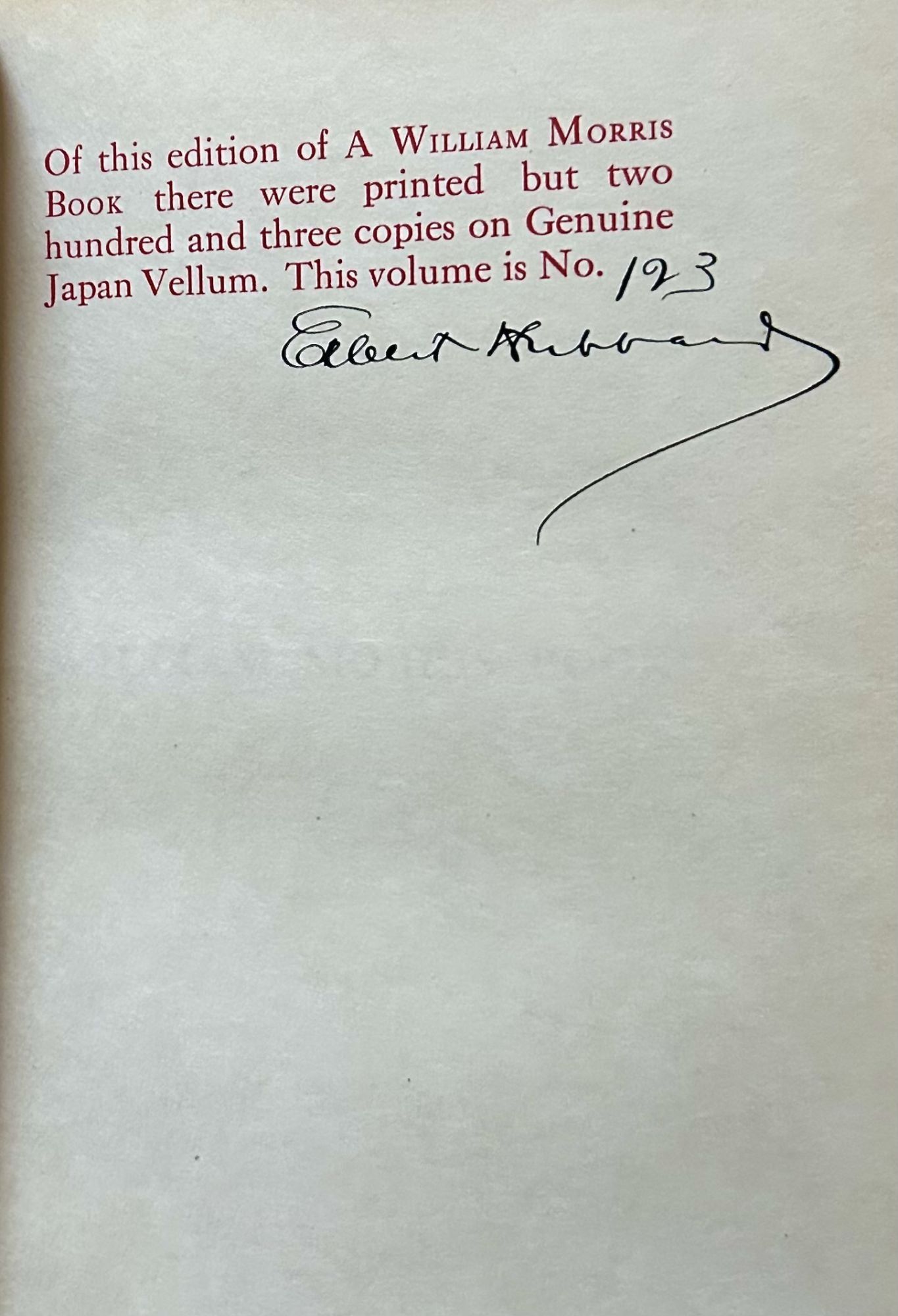 East Aurora: The Roycrofters, 1907. First edition. Hardcover. Three quarter brown morocco, marbled boards with matching endpapers. Teg. Fine. 65 pages. 20 x 13.5 cm. Limited edition, copy 123 of 200 signed by Elbert Hubbard in black ink and printed on Japan Vellum. An as new copy printed in red and black. Two photogravure portraits of William Morris with tissue guards, one a frontispiece. Series of letters between Morris and Robert Thomas both of whom were interested in the Socialist movement of the time. Raised bands, spine panels richly gilt in Art Nouveau motifs. In the deluxe binding.
