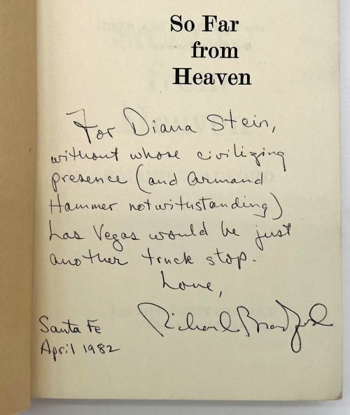 Inscription reads, "For ----, without whose civilizing presence (and Armand Hammer notwithstanding) Las Vegas would be just another truck stop. Love, Richard Bradford