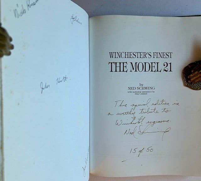 Iola, WI: Krause Publications, 1990. Leatherette. Very Good +. THE UNCOMMON, "SPECIAL" SIGNED/LIMITED EDITION. #15 OF ONLY 50 COPIES SIGNED BY THE AUTHOR NED SCHWING (IN THIS CASE WARMLY INSCRIBED BY HIM) AND ALSO INCLUDING THE SIGNATURES OF 5 OF THE WINCHESTER ENGRAVERS NED SCHWING CELEBRATES IN THIS BOOK. AND FINALLY, ORIGINAL PHOTOGRAPHS OF THOSE 5 HONORED ENGRAVERS (NICK KUSMIT, JOE CROWLEY, PAULINE MUERRLE, JOHN KUSMIT AND JASPER SALERNO) NEATLY AFFIXED TO THE FRONT PASTEDOWN. A solid, sharp copy to boot. Tight and VG+ (light spotting at the endpapers and pastedowns) in its light-brown leatherette, with a bright mounted photograph of the Winchester 21 to the front cover. Quarto, crisp black-and-white (and a small number of color) photos throughout. With technical assistance by Don Criswell.