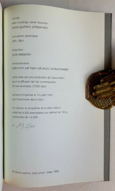 art & art, 1992. Original wraps. Near Fine. The 1992 1st edition of this beguiling artist's book by Steven Parrino (1958-2005, American artist and noise musician). #143 of 500 copies issued. Clean and Near Fine to Fine in its slate-gray wrappers. #5 in the "l'album" series, issued by the publisher Art & Art. Text (in both English and French) by Punk poet and provacateur Lydia Lunch.