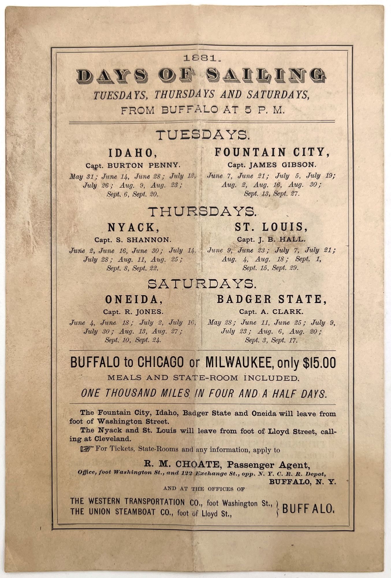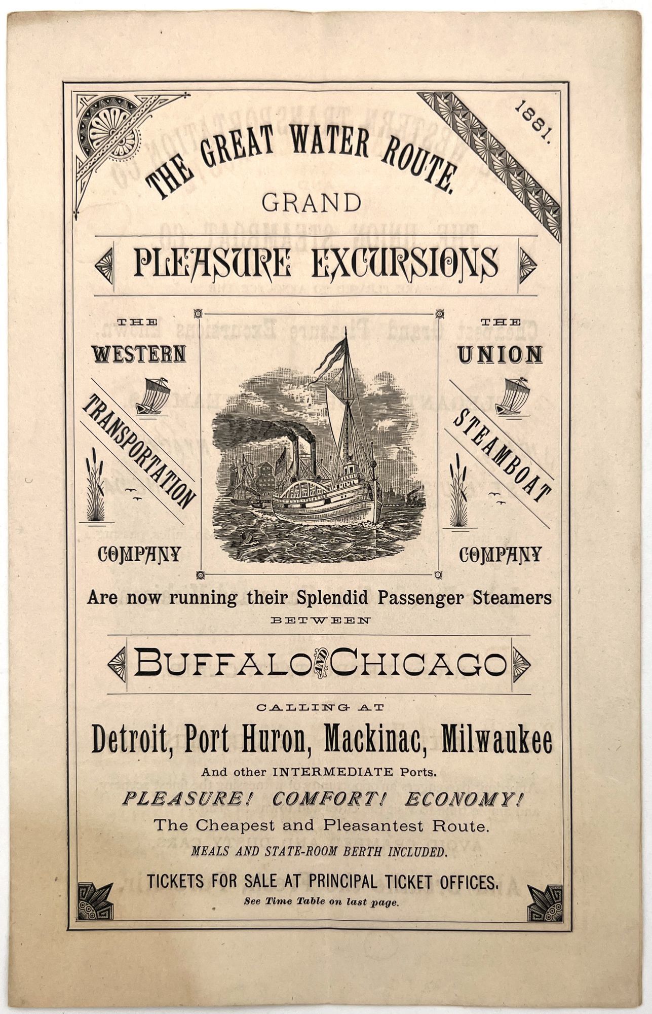 N.pl: Western Transportation Co. and the Union Steamboat Co, 1881. Very good. Toned, a little dust soiled or stained on last page, central crease.. Printed advertisement from the Western Transportation Co. and the Union Steamboat Co., announcing their new pleasure excursions between Buffalo and Chicago in 1881. Includes a list of the "elegant passenger steamers" including the Idaho, Fountain City, Nyack, St. Louis, Badger State, and Oneida. Promotes it as preferable to the "cramped and dusty cars" of the railroad as a means of travel, and lauds the steamers' elegant fittings and affordable pricing. Includes inside an image of Mackinac Island, Michigan, and on the front an image of a steamer. Illustrated bifolium (8.75" by 6").