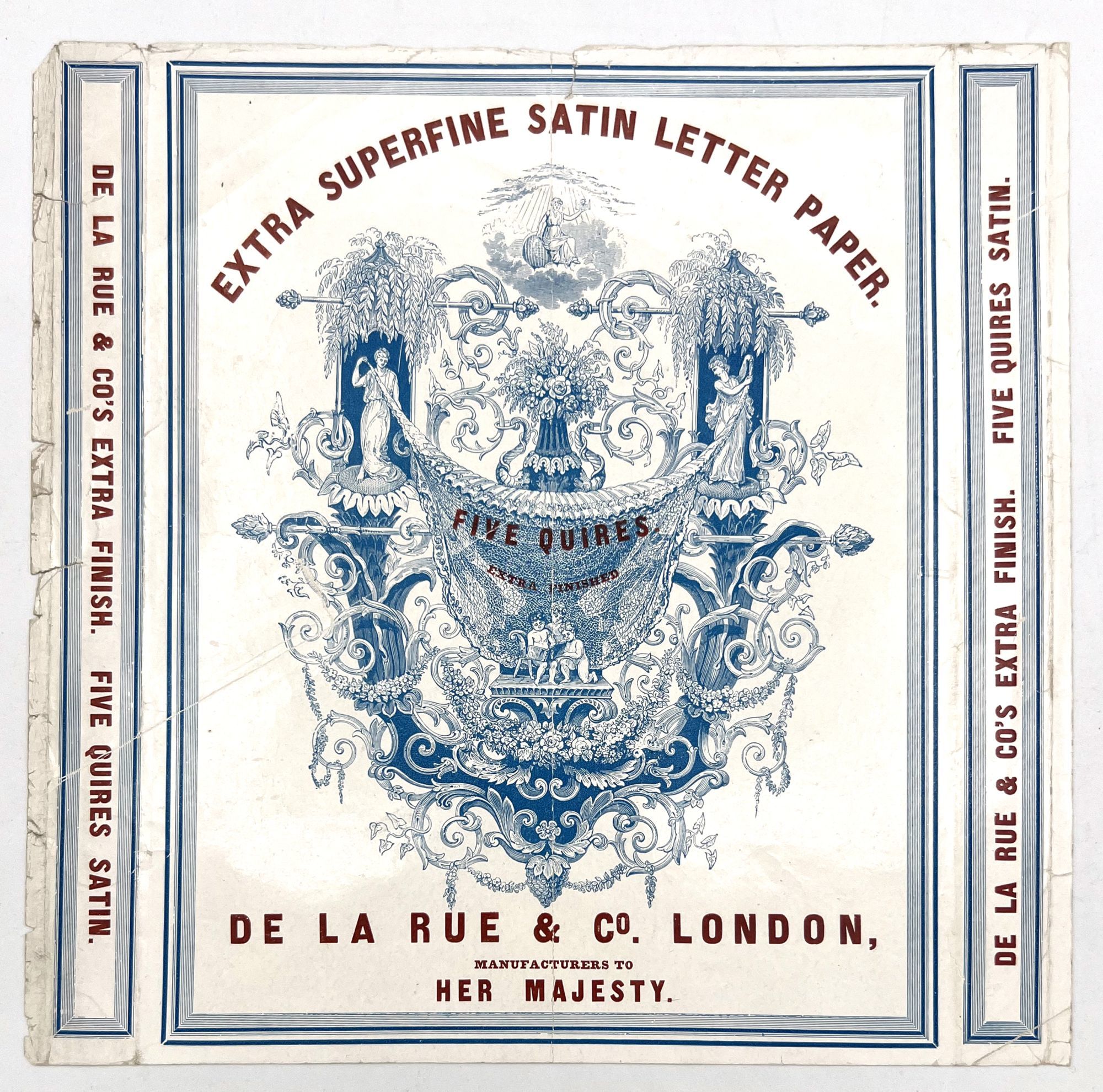London, England: De La Rue & Co, 1850. Very good. Light dust soiling, chipping and edge wear.. A handsome ream wrapper produced for De La Rue & Co. of London, "Manufacturers to Her Majesty". Labeled "Five Quires" of "Extra Superfine Satin letter Paper", and printed in blue and red. The central illustration includes figures in classical dress and floral garlands and flourishes. De La Rue & Company also produced games, including card games and cribbage boards. Measures approx. 8.75" by 9", verso blank. Lithographed in red and blue, coated paper.