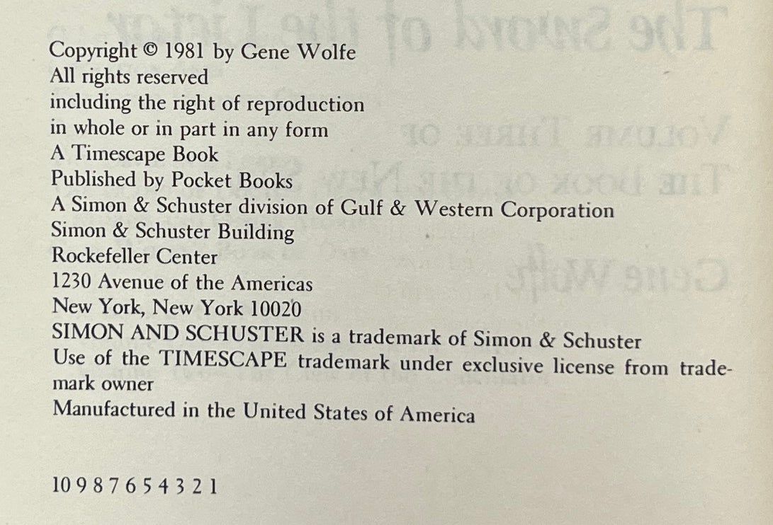 New York: Timescape Books, 1983. First Edition. Hardcover. Near Fine/Near Fine. Near Fine in a Near Fine jacket, unclipped ($15.50), some rubbing at the back panel. Quarter brown cloth with blue paper on the boards. Square and firmly bound, remaindered at the bottom edge, clean internally. The third novel in Wolfe's The Book of the New Sun tetralogy.