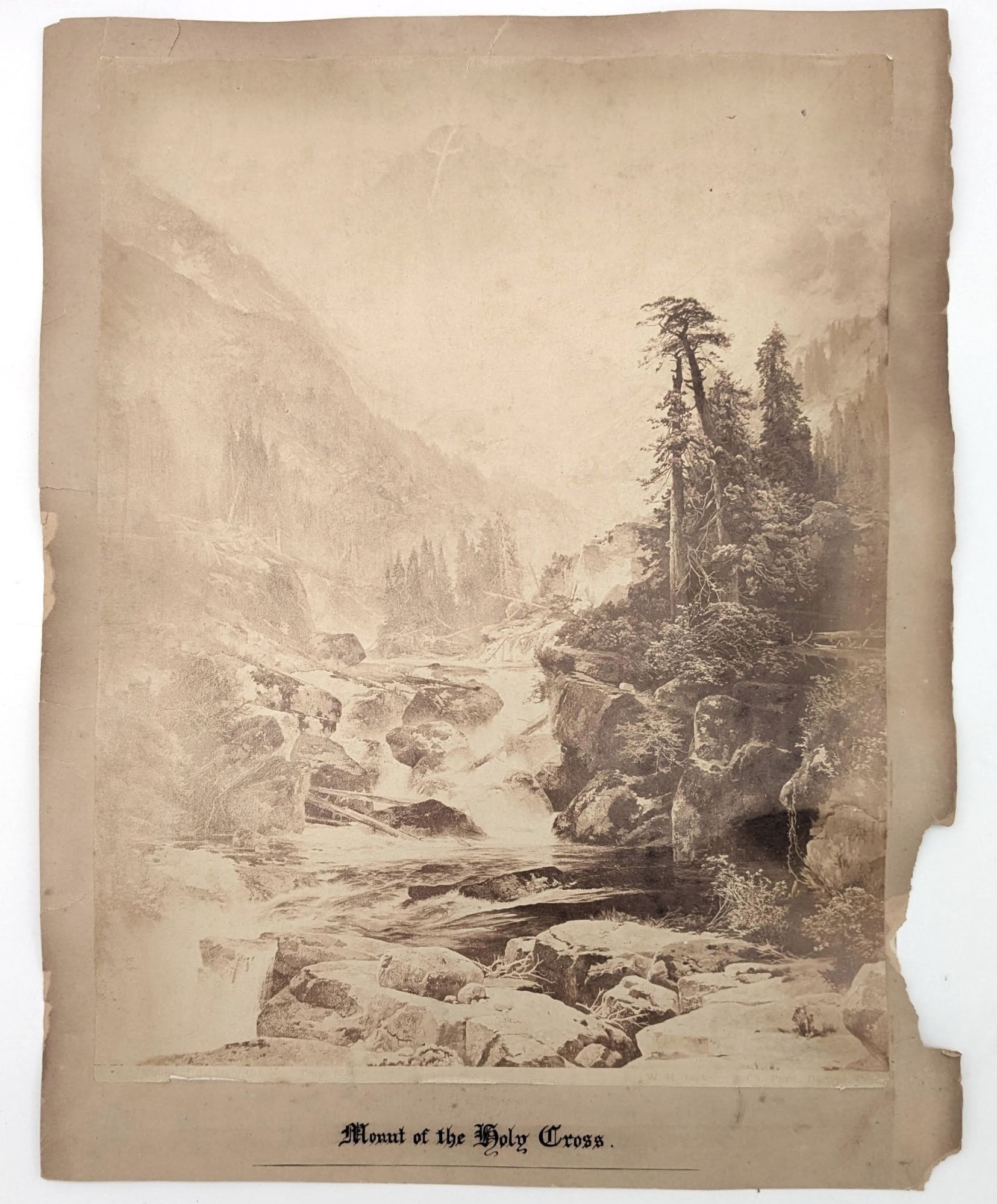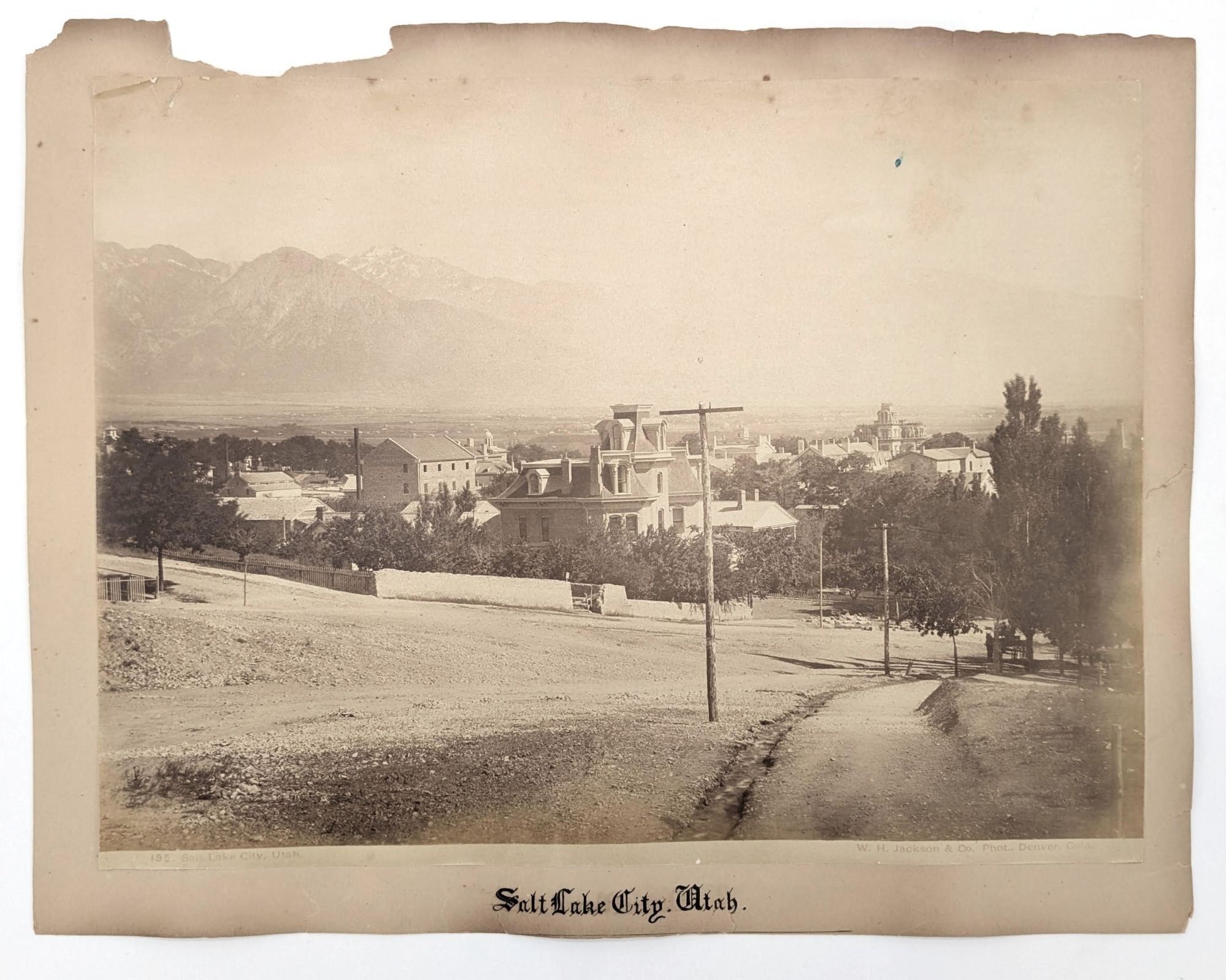 Denver, Colorado: W. H. Jackson & Co, 1880. Photograph. Very Good. Two large format photographs, one mounted to each side of a sheet of thin card stock [15" x 11 ½"]. "Salt Lake City, Utah" is 13" wide by 10" tall. "Mount of the Holy Cross" measures 13" tall by 10" wide. Condition is about Very Good. The mount is a bit worn, and has a loss from one of the margins measuring 3" x 1". The Mount of the Holy Cross image shows light edge wear, and the Salt Lake City photograph has two short closed tears along the top edge. Some light sporadic age toning and fading. William Henry Jackson was the first photographer to capture Colorado's Mount of the Holy Cross, in turn providing actual proof of its existence. The photograph of downtown Salt Lake City is taken from a hill near the lower Avenues / City Creek area, and looks south and east across the horizon. The Beehive House and the Gardo House can be seen in the middle ground distance.