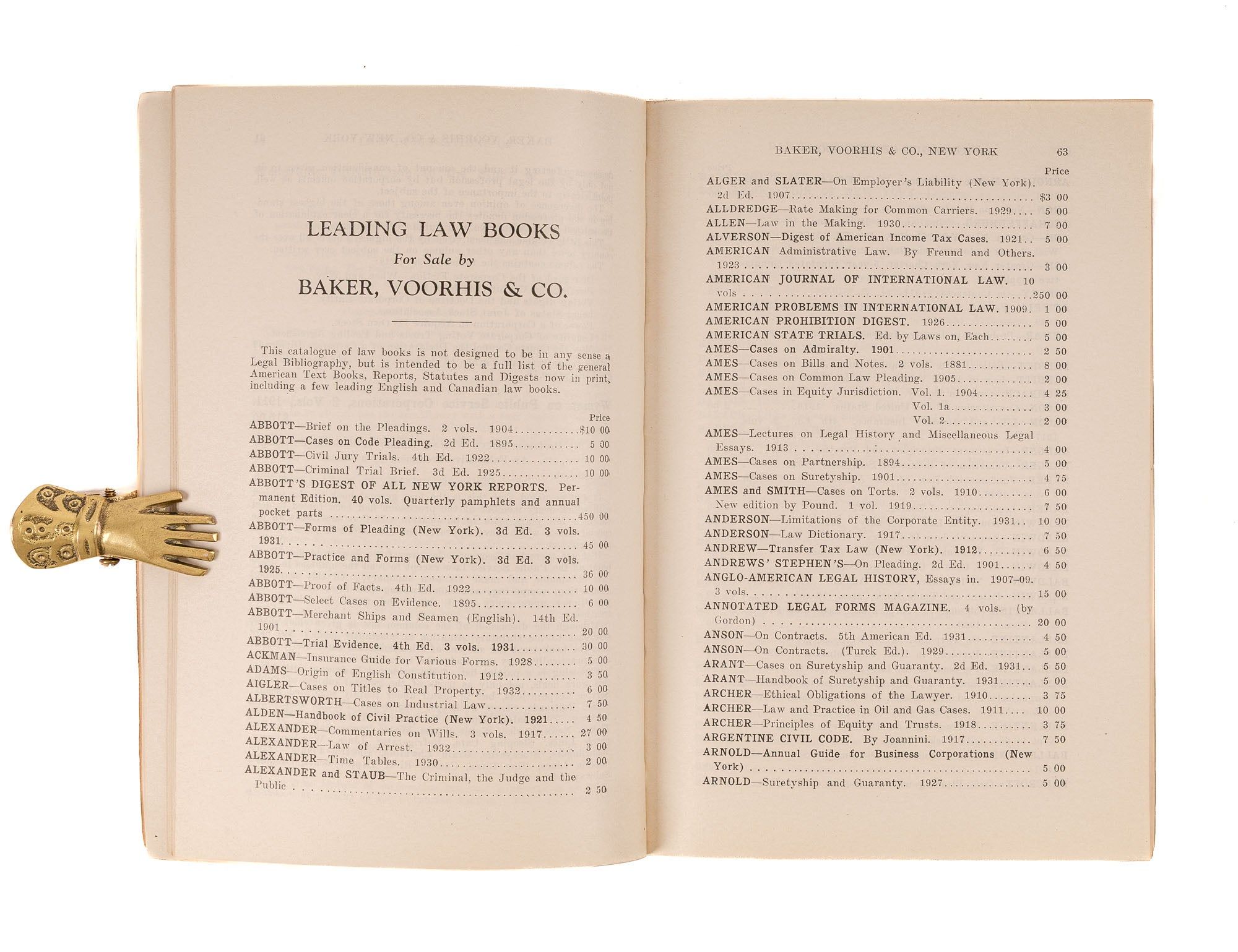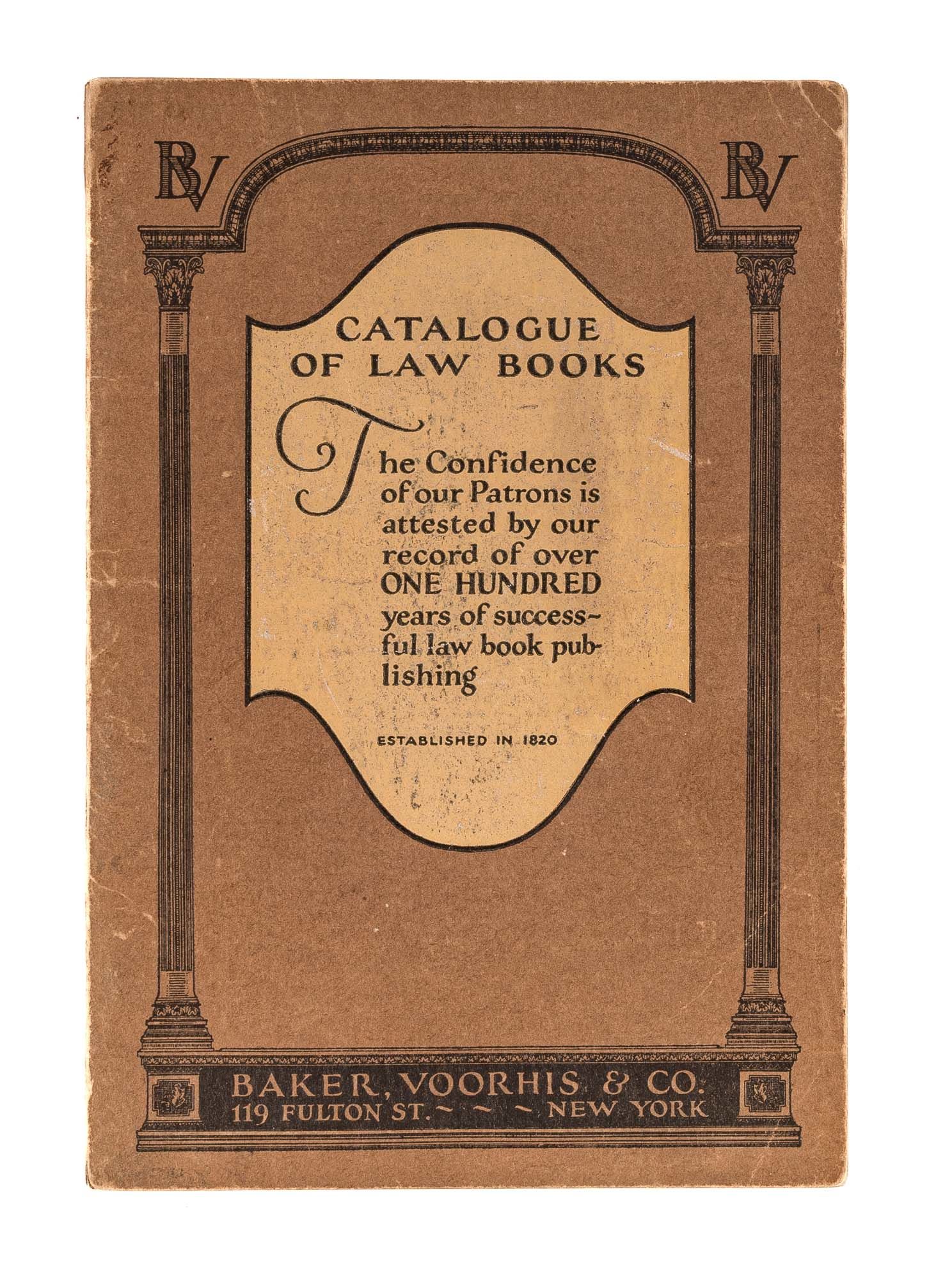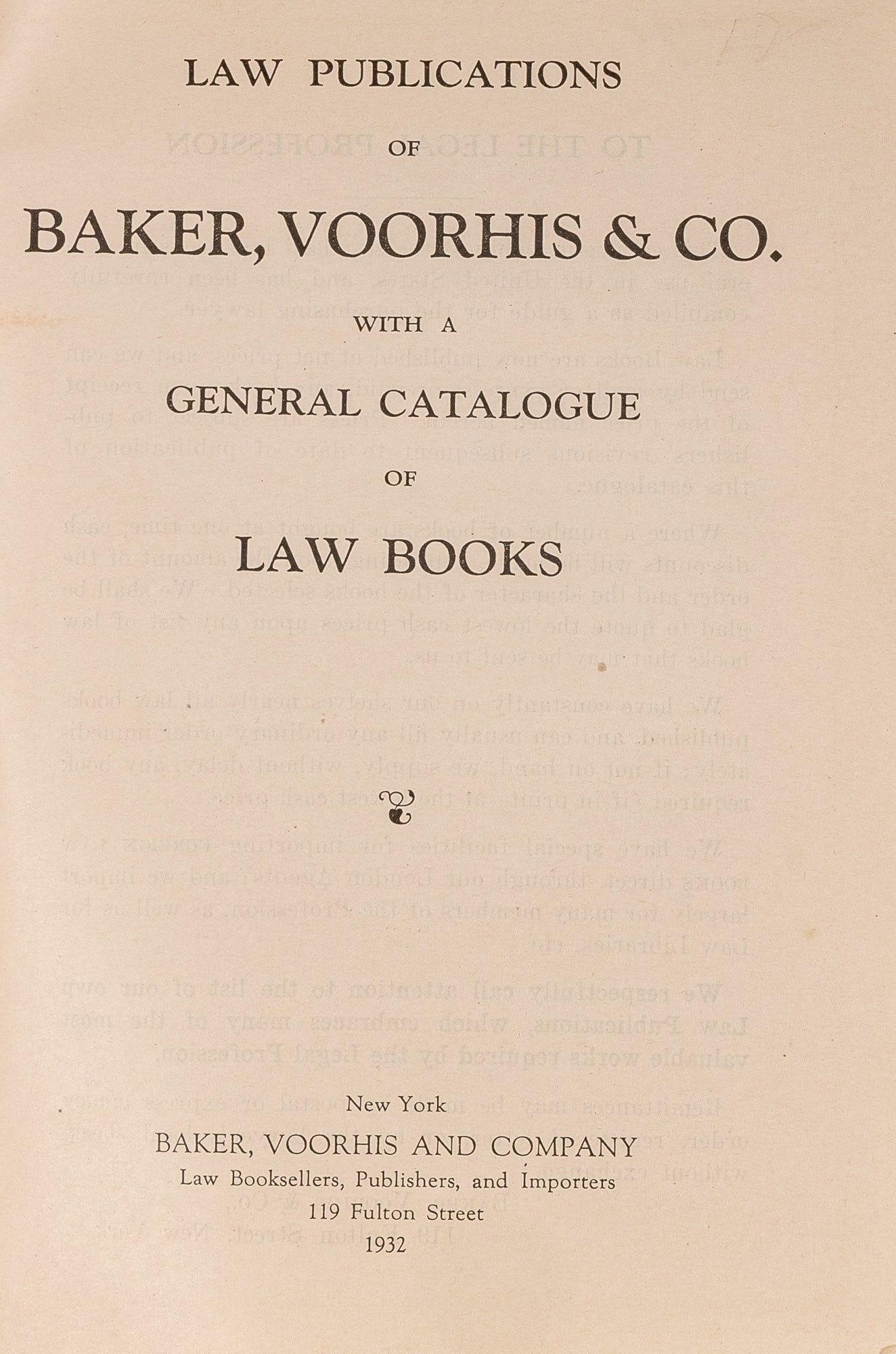 1932. New York: Baker, Voorhis and Co., 1932. 177 pp.. New York: Baker, Voorhis and Co., 1932. 177 pp. An Interesting Window into American Legal Publishing and Marketing in the 1930s Baker, Voorhis & Co. Law Publications of Baker, Voorhis & Co. with a General Catalogue of Law Books. New York: Baker, Voorhis and Co., 1932. 177 pp. 7-1/2" x 5-1/8" (19 cm x 13 cm). Original printed stiff wrappers, light wear [with] a one page typed letter from Abbott Digest Publishing Co., Rochester, N.Y., dated Dec. 19, 1934 promoting the sale of Abbott's N.Y. Digest Consolidated Edition. Very good. $150. * A scarce piece of legal publishing ephemera. "This catalogue embraces the standard law books in general use in the United States, and has been carefully compiled as a guide for the purchasing lawyer." Divided into three sections the first being the General List of Publications of the Baker, Voorhis Co., providing authors, titles, prices, along with substantial descriptions, which comprise the first 61 pages, followed by a General Catalogue of Law Books: Text Books, Etc, in this section with just the author, title, edition, publication date, and price, on pages 62 to 119. The final section covers American Statutes, Digests, Reports, Etc. as of October, 1, 1932 on pages 119 to 152; followed by an Index of Subjects on pages 153 to 177. They note that "as many of the Reports are out of print, prices are not given in this list, but will be promptly furnished upon request.