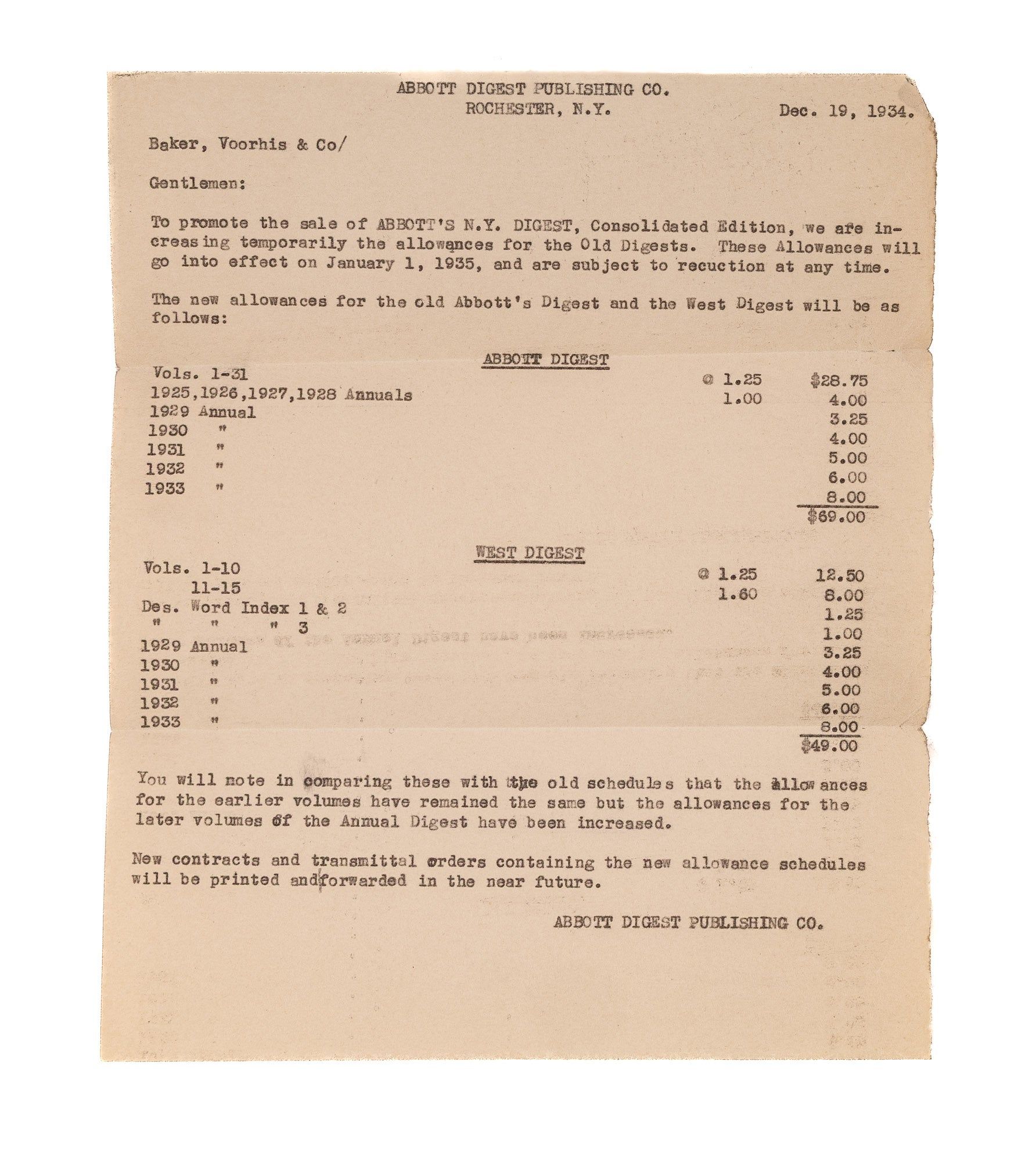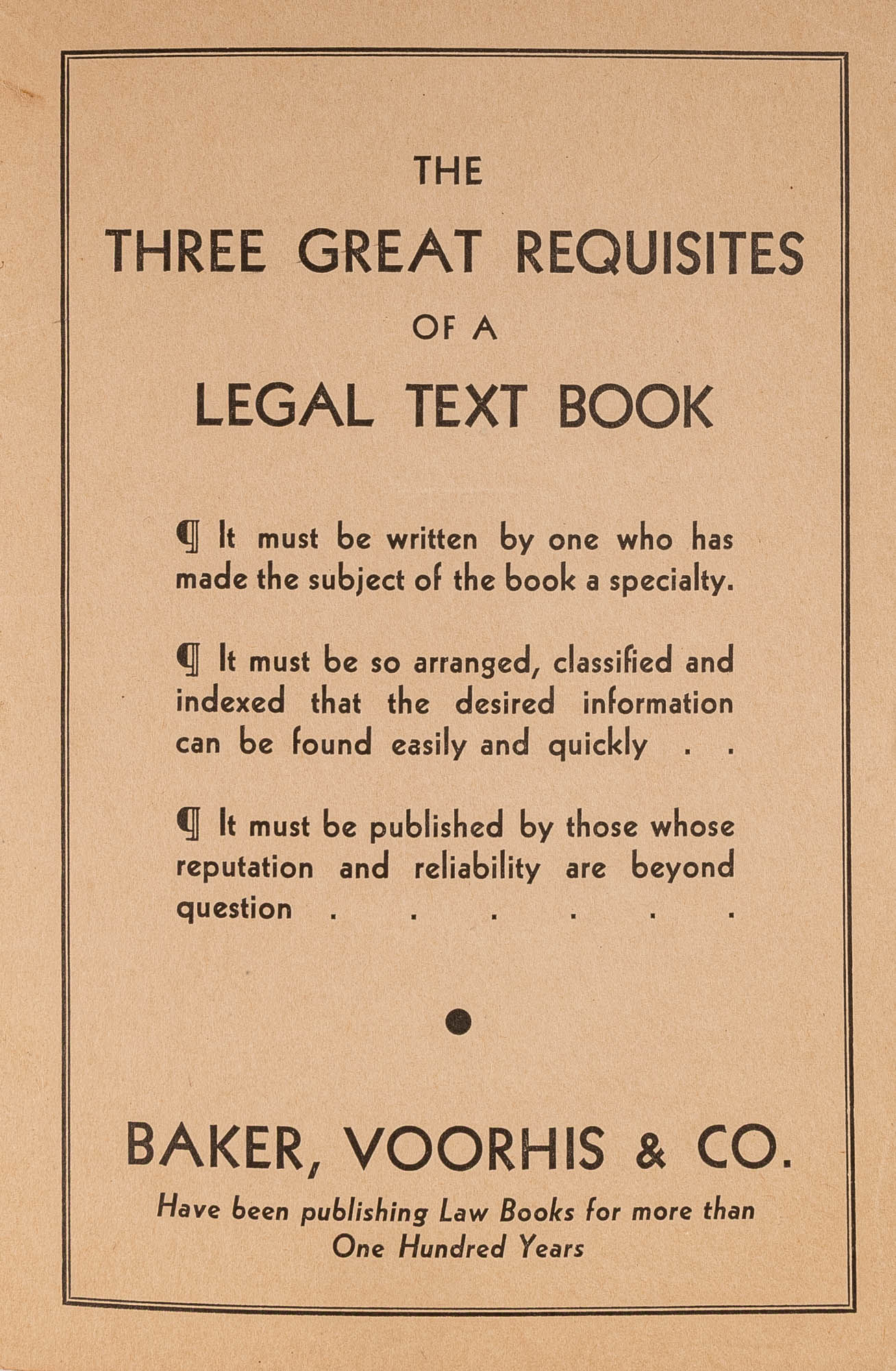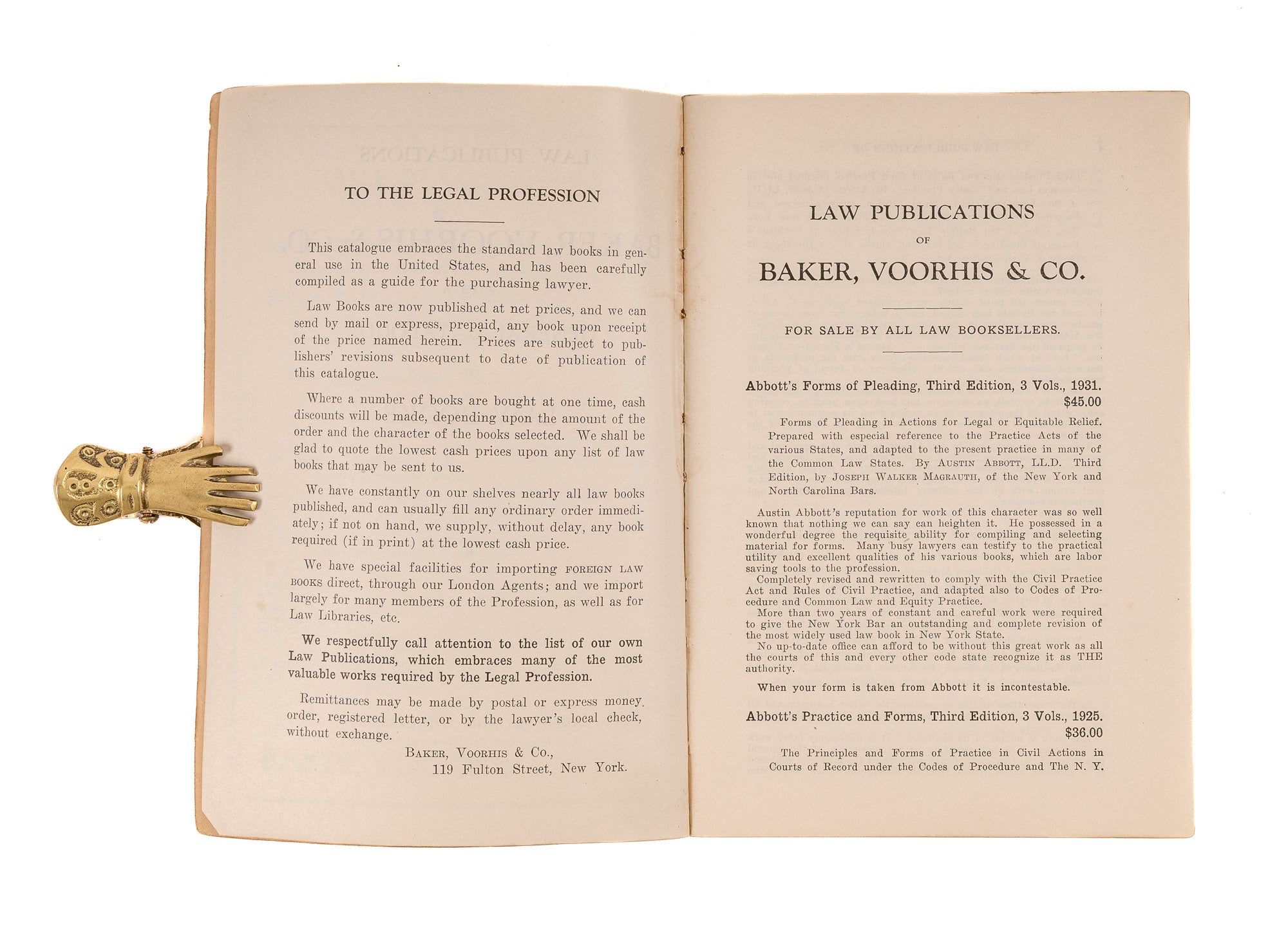 1932. New York: Baker, Voorhis and Co., 1932. 177 pp.. New York: Baker, Voorhis and Co., 1932. 177 pp. An Interesting Window into American Legal Publishing and Marketing in the 1930s Baker, Voorhis & Co. Law Publications of Baker, Voorhis & Co. with a General Catalogue of Law Books. New York: Baker, Voorhis and Co., 1932. 177 pp. 7-1/2" x 5-1/8" (19 cm x 13 cm). Original printed stiff wrappers, light wear [with] a one page typed letter from Abbott Digest Publishing Co., Rochester, N.Y., dated Dec. 19, 1934 promoting the sale of Abbott's N.Y. Digest Consolidated Edition. Very good. $150. * A scarce piece of legal publishing ephemera. "This catalogue embraces the standard law books in general use in the United States, and has been carefully compiled as a guide for the purchasing lawyer." Divided into three sections the first being the General List of Publications of the Baker, Voorhis Co., providing authors, titles, prices, along with substantial descriptions, which comprise the first 61 pages, followed by a General Catalogue of Law Books: Text Books, Etc, in this section with just the author, title, edition, publication date, and price, on pages 62 to 119. The final section covers American Statutes, Digests, Reports, Etc. as of October, 1, 1932 on pages 119 to 152; followed by an Index of Subjects on pages 153 to 177. They note that "as many of the Reports are out of print, prices are not given in this list, but will be promptly furnished upon request.