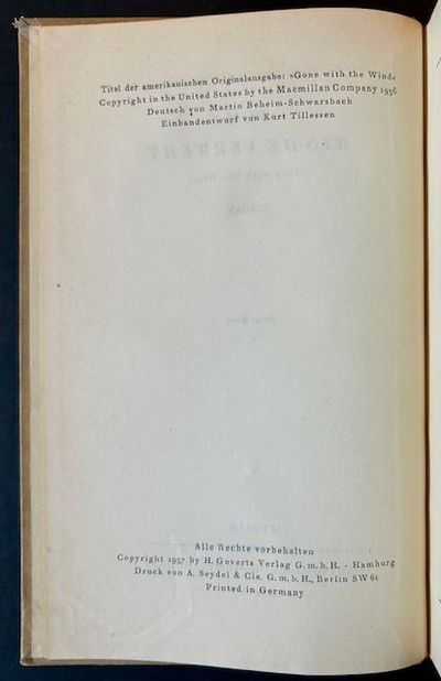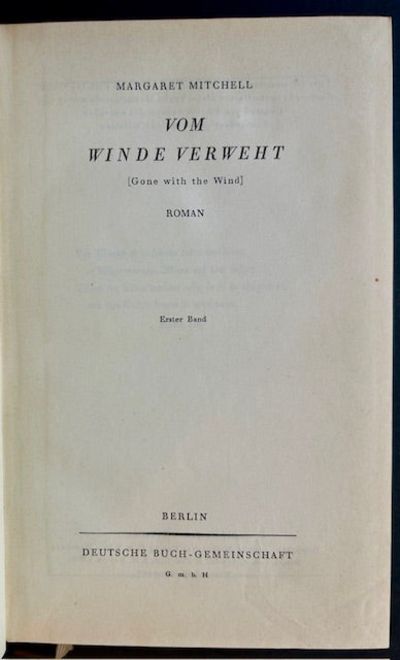 Berlin: Deutsche Buch-Gemeinschaft, 1937. Boards. Near Fine. An especially clean, well-preserved example of the 1937 1st German edition of "Gone with the Wind", following the May 1936 true 1st edition (published by Macmillan in New York) by 1 year. This, the Berlin edition, was issued in 2 octavo volumes and, in this case, is especially attractive. Both volumes crisp and Near Fine in their mottled beige boards, with bright, completely unrubbed gilt-titling along the front panels and spines. Internally all-but-pristine, with no writing or markings to speak of. A touch of very light soiling along the spines, otherwise sharp as could be. Translated from its original English into German by Martin Boheim-Schwarzbach, the book design by Kurt Tillessen. Also includes both original silk bookmarks.