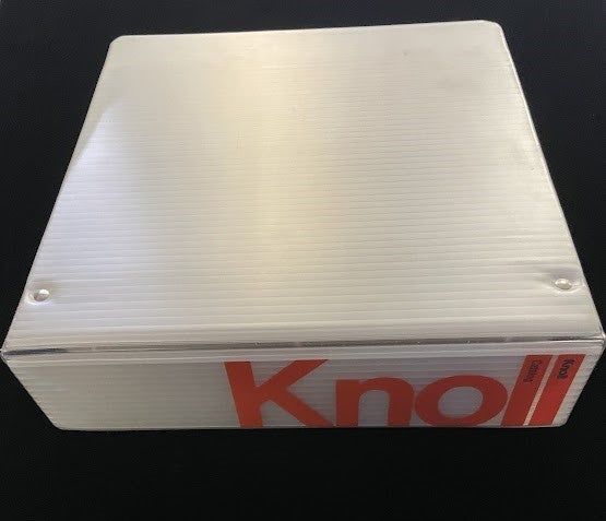 NY: Knoll Associates, Inc. 1st Edition. Hardcover. Very Good. Undated (c1980) catalog of the Knoll International Collection with hundreds of photographs supplemented with detailed drawings and specifications for Knoll furniture for residences and offices. Catalog is organized as follows, by tab: office seating, side chairs, lounge seating, multiple seating, outdoor furniture, tables, desks/credenzas. Three-ring binder in striped, opaque acrylic covers with title stamped in red, measures approx 12 x12 x2.5" Catalog design uncredited.