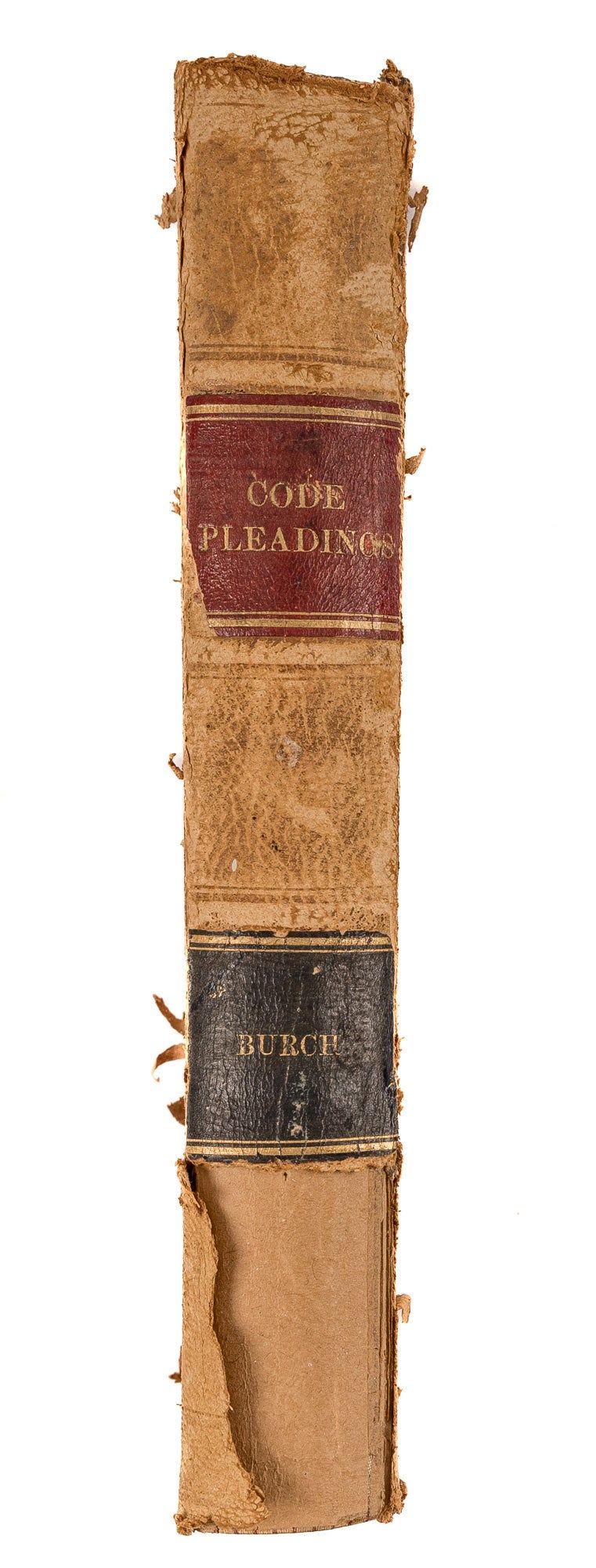 1885. San Francisco: Occidental Pub. Co., 1885.. San Francisco: Occidental Pub. Co., 1885. Burch, John C. Book of Pleadings Adapted to the Code of Civil Procedure of the State of California, with Full References to the Civil and Political Codes. San Francisco: Published by The Occidental Pub. Co., 1885. [viii], 368 pp. Contemporary sheep, blind frames to boards, raised bands and red and black lettering pieces to spine. Some shallow scuffing to boards, rubbing and wear to extremities, lower portion of backstrip lacking, joints starting, hinges cracked, early owner signature and small ink owner stamp to front pastedown. Light browning to text, internally clean. Worn, but a usable reading copy. $75.