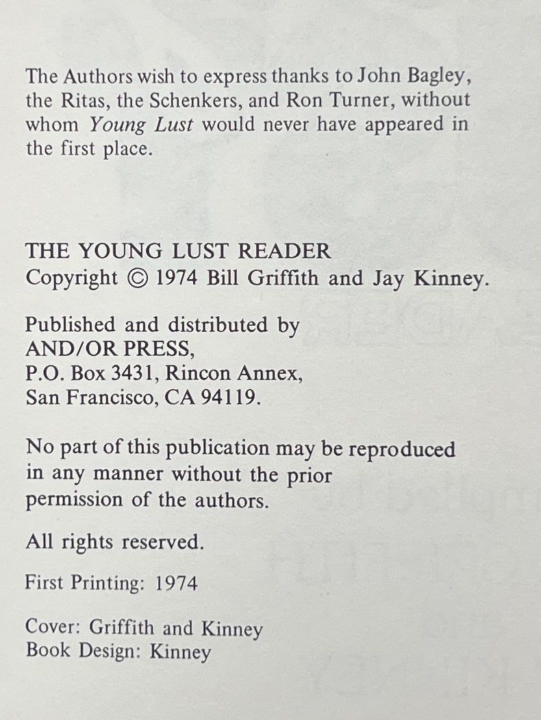 San Francisco: And/Or Press, 1974. First Edition. Paperback. Very Good. Foreword by Kinney. Afterword by Griffith. Very Good. Wraps rubbed and bumped, toned and soiled at the spine and back cover. Square and firmly bound, some stains at the fore-edge, clean internally. A collection of the first three issues.
