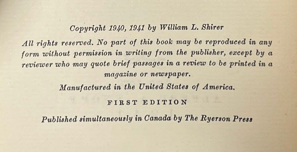New York: Alfred A. Knopf, 1941. First Edition. Hardcover. Very Good/Good. Very Good in a Near Fine jacket, unclipped ($3.00), lightly bumped. Red cloth, bumped at the spine edges, with silver gilt lettering on the spine and front board. Square and firmly bound with a red topstain, bookplates inside the front board and on the front endpaper, clean otherwise. Shirer's day-to-day record of his time as a war correspondent during WWII.