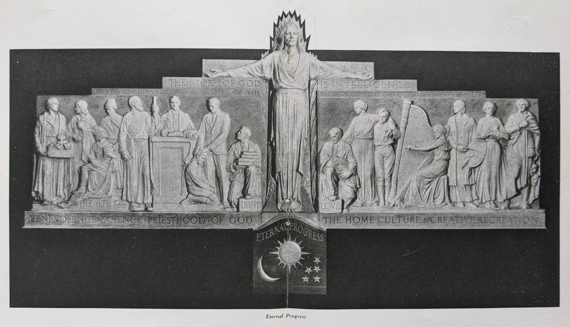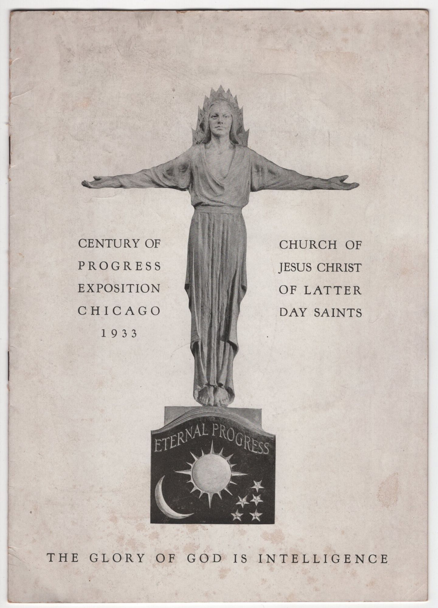"The marvels of A Century of Progress are shown at the World's Fair at Chicago. The revelations of science and the ingenuity and accomplishment of modern man have so changed the old familiar conditions that we stand amazed, wondering what further miracles will come to transform our civilization. Yet, startling as is the story, the Mormon exhibit reveals something more ambitious. It is told in the Hall of Religions. It, too, is a story of progress. Not only a hundred years of progress but of 'Eternal Progress.'