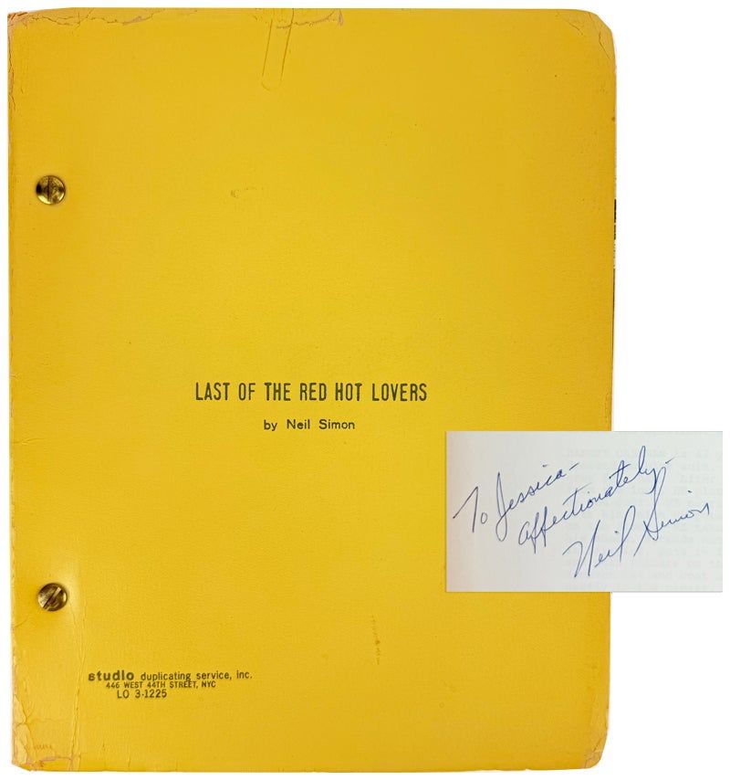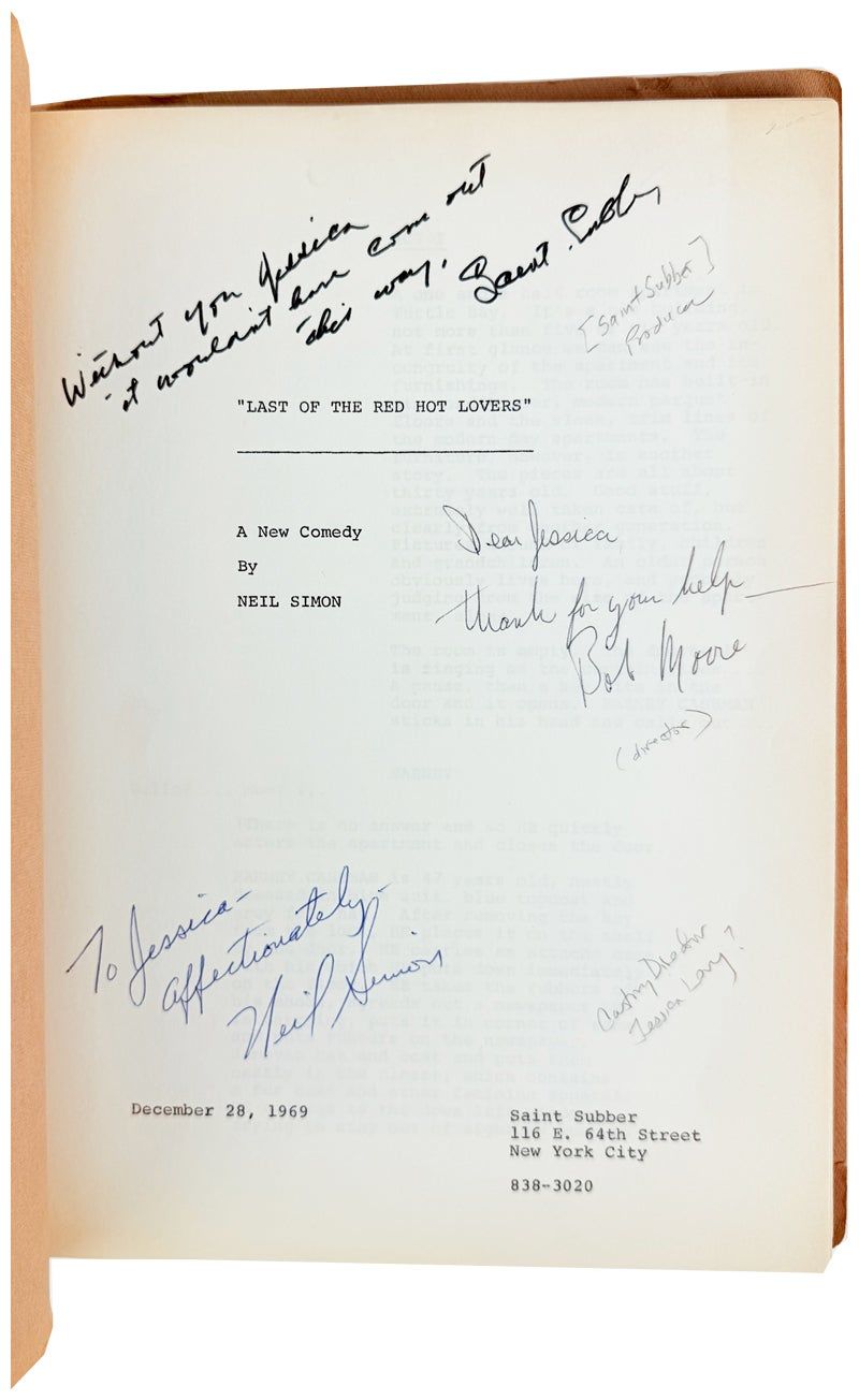 Original working stage play to the 1969 Broadway production, inscribed and signed on title page by the playwright Neil Simon, the director Robert Moore, and the producer Saint Subber: "Without you Jessica it wouldn't have come out this way / Saint Subber"; "Dear Jessica / Thank you for your help / Bob Moore"; "To Jessica / Affectionately / Neil Simon." Most likely inscribed to Jessica Levy, the production's casting director.