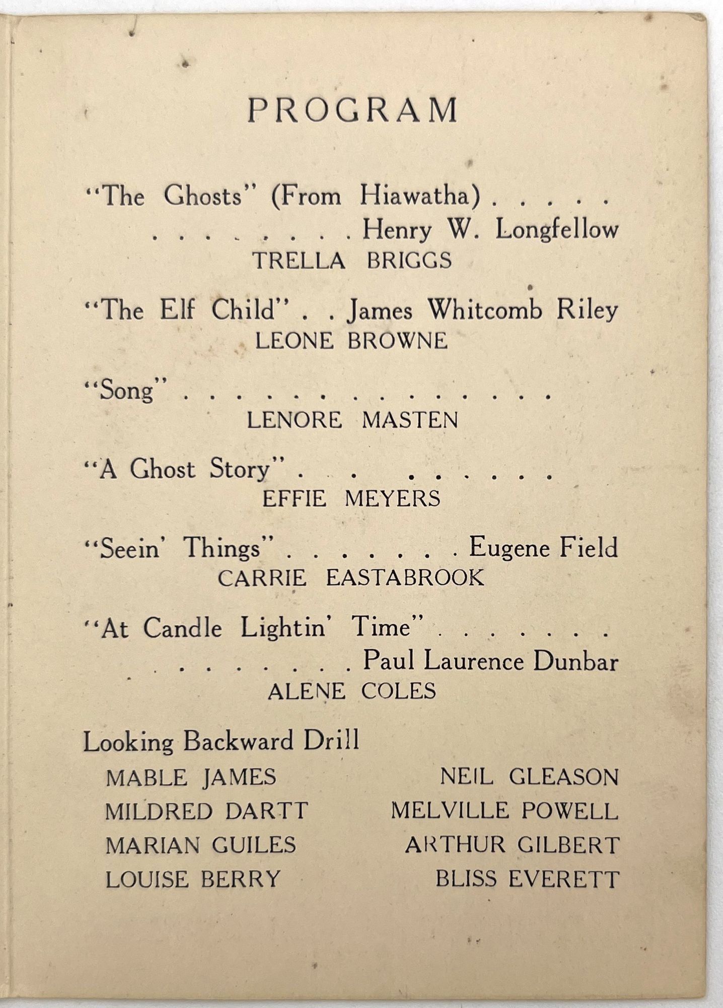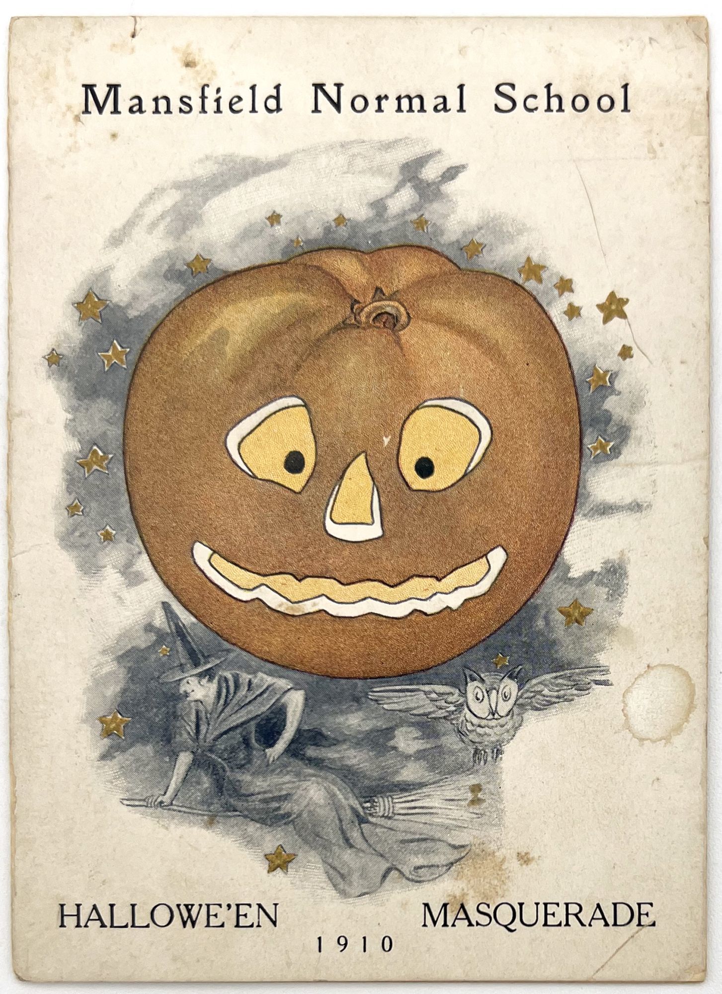 Mansfield, Pennsylvania: Mansfield State Normal School, 1910. Very good. Dust soiling/spotting. A couple nicks.. Printed program for a Halloween Masquerade held at Mansfield Normal School (in Mansfield, Pennsylvania, for girls. Outside is a colored and embossed anthropomorphized jack-o'-lantern hovering in a night sky above a witch on her broom and an owl. Inside is an order of events, including poetry and ghost story readings from the young ladies at the school. Embossed and color illustrated bifolium (4.75" by 3.5").