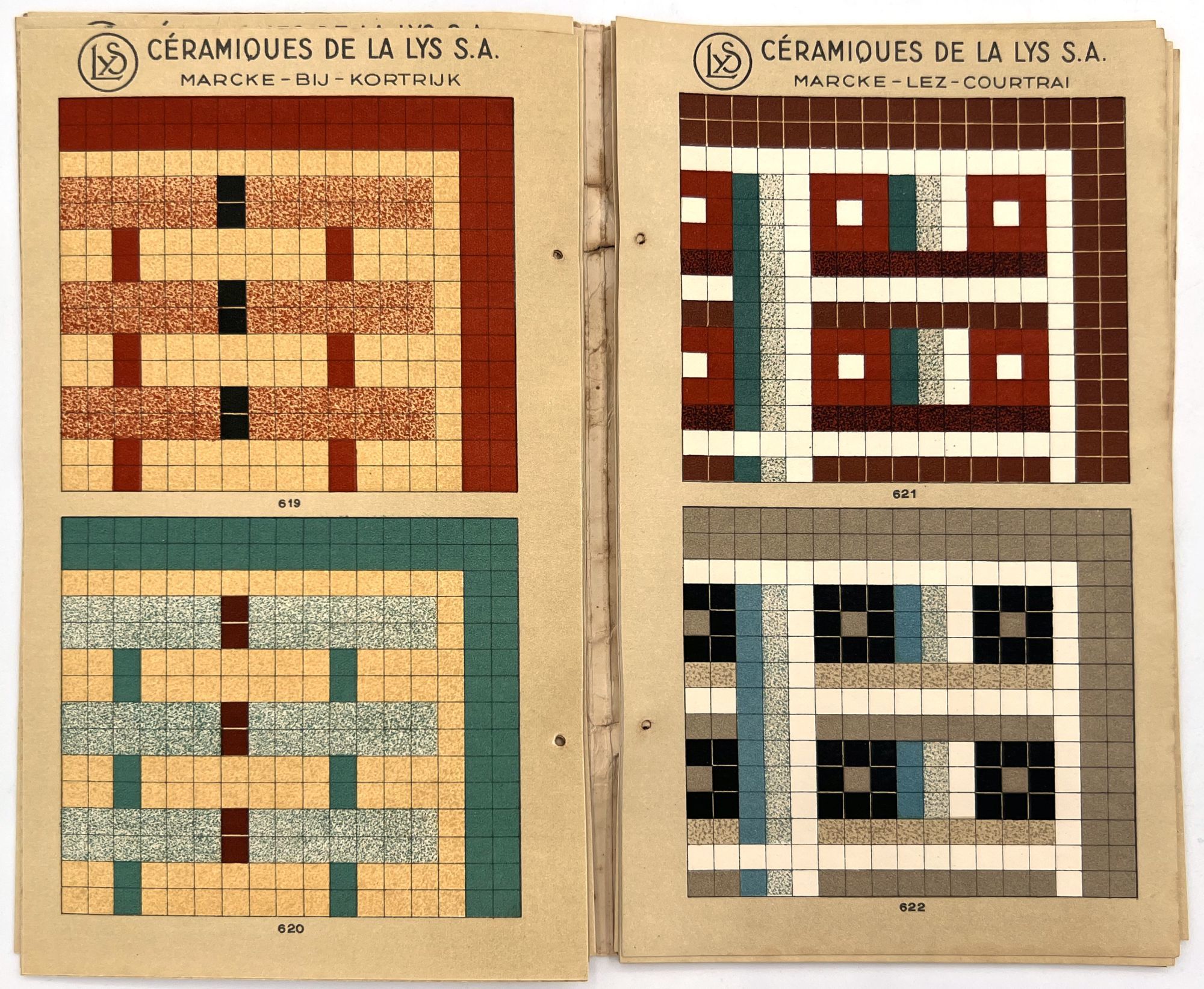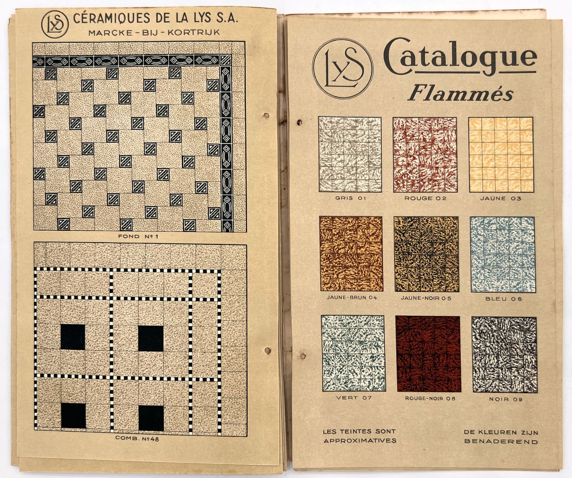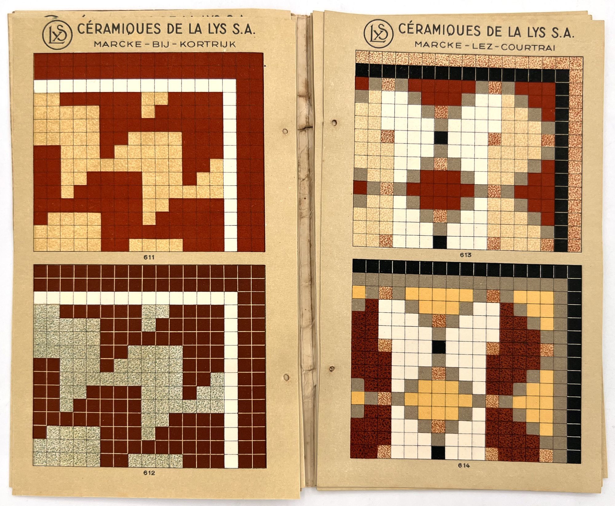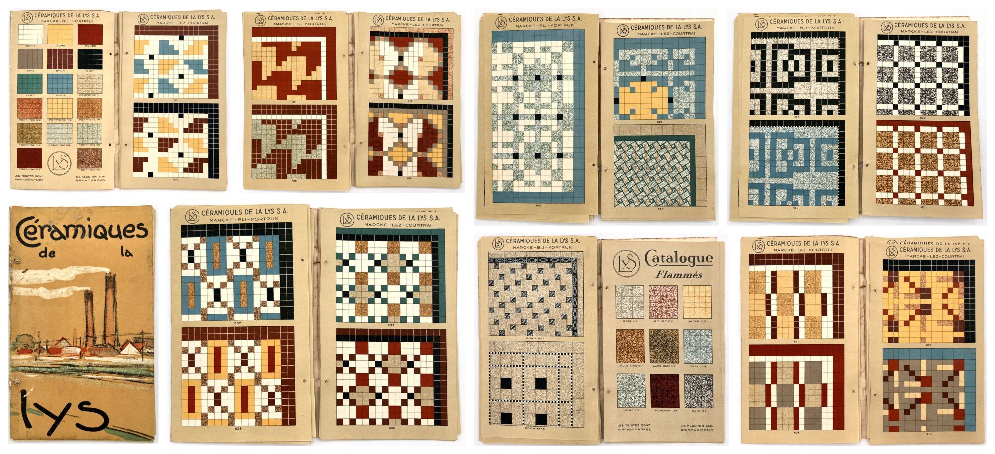 Belgium: Lys, 1930. Very good. Dust soiling, rubbing/wear, spotting. Binding defective/original sewing or cord lacking, unclear if. A c.1930 color-illustrated catalogue of ceramic tile designs by a Marcke, Belgium company in French and Dutch. The first page shows over a dozen different color options, and the following seventeen leaves offer large colorful design ideas, each with a number for reference. 8.75" by 5", eighteen unnumbered leaves, color illus., in original illus. wrps with illustration of the factory on the front. One copy on WorldCat only (July 2025).