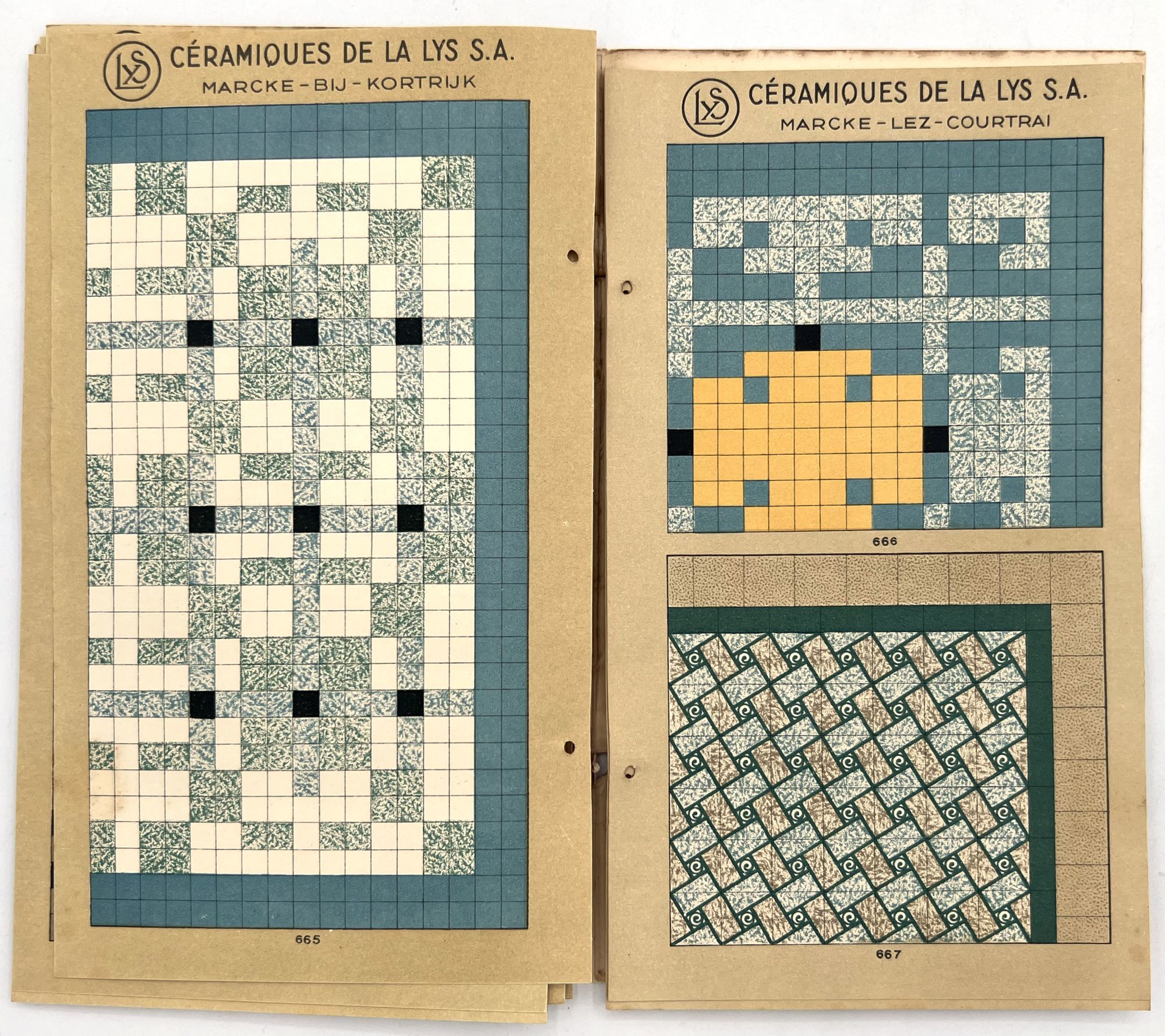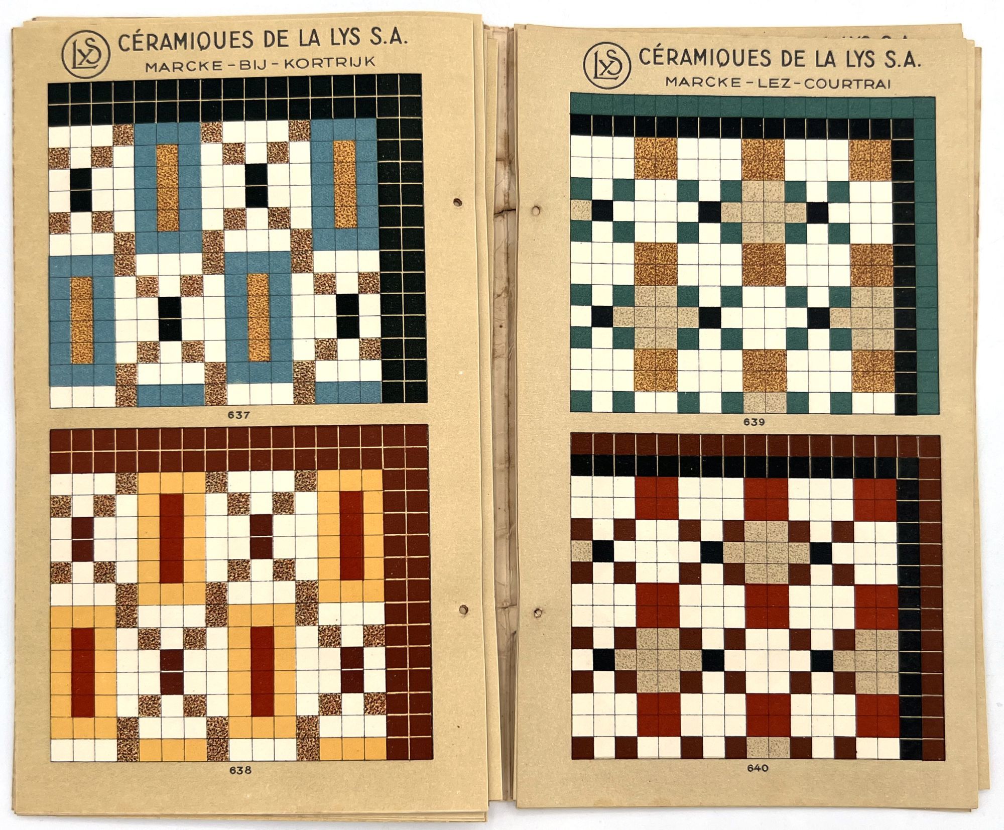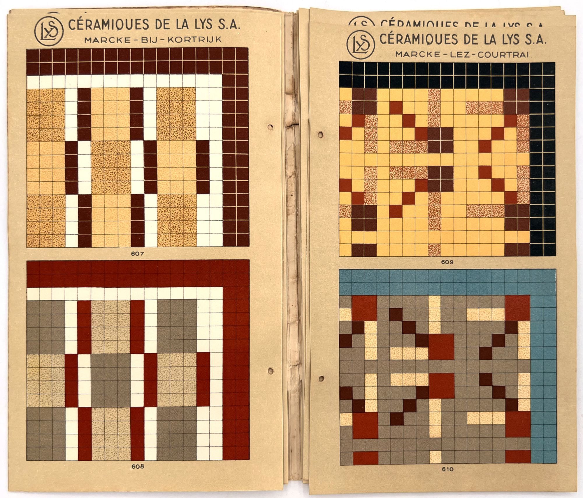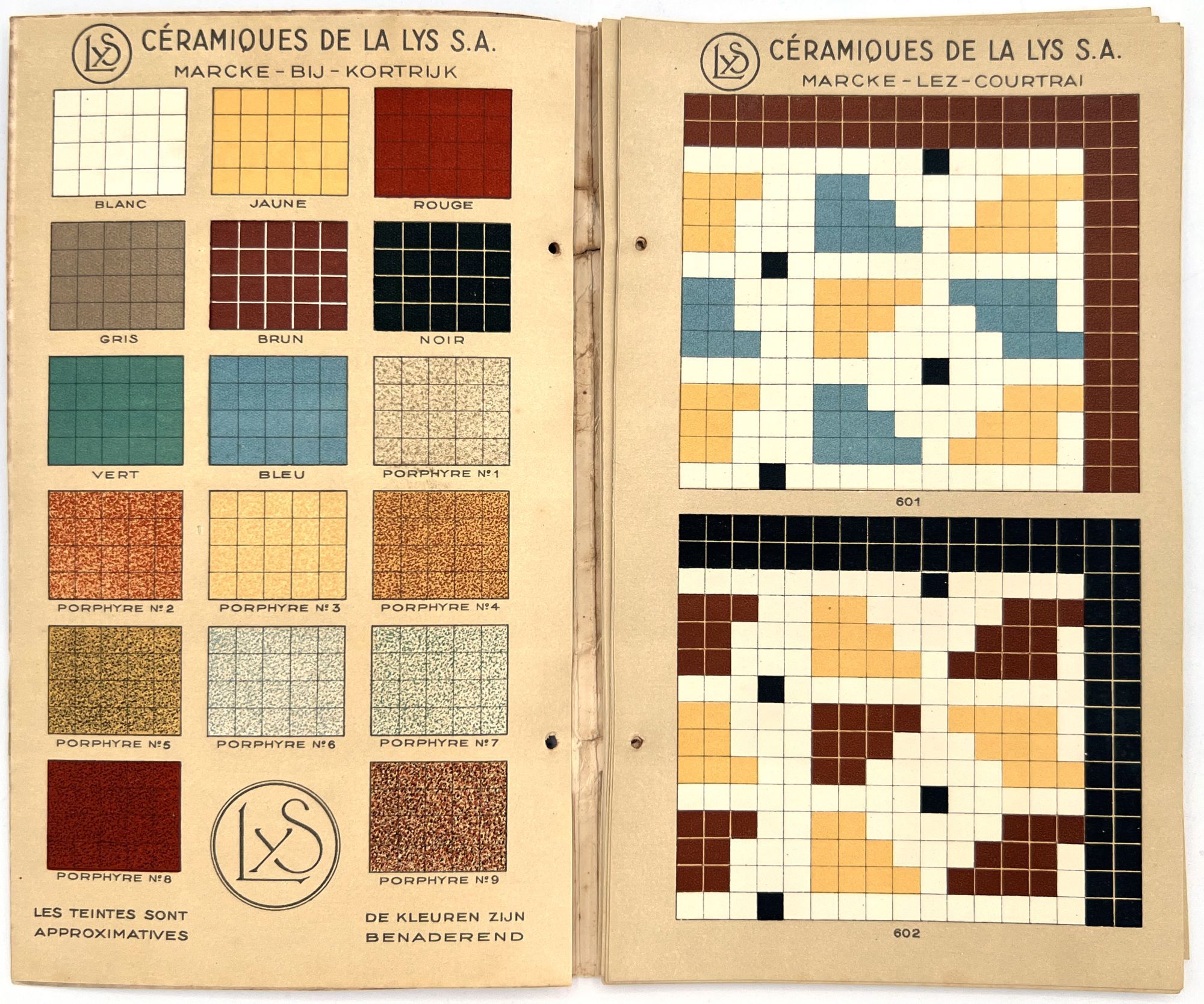 Belgium: Lys, 1930. Very good. Dust soiling, rubbing/wear, spotting. Binding defective/original sewing or cord lacking, unclear if. A c.1930 color-illustrated catalogue of ceramic tile designs by a Marcke, Belgium company in French and Dutch. The first page shows over a dozen different color options, and the following seventeen leaves offer large colorful design ideas, each with a number for reference. 8.75" by 5", eighteen unnumbered leaves, color illus., in original illus. wrps with illustration of the factory on the front. One copy on WorldCat only (July 2025).
