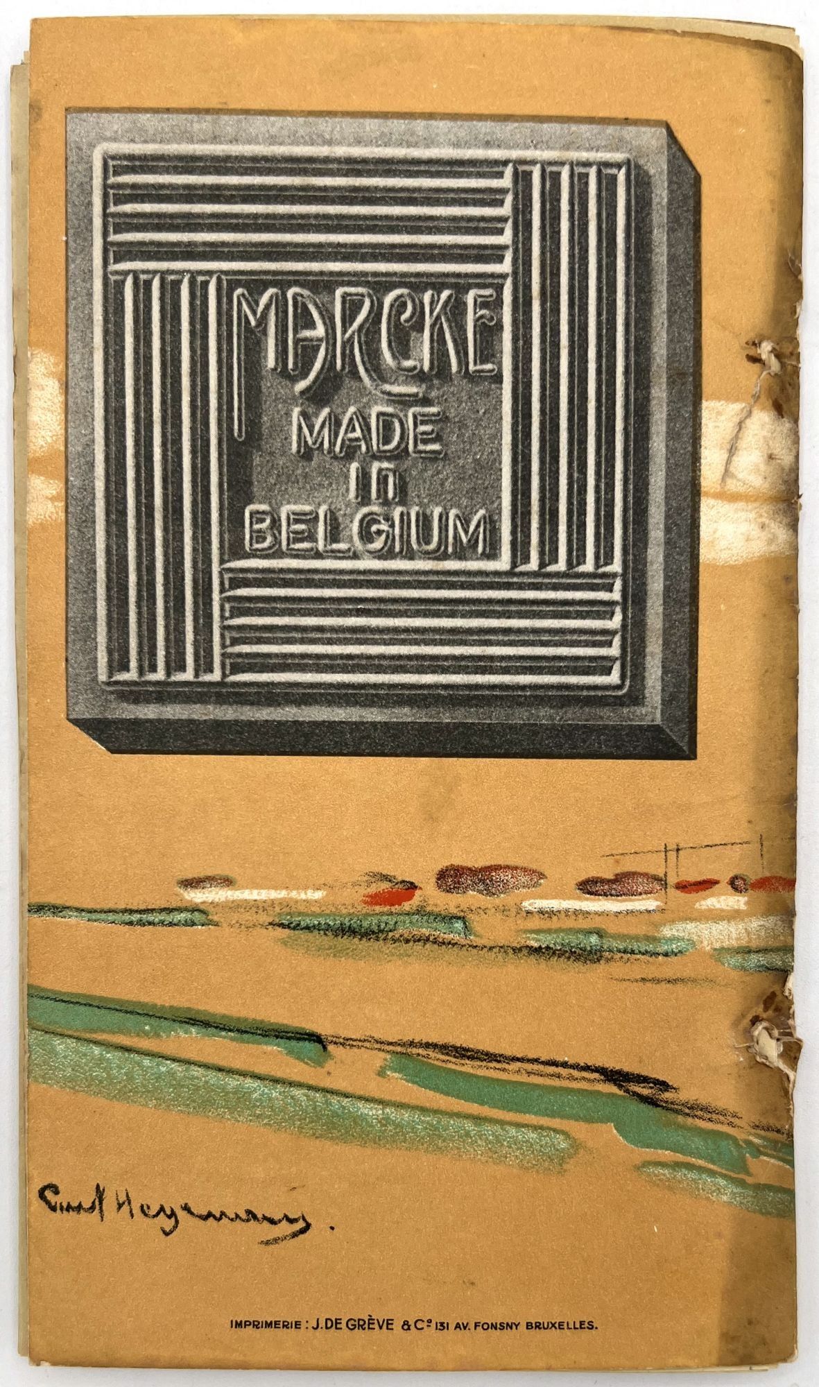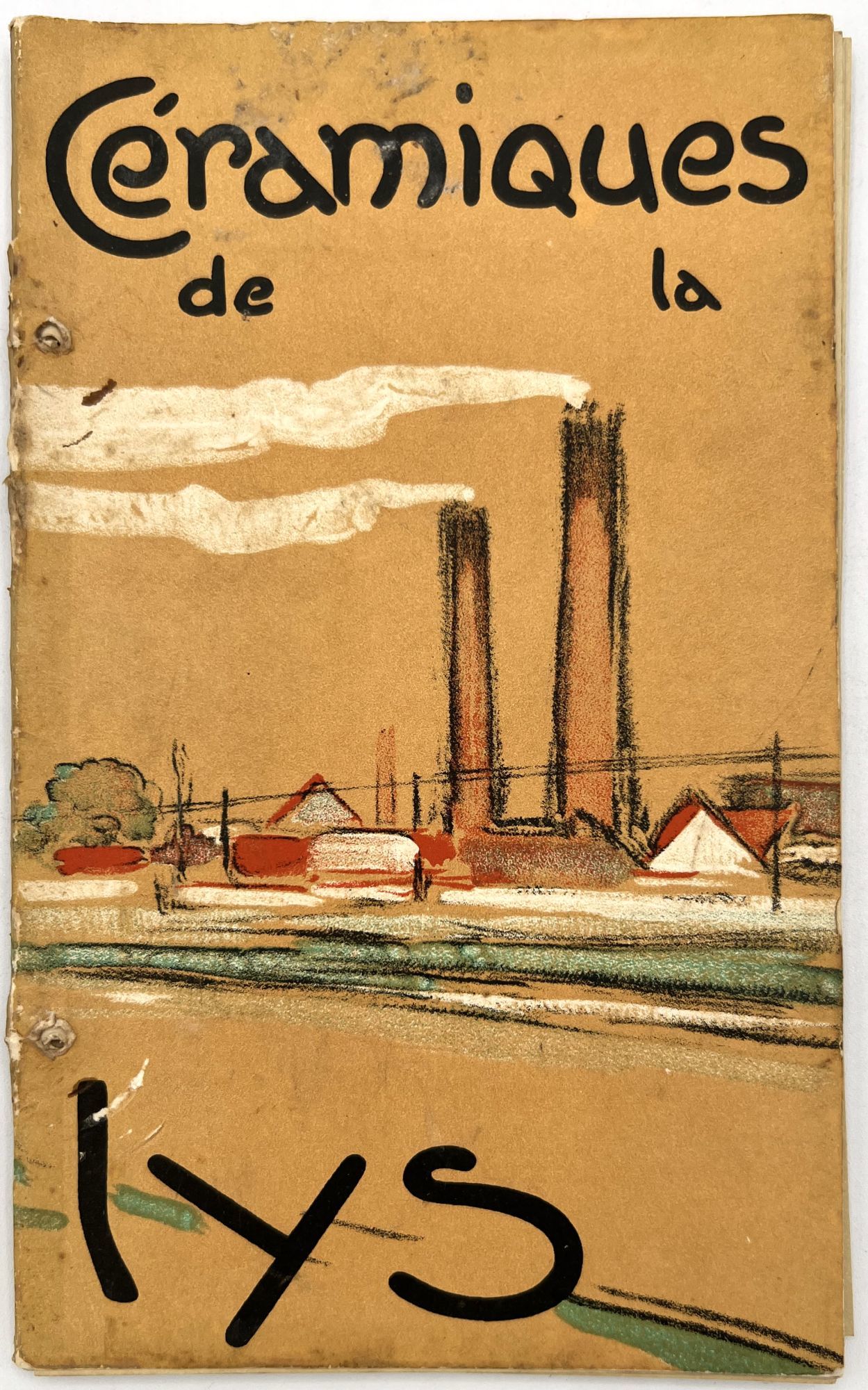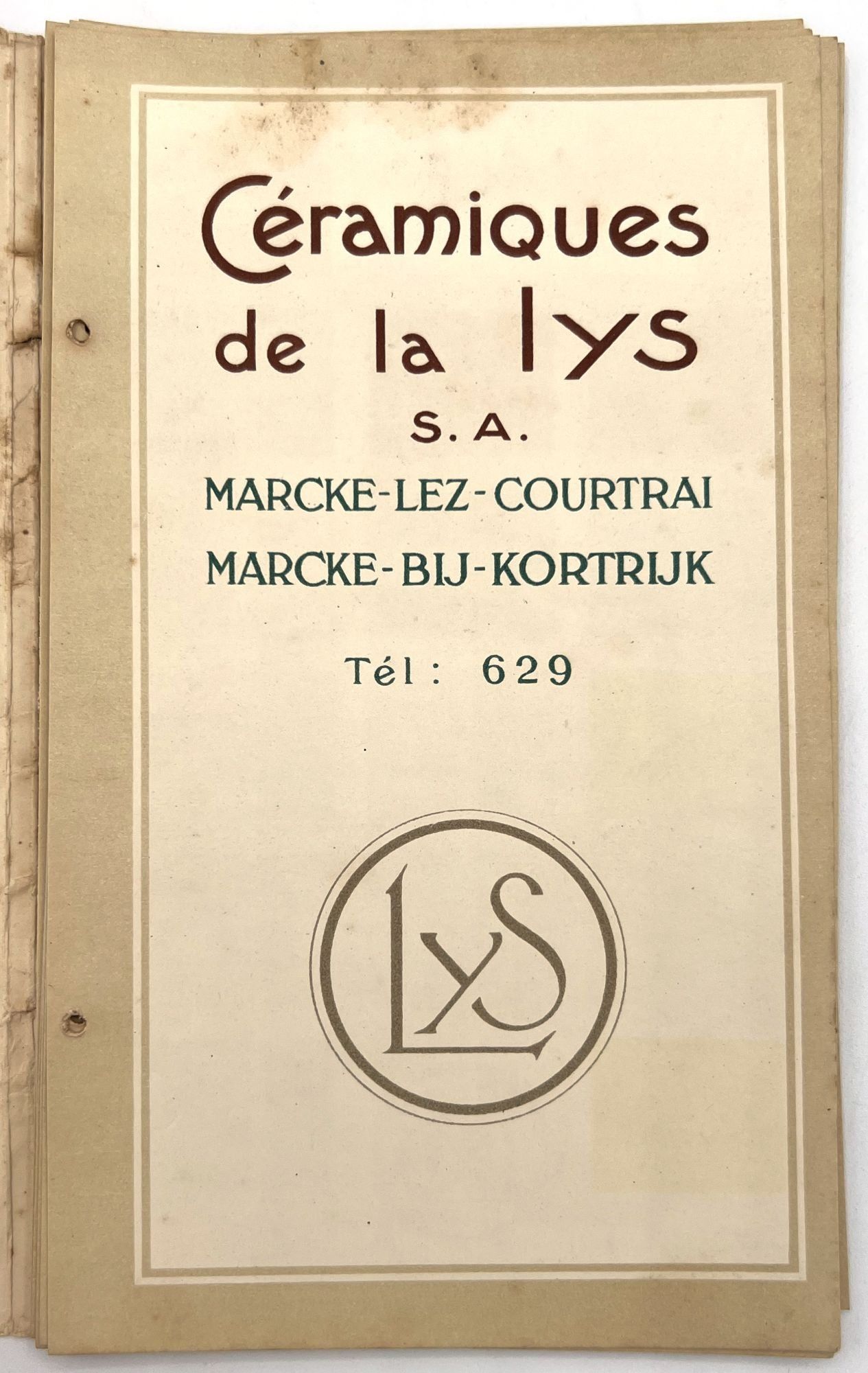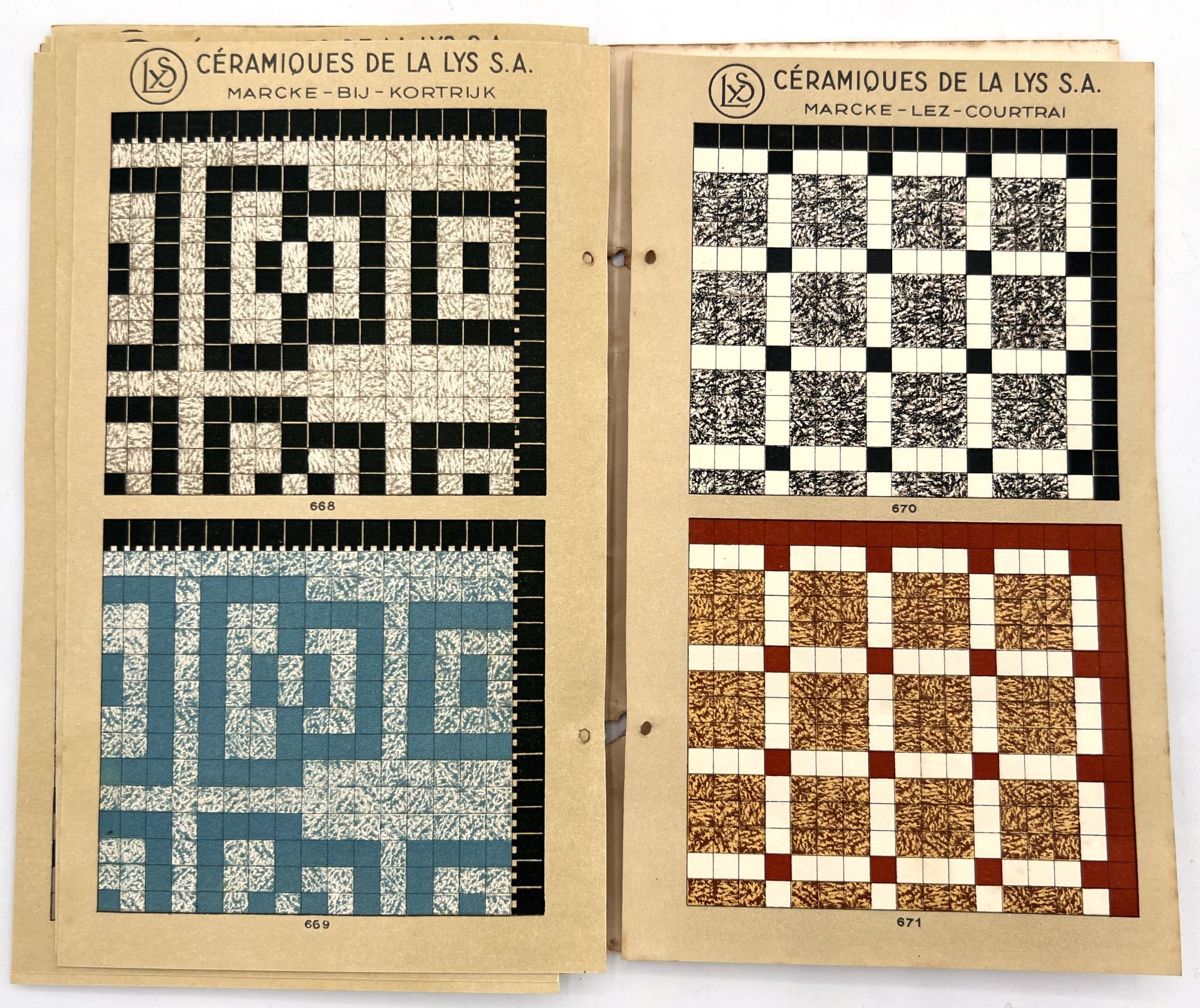 Belgium: Lys, 1930. Very good. Dust soiling, rubbing/wear, spotting. Binding defective/original sewing or cord lacking, unclear if. A c.1930 color-illustrated catalogue of ceramic tile designs by a Marcke, Belgium company in French and Dutch. The first page shows over a dozen different color options, and the following seventeen leaves offer large colorful design ideas, each with a number for reference. 8.75" by 5", eighteen unnumbered leaves, color illus., in original illus. wrps with illustration of the factory on the front. One copy on WorldCat only (July 2025).
