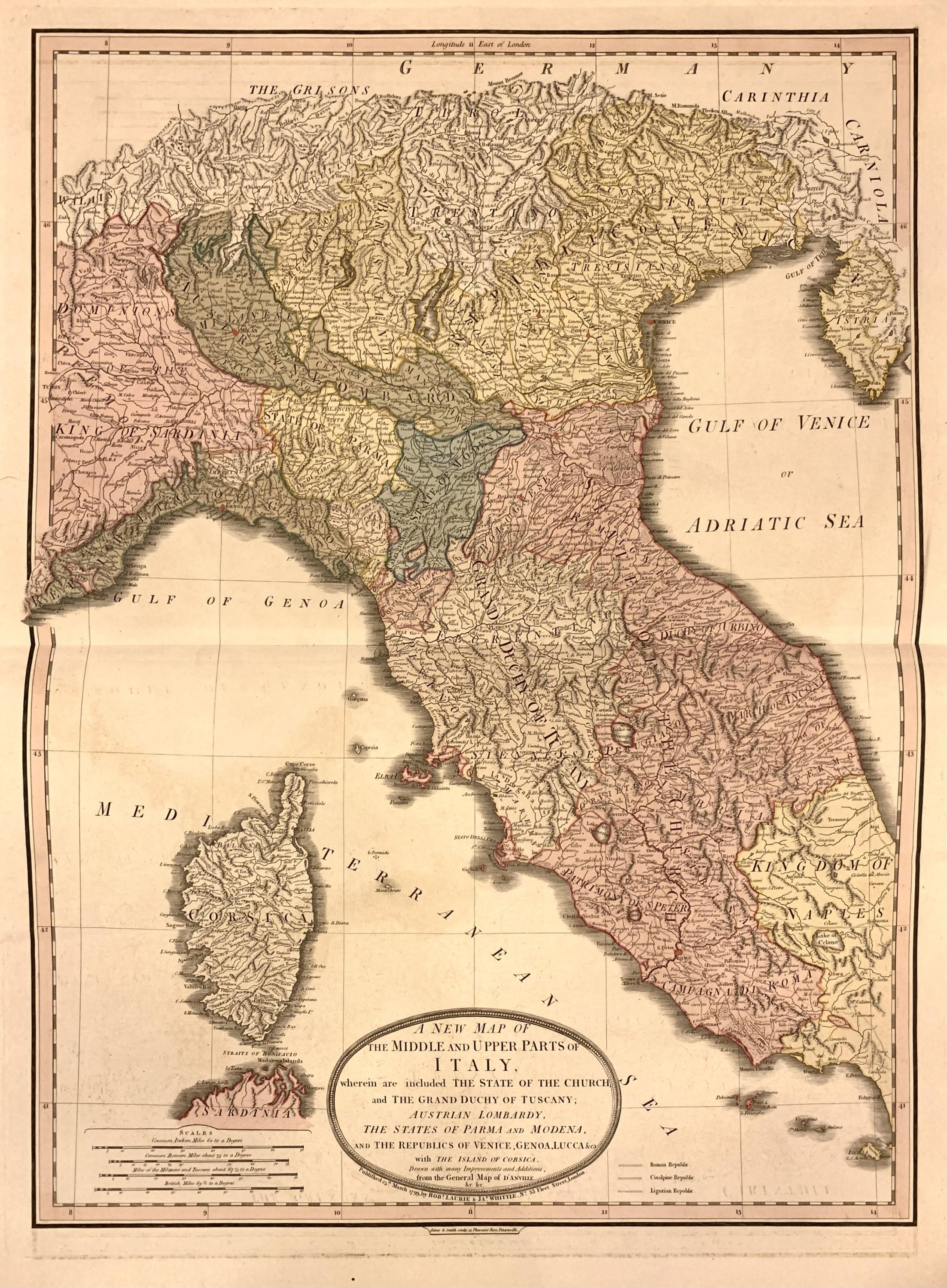 A New Map of the Middle and Upper Parts of Italy, wherein are included The State of the Church, and the Grand Duchy of Tuscany; Austrian Lombardy, The States of Parma and Modena, and The REpublics of Venice, Genoa, Lucca, & ca. with the Island of Corsica