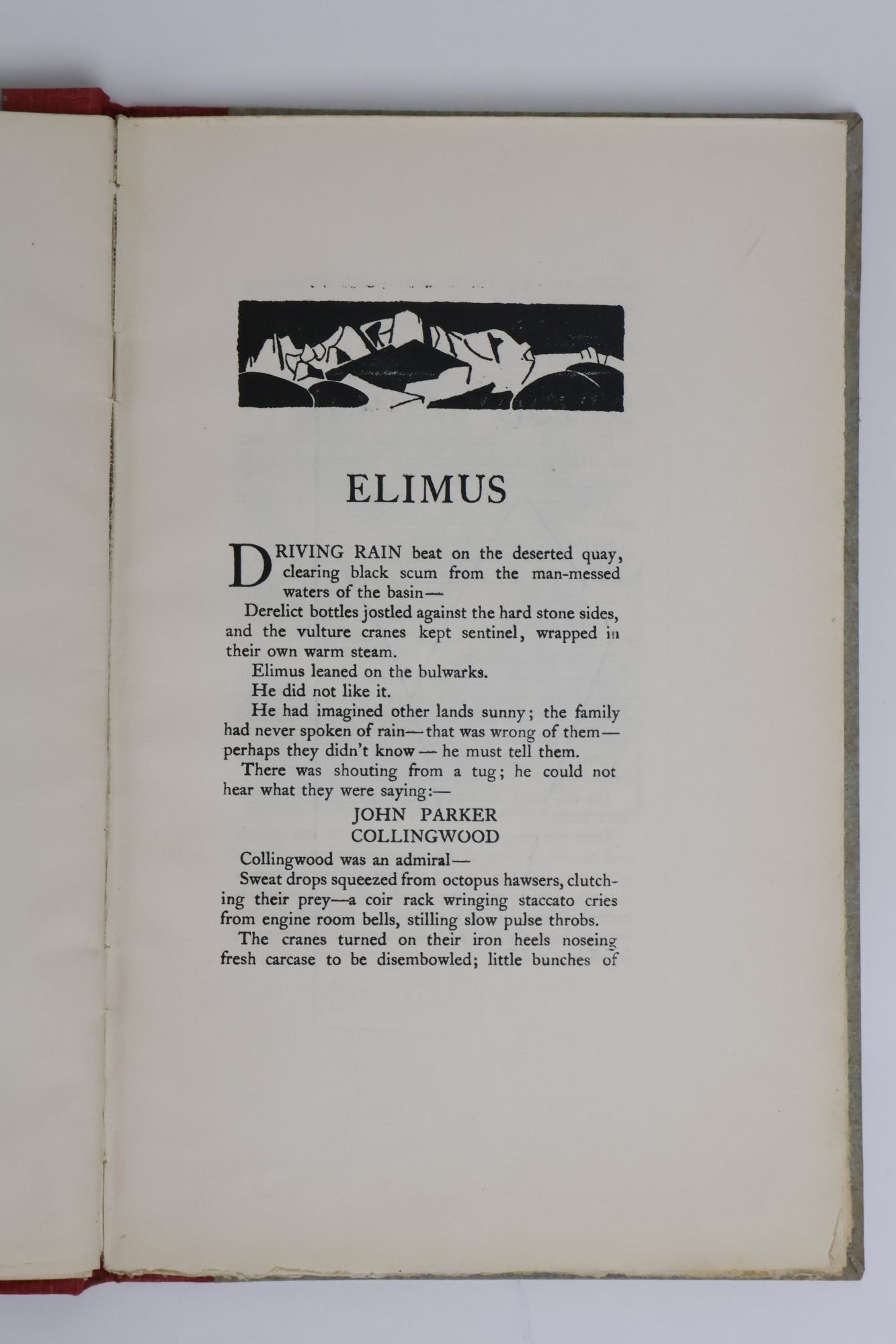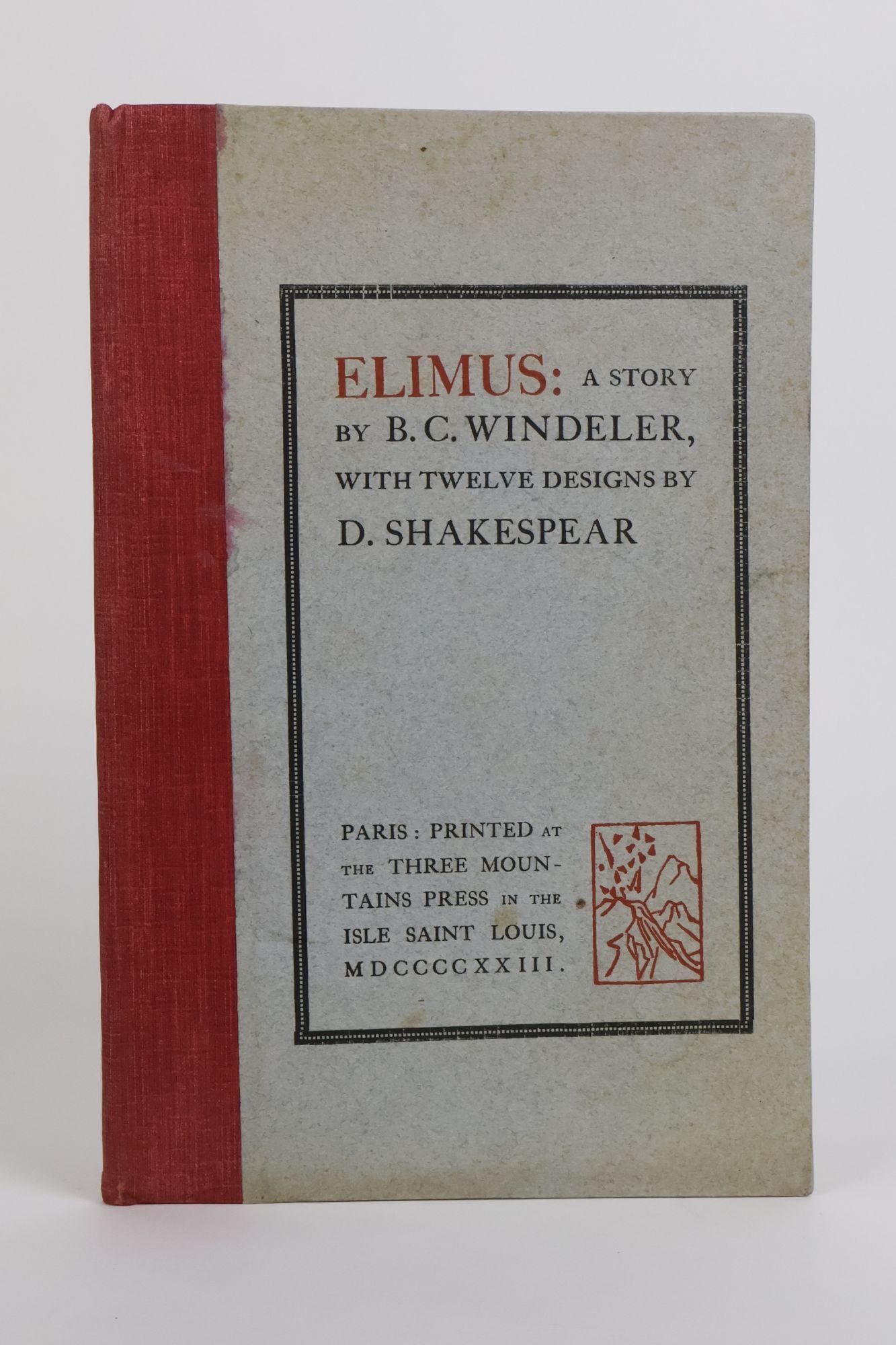 Paris: Three Mountains Press, 1923. Limited First Edition #150/300. Hardcover. Thin Octavo, 45 pages. In Very Good Minus condition. Spine red with no lettering. Quarter bound in red cloth with grey paper boards. Spine slightly cocked. Minor shelfwear and soiling. Slight foxing and bowing to boards. Minor bleeding to red dye where cloth meets the front board. Minor agetoning to pages. Pages uncut. SH consignment. Shelved case 9 3/4. Bill Bird was an American publisher best known for running the Three Mountains Press, a small press that published many prominent modernists in the 1920s including Ezra Pound, Ernest Hemingway, James Joyce, William Carlos Williams and Robert McAlmon, with Ezra Pound serving as editor. Over a period of two and a half years he published 9 works. Concurrently he founded Consolidated Press Service and worked there as a journalist from 1920-1933, when he joined the New York Sun as chief foreign correspondent. Forced to flee France after the Nazi invasion, he wrote articles warning of war. After WWII he moved to Tangier and was the editor of the Tangier Gazette.
