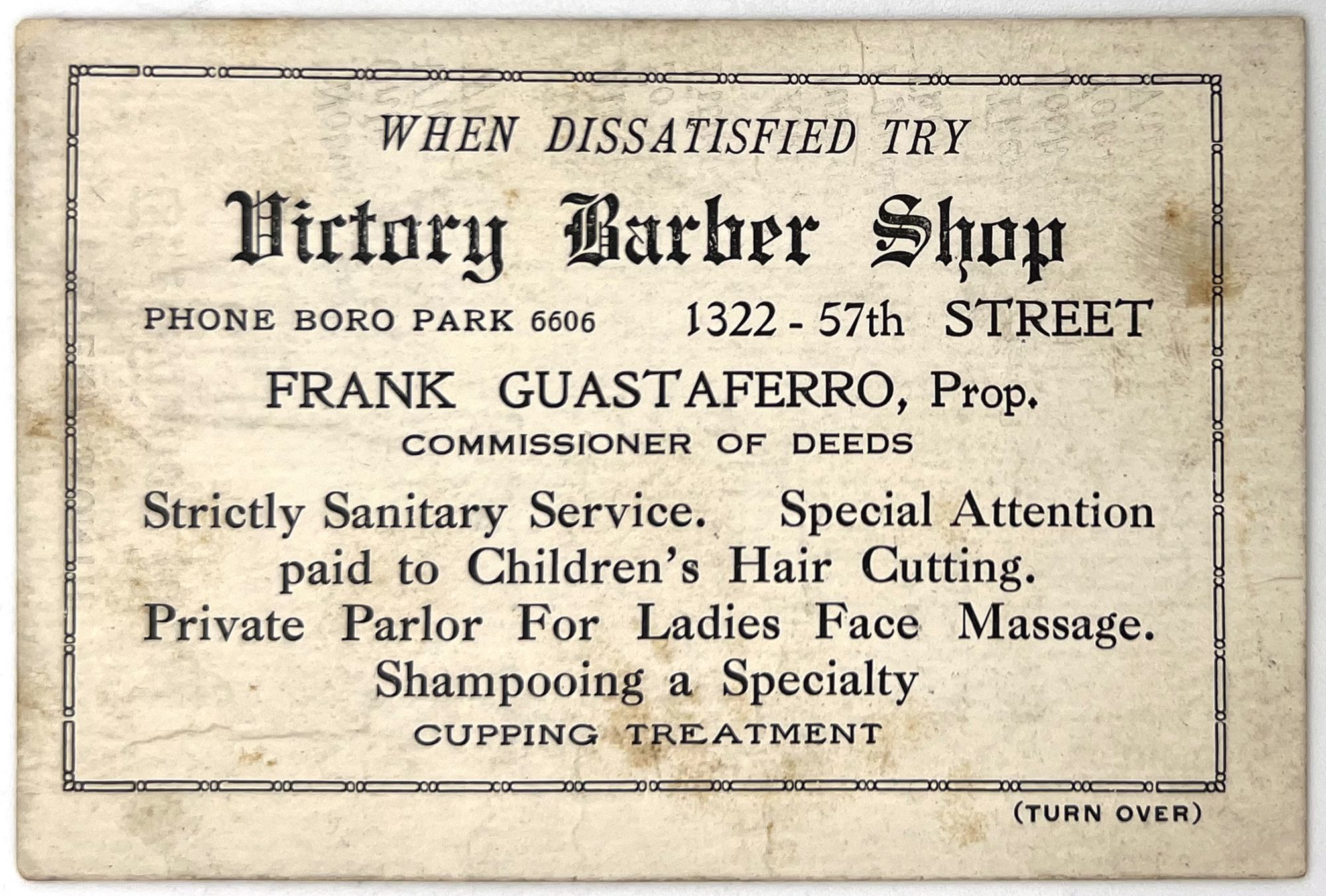 New York, New York: Victory Barber Shop, 1900. Good to very good. Some dust soiling.. Printed business card promoting a Manhattan barber shop on 57th street, "Victory Barber Shop", run by "Frank Guastaferro". Services listed on the front include: "Strictly Sanitary Service. Special Attention paid to Children's Hair Cutting. Private Parlor For Ladies Face Massage. Shampooing a Specialty". Measures approx. 3" by 4.5" Includes a poem titled "The Hidden Pearl" on the verso which begins, "Nobody looks at a virtuous girl Only because she is of humble birth When her soul is an oriental pearl Which honor Heaven and earth". It ends with a pitch for the business: "There they are! in Fifty seventh street, Look around for Thirteen Twenty two You will see three barbers on their feet Waiting with smiles and looking for you.