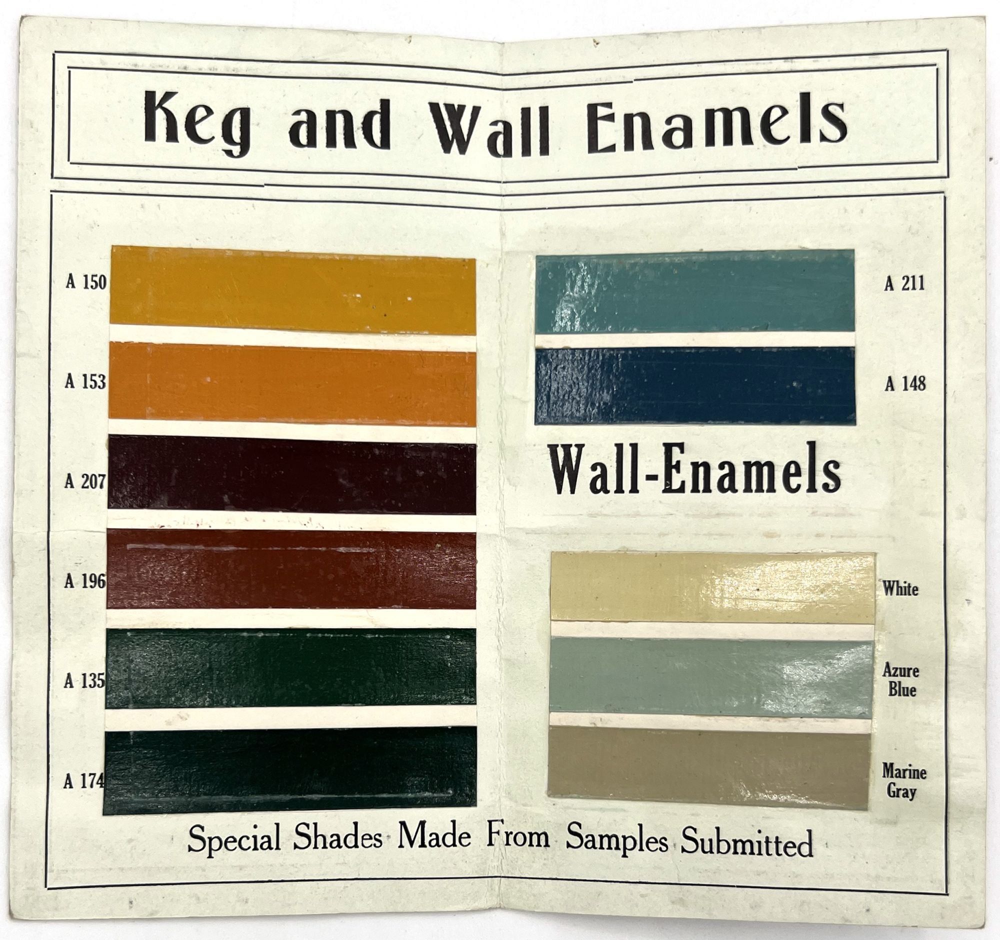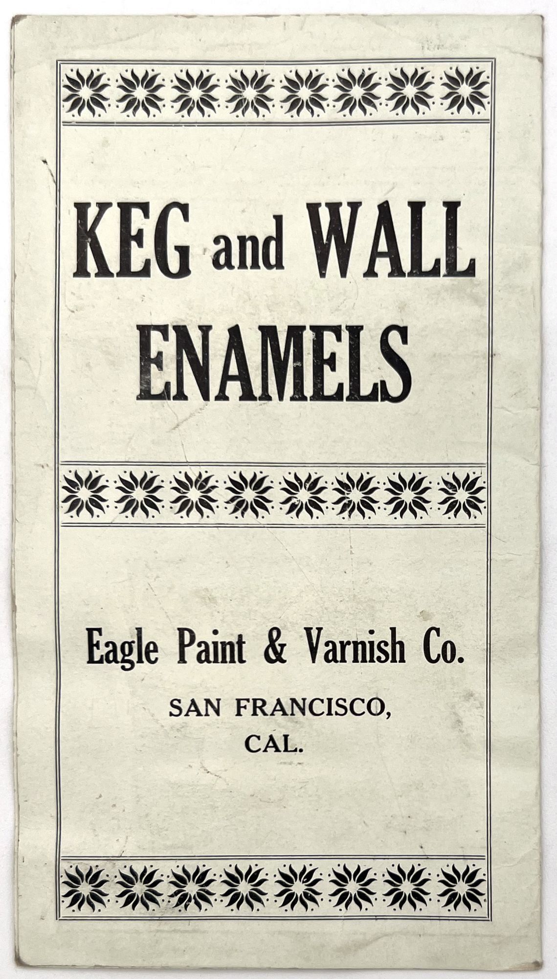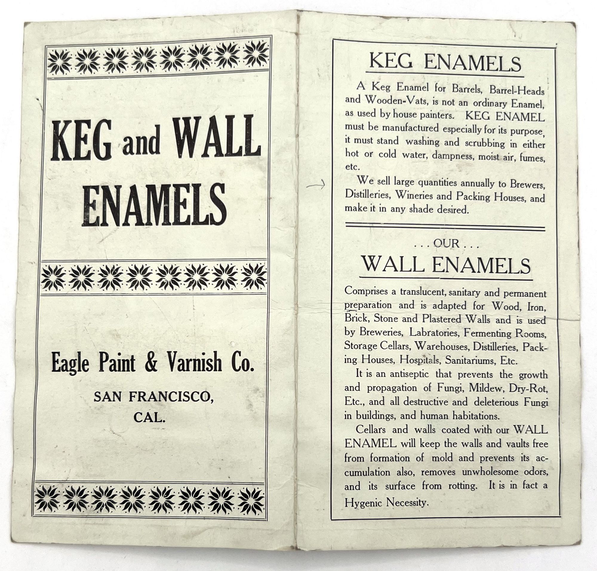 San Francisco, California: Eagle Paint & Varnish Co, 1910. Very good. Light dust soiling, a little warping, extremities rubbed.. An advertising leaflet with eleven (11) samples, each approx. 0.25" by 2.25", of different colored "Keg and Wall Enamels". The keg enamels are marketed to brewers and distillers for use on kegs and vats, while the wall enamels are marketed to storage cellars, hospitals and sanitariums. Note the marketing technique of promoting it as a "hygienic necessity" by being mold resistant. Printed bifolium (6.5" by 3.5").