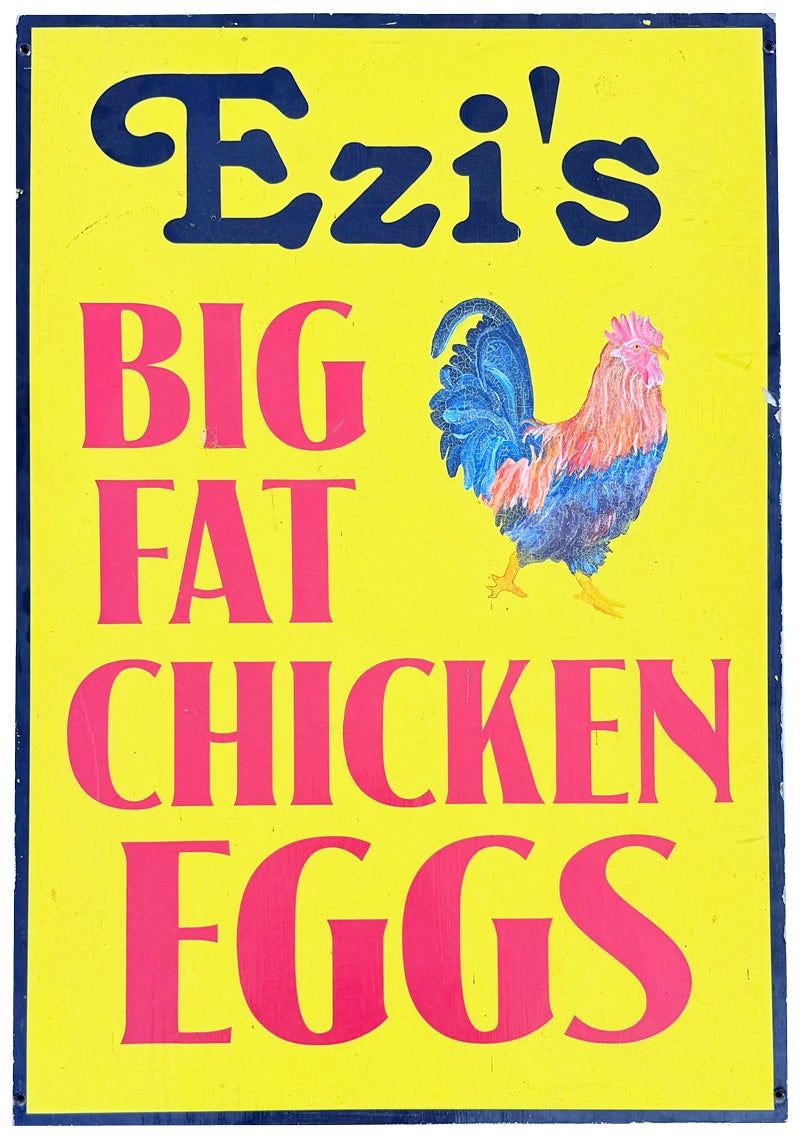 Vibrant and handsome hand-painted sign advertising Ezi's big fat chicken eggs adorned with quite a lovely but confusing painting of a rooster. Were these eggs fertilized? .