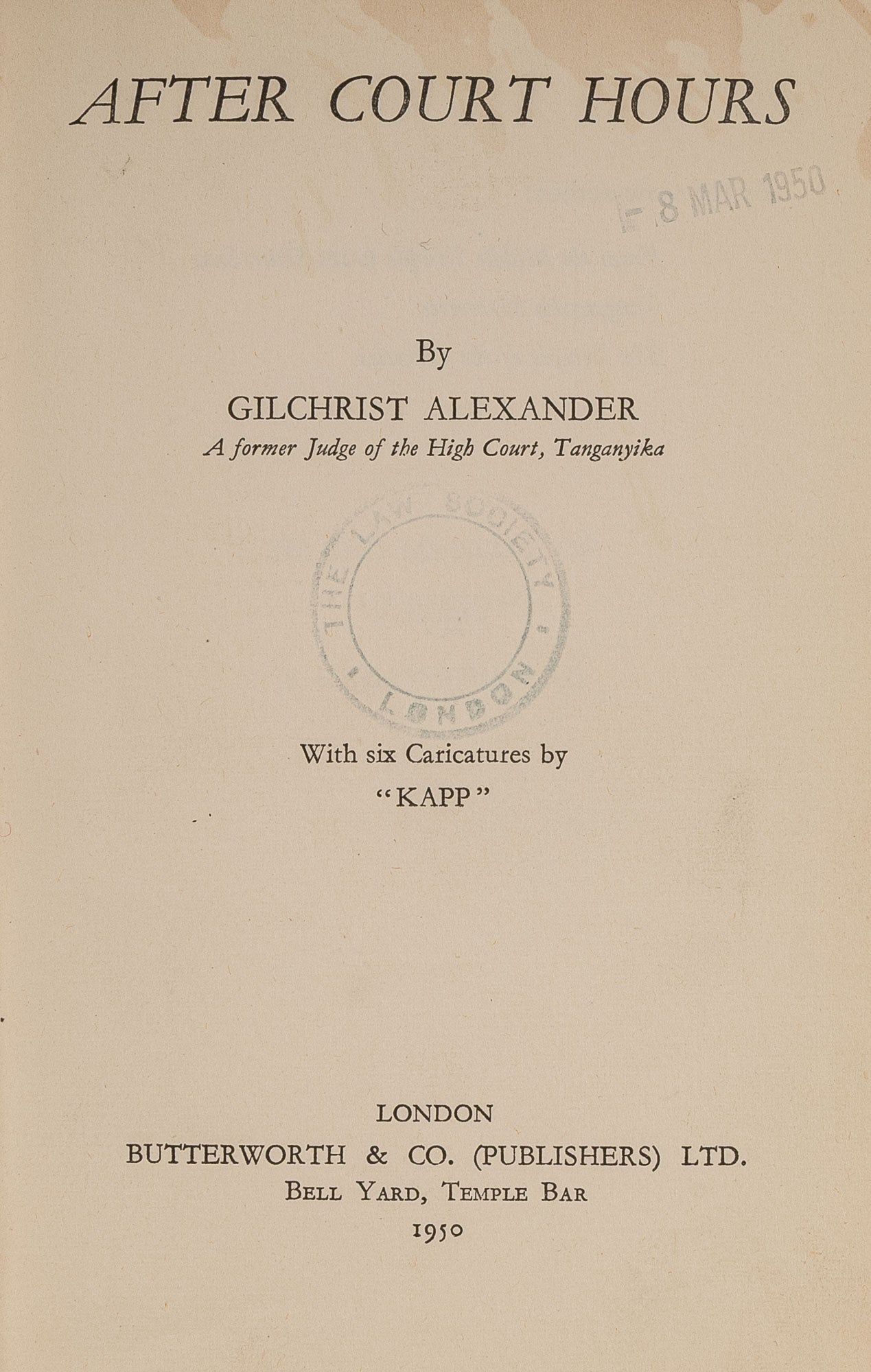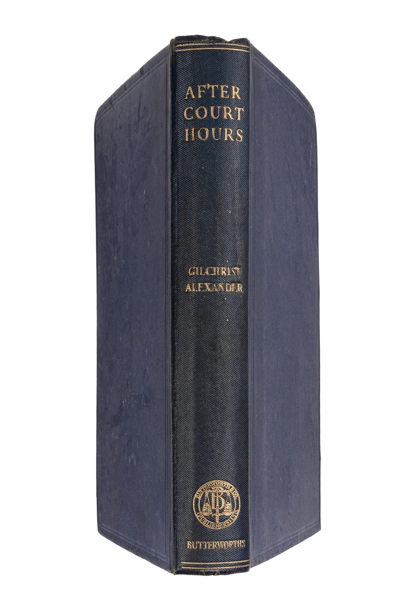 1950. Alexander, Gilchrist. After Court Hours. London, Butterworth, 1950. xi, 278 pp., illustrations, portraits. Original blue cloth with gilt stamped spine. Light shelfwear, boards lightly rubbed. Ex-library with library stamps of The London Law Society to title and various other pages. A good copy. $45. * OCLC locates 26 copies in U.S. law libraries, 1 copy in C.A. and 1 copy in N.Z.