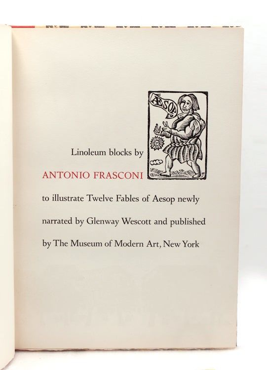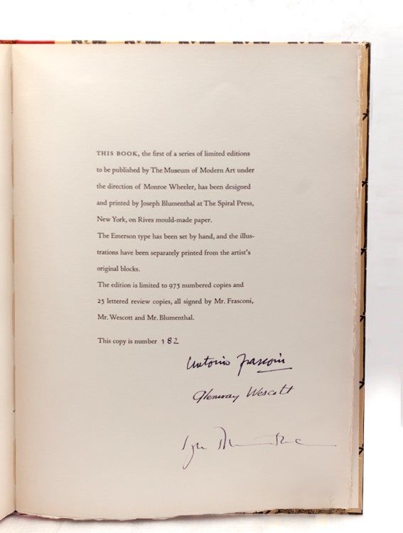 New York: Museum of Modern Art, 1954. No. 182 of 975 numbered copies, of an edition of 1000, signed by Frasconi, Wescott, and the printer, Joseph Blumenthal. Linoleum blocks by Antonio Frasconi. Printed by Joseph Blumenthal in Emerson type at the Spiral Press. Original pictorial paper-covered boards, red cloth spine, a fine copy in labeled card slipcase, missing glassine book cover. No. 182 of 975 numbered copies, of an edition of 1000, signed by Frasconi, Wescott, and the printer, Joseph Blumenthal. Linoleum blocks by Antonio Frasconi. Printed by Joseph Blumenthal in Emerson type at the Spiral Press. As stated on the colophon: “This book, the first of a series of limited editions to be published by The Museum of Modern Art under the direction of Monroe Wheeler, has been designed and printed by Joseph Blumenthal at The Spiral Press, New York…”. The Artist and the Book 111. A Century of Artists Books p.121
