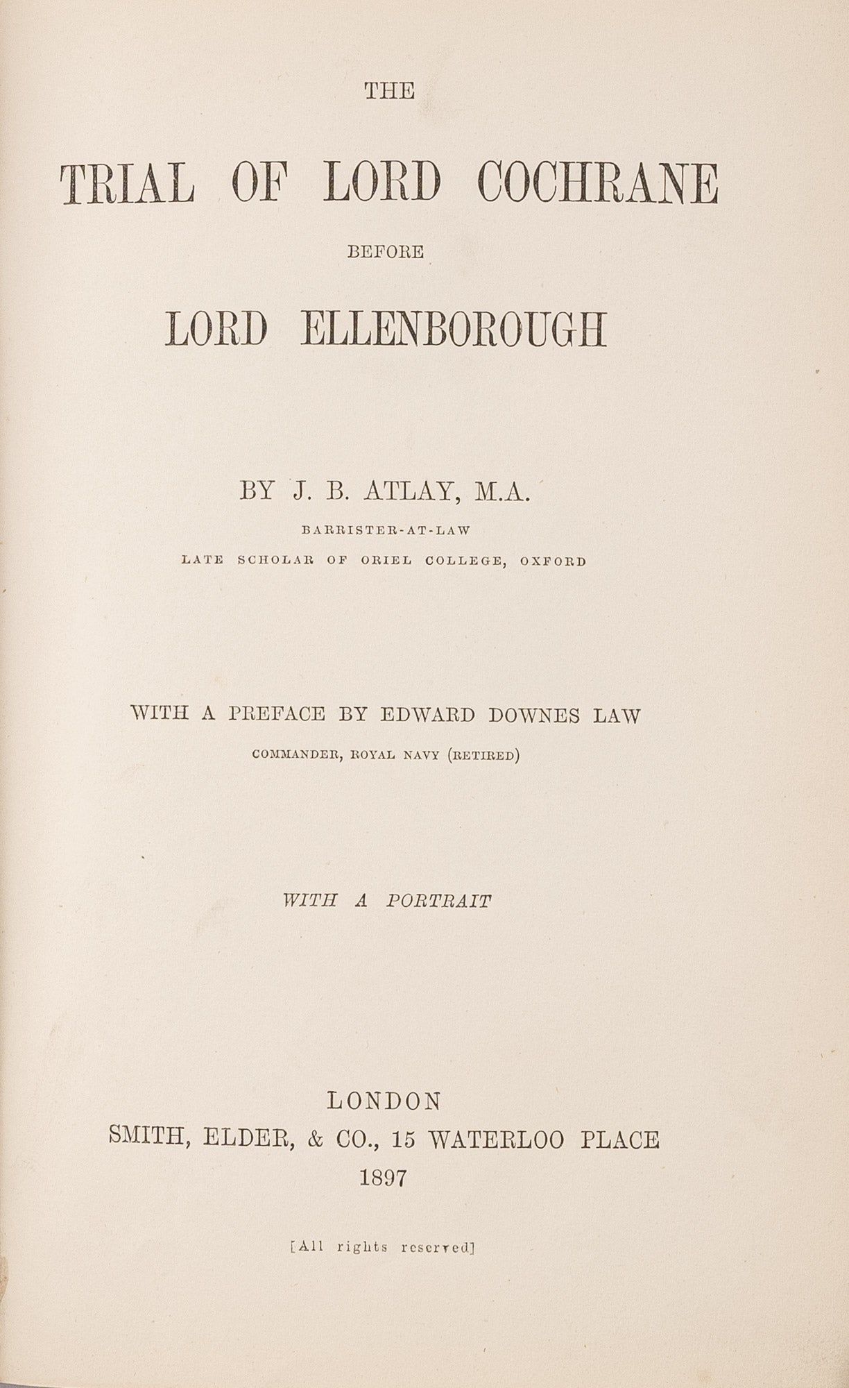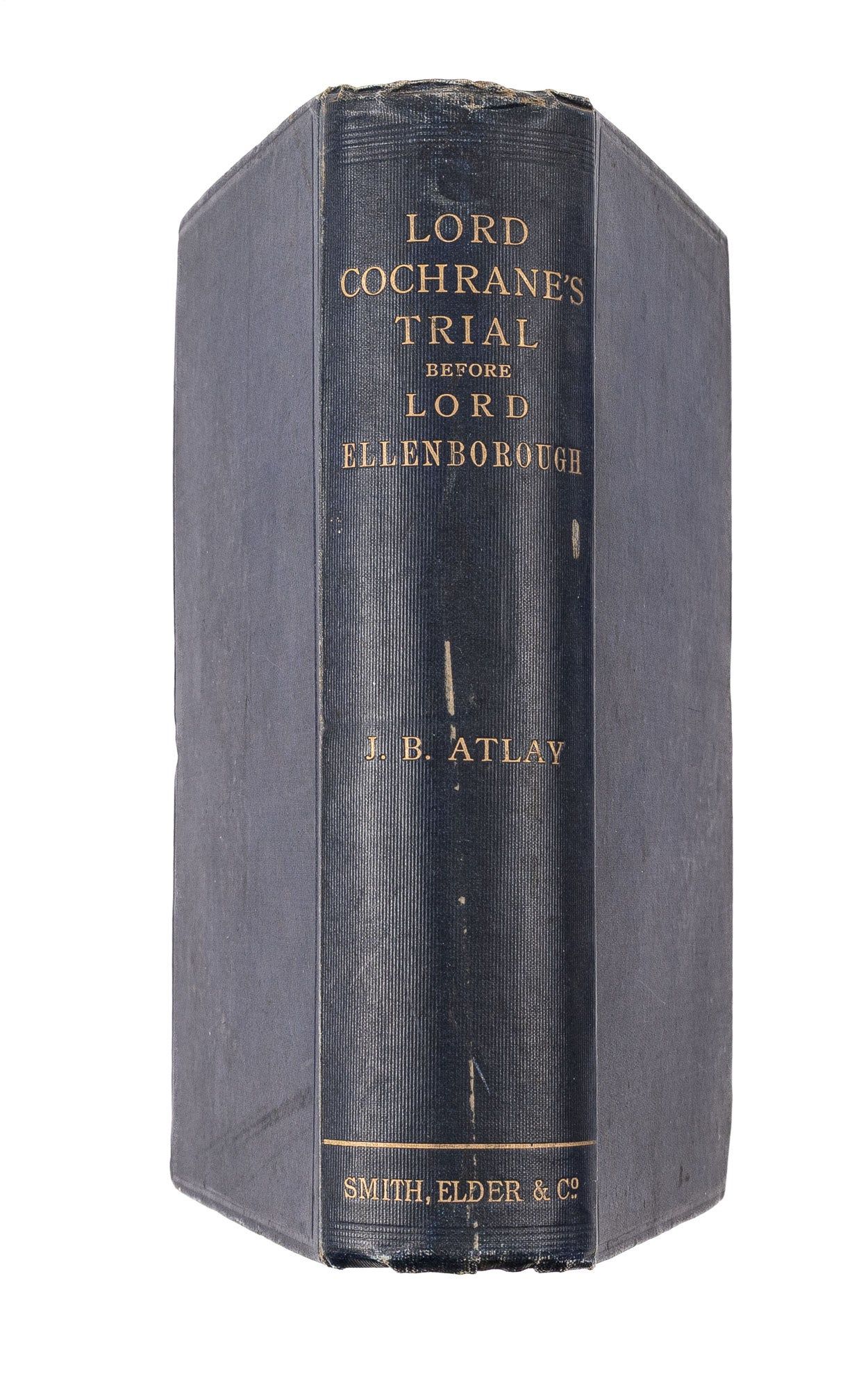 1897. Atlay, J[ames] B[eresford]; Law, Edward Downes. The Trial of Lord Cochrane Before Lord Ellenborough. London: Smith, Elder & Co., 15 Waterloo Place, 1897. xii, 529 pp., frontispiece. Original blue cloth with gilt stamped spine. Moderate wear to spine, spine ends, and corners. A well preserved copy. $125. * Account of a trial for alleged stock exchange fraud.
