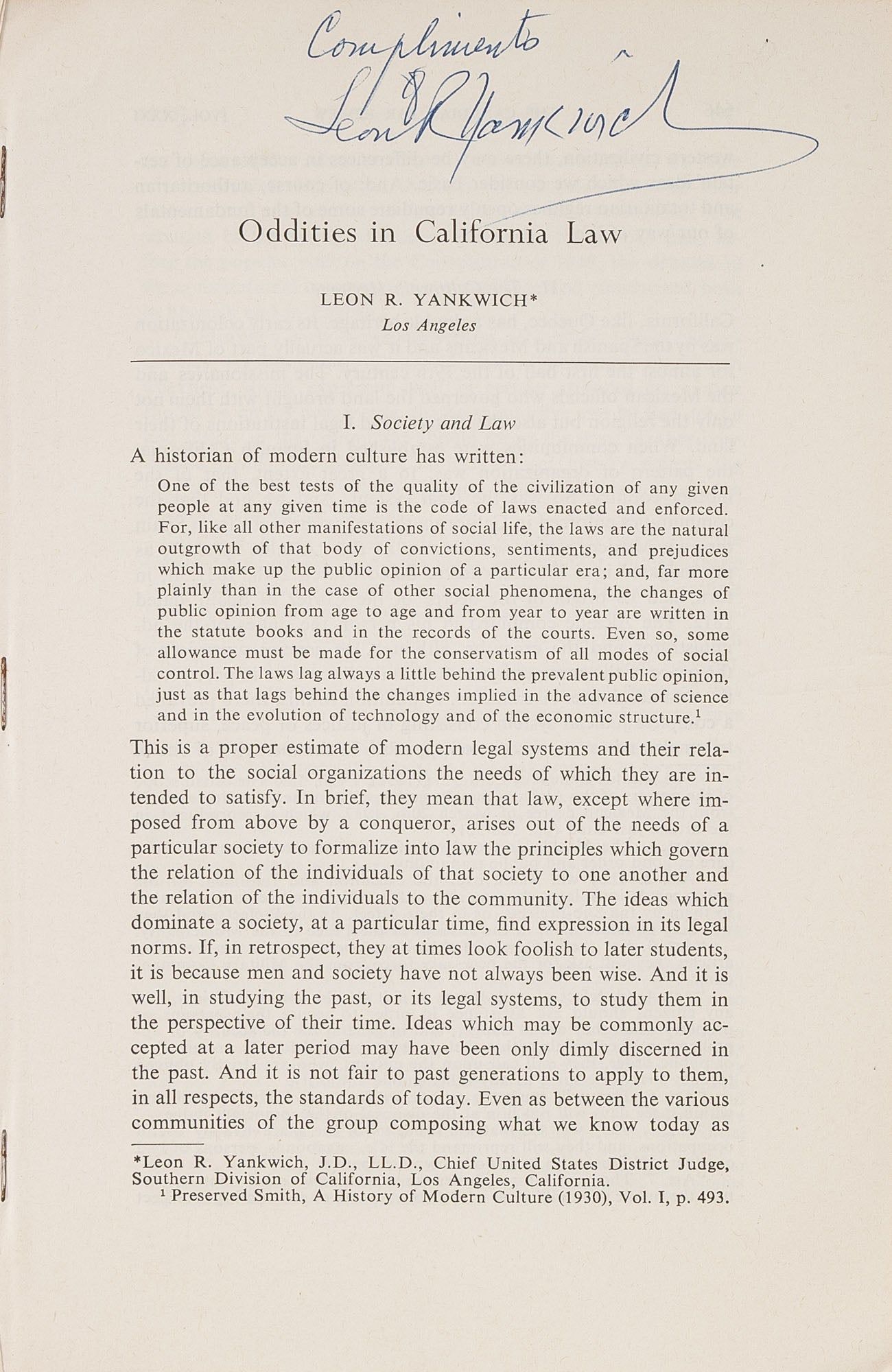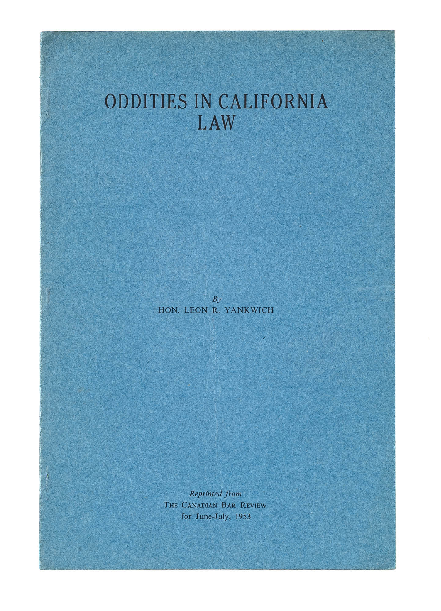 1953. Yankwich, Leon R. Oddities in California Law. Reprinted from The Canadian Bar Review for June-July, 1953. [1], 646-663 pp. Blue stapled wraps. Staples lightly rusted. "Compliments of Leon R Yankwich" to top of title. Letter addressed to Mr. Leonard H. Verborg, from Leon Yankwich tipped in. A very good copy. $75. * The recipient of the author's letter is almost certainly Leonard Herman Verbarg (1903-1984), Californian journalist and local historian. Contents: I. Society and Law; II. The California Heritage; III. The Common Law System; IV. Vestiges of the Old Systems; V. Conciliacion; VI. Prejudice in the Form of Law; VII. An Old Loyalty Oath; VIII. Conclusion.