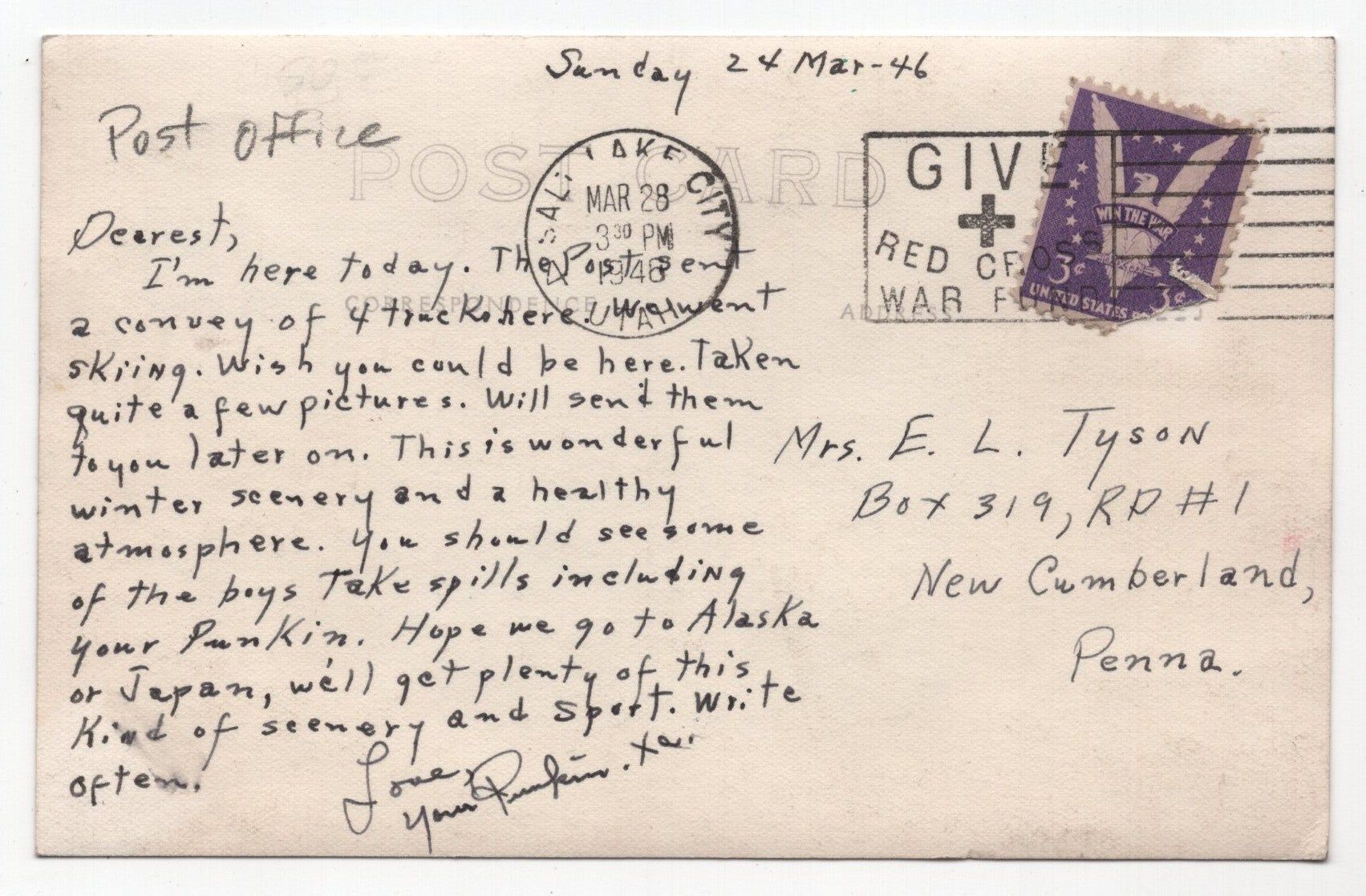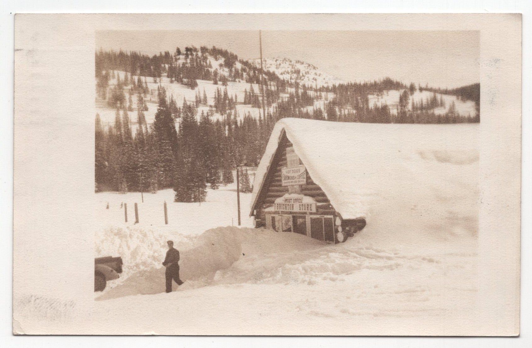 N.p.: n.p., 1940. Postcard. Very Good. Real photo postcard [3.5 x 5.5 inches]. Postally used; addressed (to "New Cumberland, Penna") with an inscription in black ink, stamped ("win the war" - three cents), and cancelled (Salt Lake City, March 1946). Image is lightly faded and some minor surface and edge wear. Image shows deep snow at the Brighton, Utah General Store & Post Office located at the Brighton Loop Road.