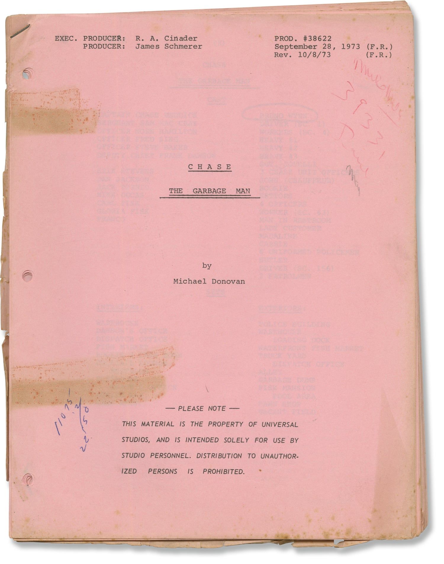 Universal City: Universal Studios, 1973. Draft script for the tenth episode of the first season of the 1973-74 NBC television series, that aired on November 27, 1973. Copy printed on pink leaves, with manuscript pencil and ink annotations on -- pages.