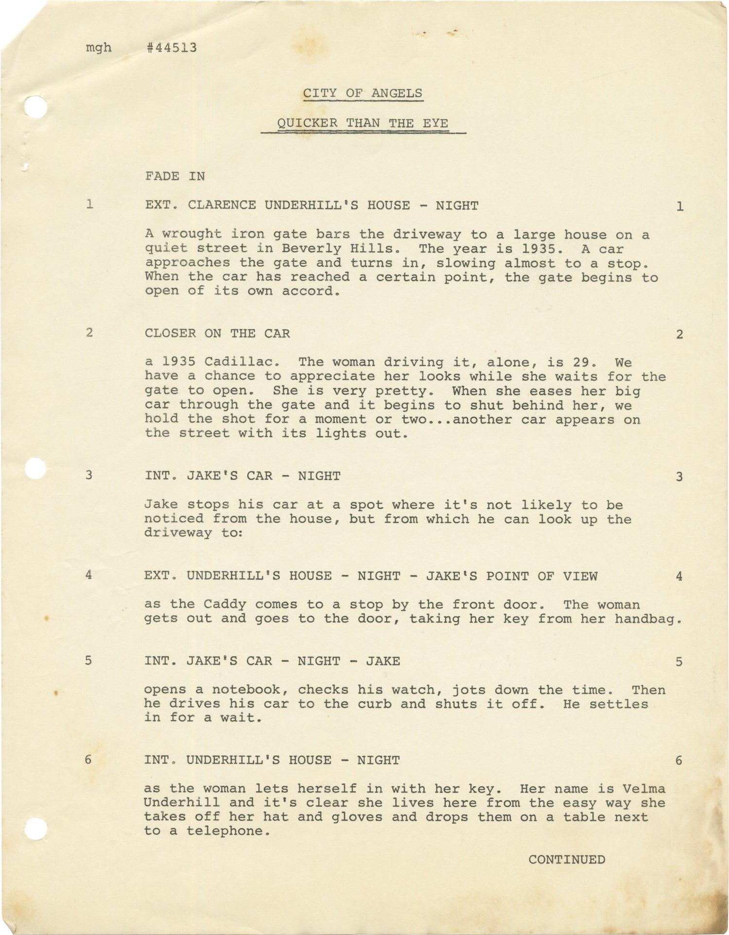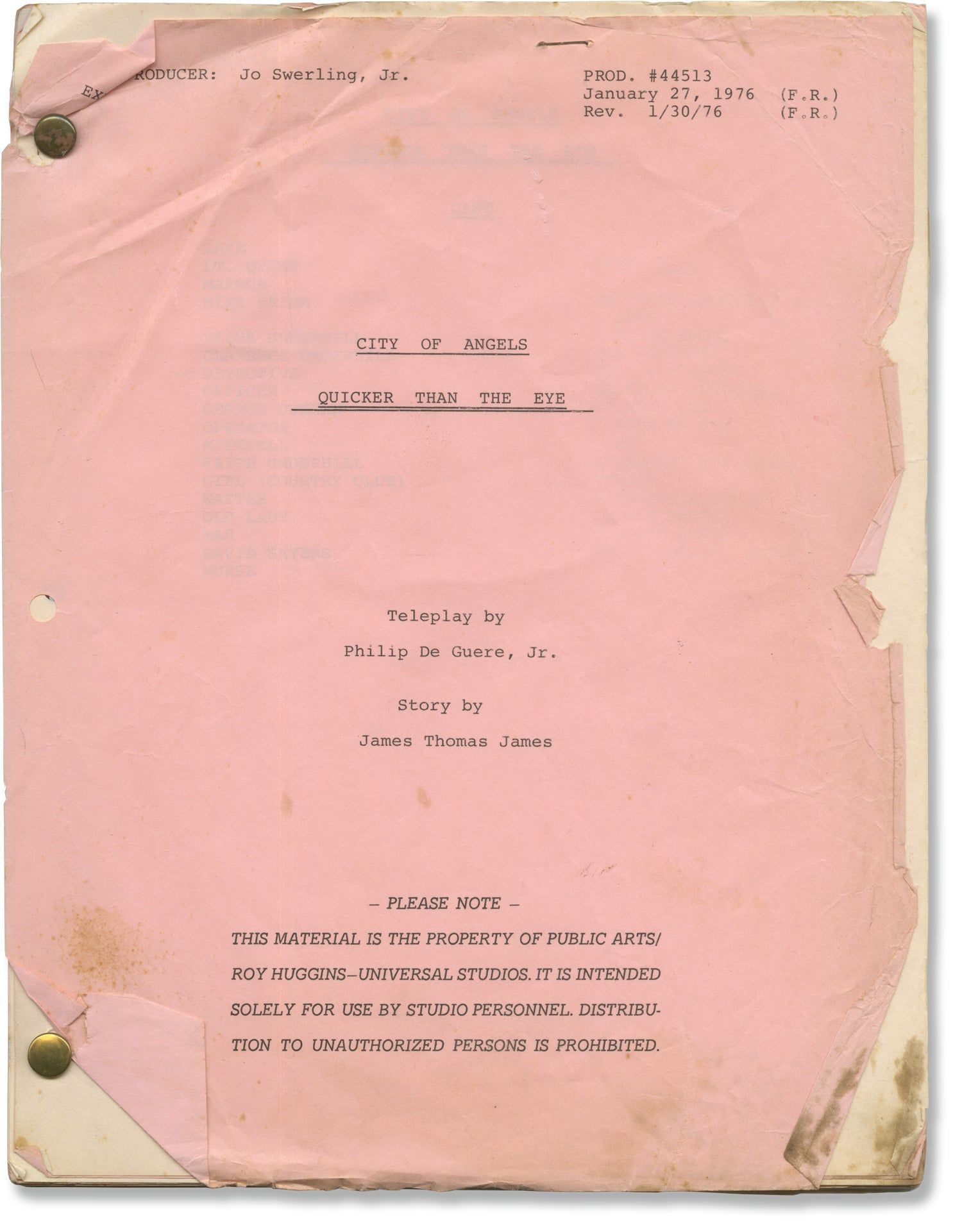 Universal City: Public Arts / Roy Huggins - Universal Studios, 1976. Draft script for the fourth episode of the 1976 NBC television series, here under the working title "City of Angels: Quicker Than the Eye," which aired on February 24, 1976. Not to be confused with the 2000 CBS medical drama television series created by Steven Bochco.