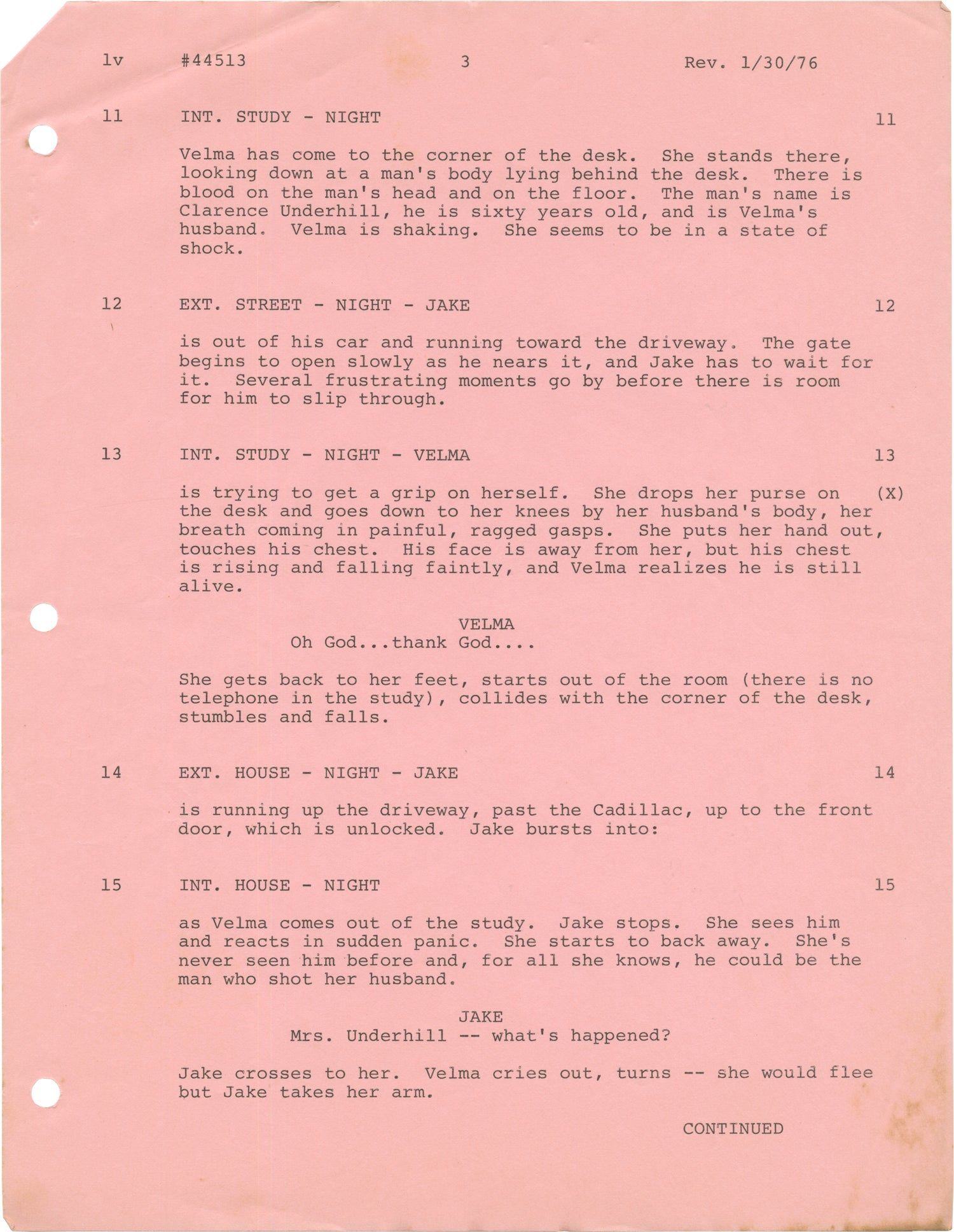 Front wrapper integral with title page, dated January 27, 1976, with credits for screenwriter Philip De Guere, Jr. and Story by James Thomas James. 63 leaves, with last page of text numbered 59. Mimeograph duplication, rectos only, with pink revision pages throughout, dated 1/30/76. Pages Very Good plus, with the front wrapper detached and stapled to the following two leaves, bound with two gold brads.