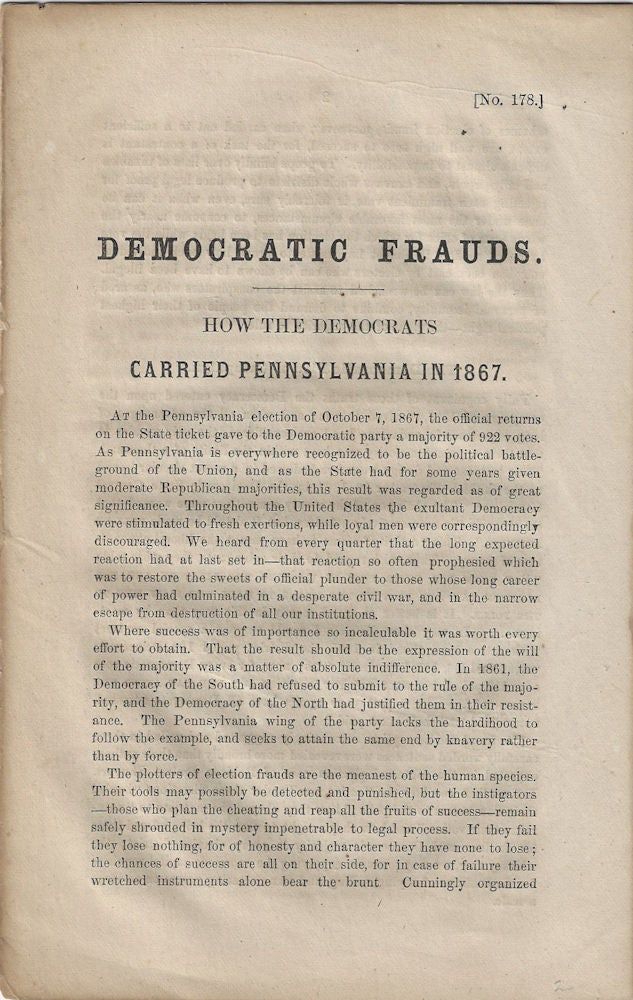 1867 – Pamphlet describing the unexpected results of an 1867 election of a Pennsylvania state representative which resulted in an astonishing win for the Democratic candidate, but was later exposed to be the result of vote fraud