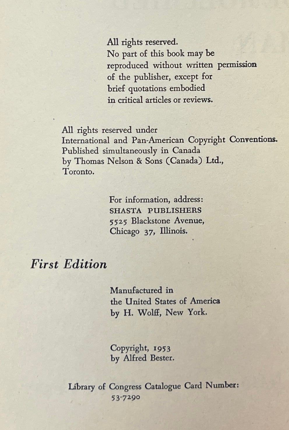 Chicago: Shasta, 1953. First Edition. Hardcover. Very Good/Very Good. Very Good in a Very Good jacket, unclipped ($3.00), lightly soiled, a scuff under the author's name on the front panel, a thin tidemark on the rear panel. Quarter blue cloth with red paper on the boards, some rubbing to the paper. Square and firmly bound with a dark blue top stain, a few stains at the fore-edge and endpapers, clean otherwise. Bester's Hugo Award-winning science fiction detective novel, one so great that the post-modern master Thomas Pynchon wanted to adapt it into an Opera as part of his Ford Foundation Fellowship.