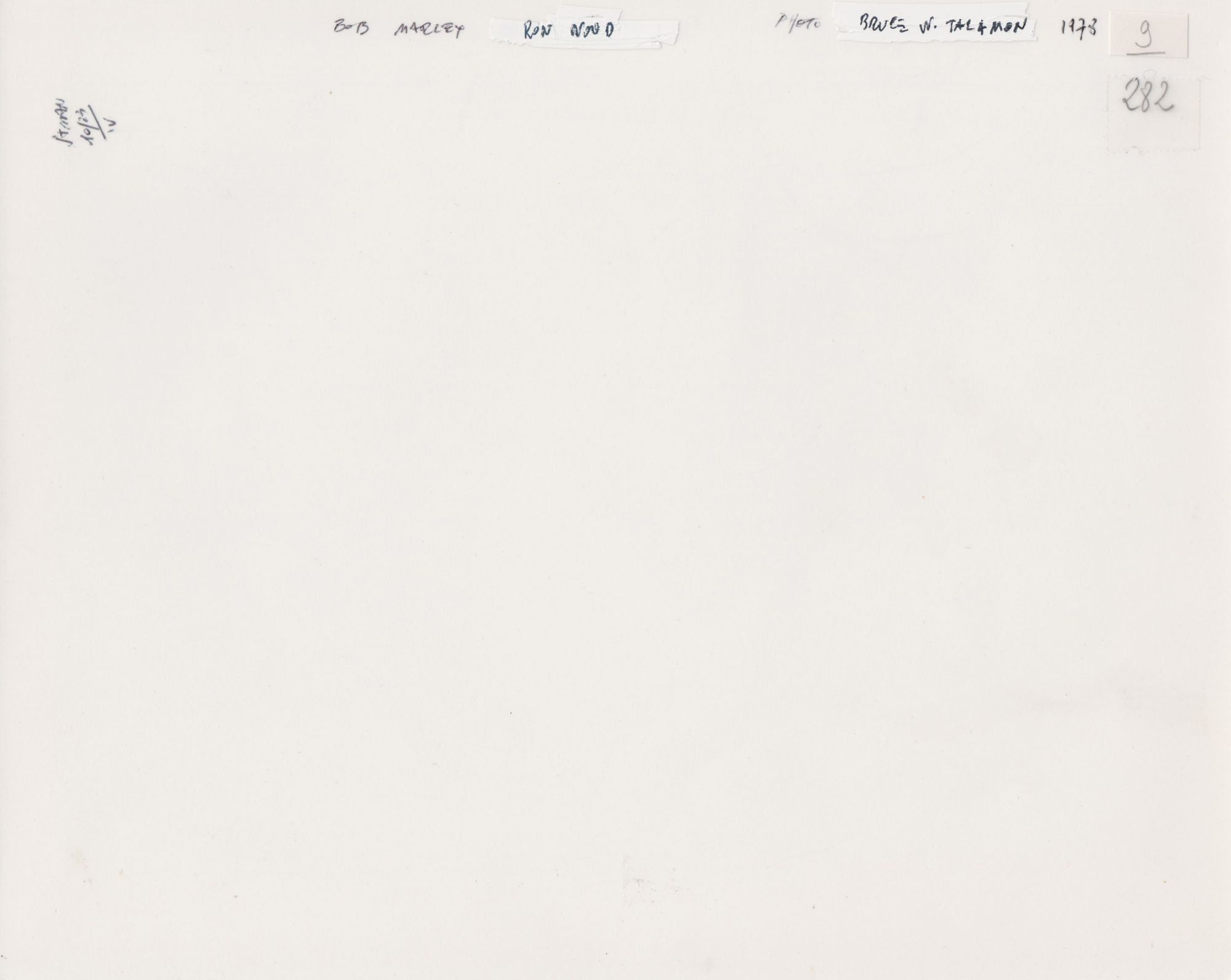 N.p.: N.p., 1979. Vintage black-and-white photograph of Jamaican musician Bob Marley and Rolling Stones guitarist Ron Wood backstage at the Oakland Coliseum on November 30, 1979. Annotations in manuscript ink and pencil on the verso.