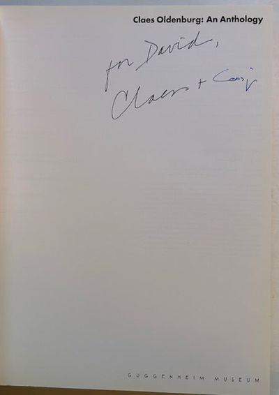 New York: The Solomon R. Guggenheim Foundation, 1995. Original wraps. Fine. SIGNED BY BOTH CLAES OLDENBURG AND HIS WIFE, FELLOW ARTIST COOSJE VAN BRUGGEN, on the half-title. An all-but-pristine copy to boot of the softcover edition of the 1995 stated 2nd edition of the exhaustive Guggenheimn catalogue. Clean and Near Fine in its pictortial wrappers. Thick, tall quarto, first-rate color and black-and-white reproductions throughout.