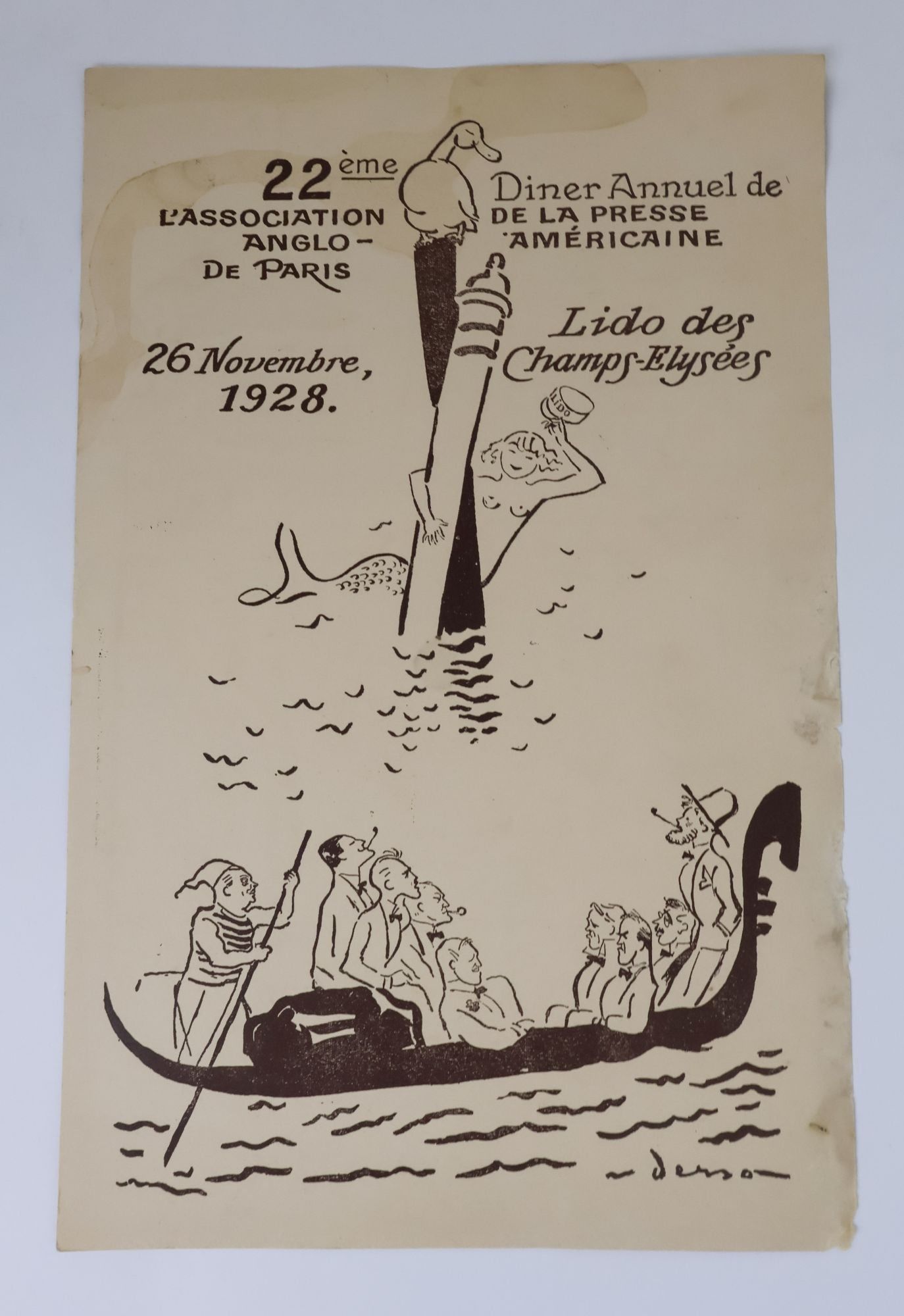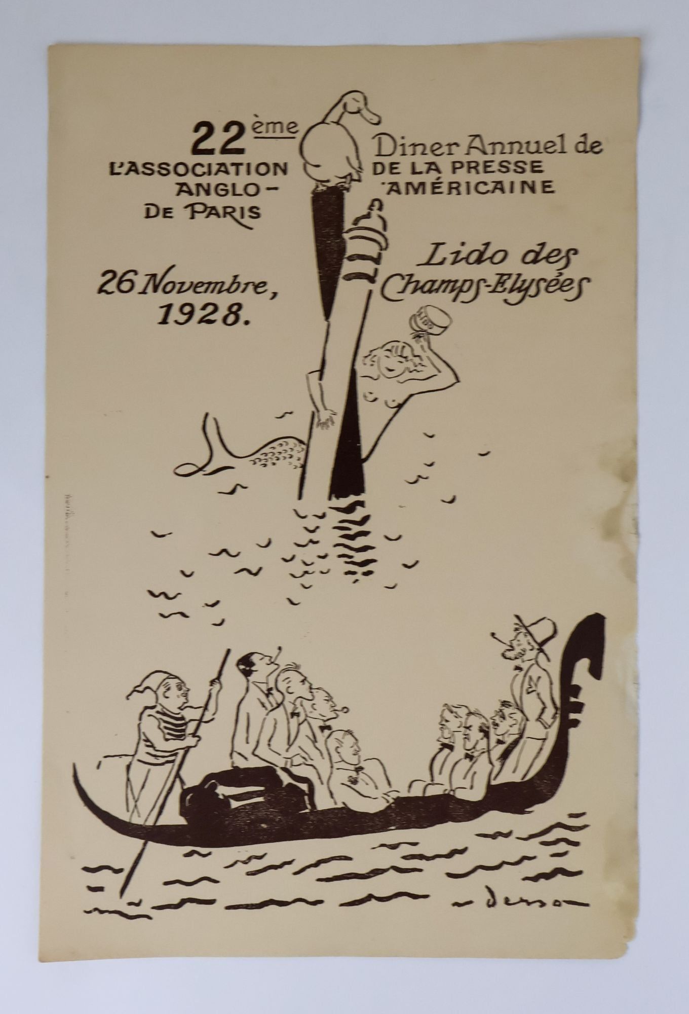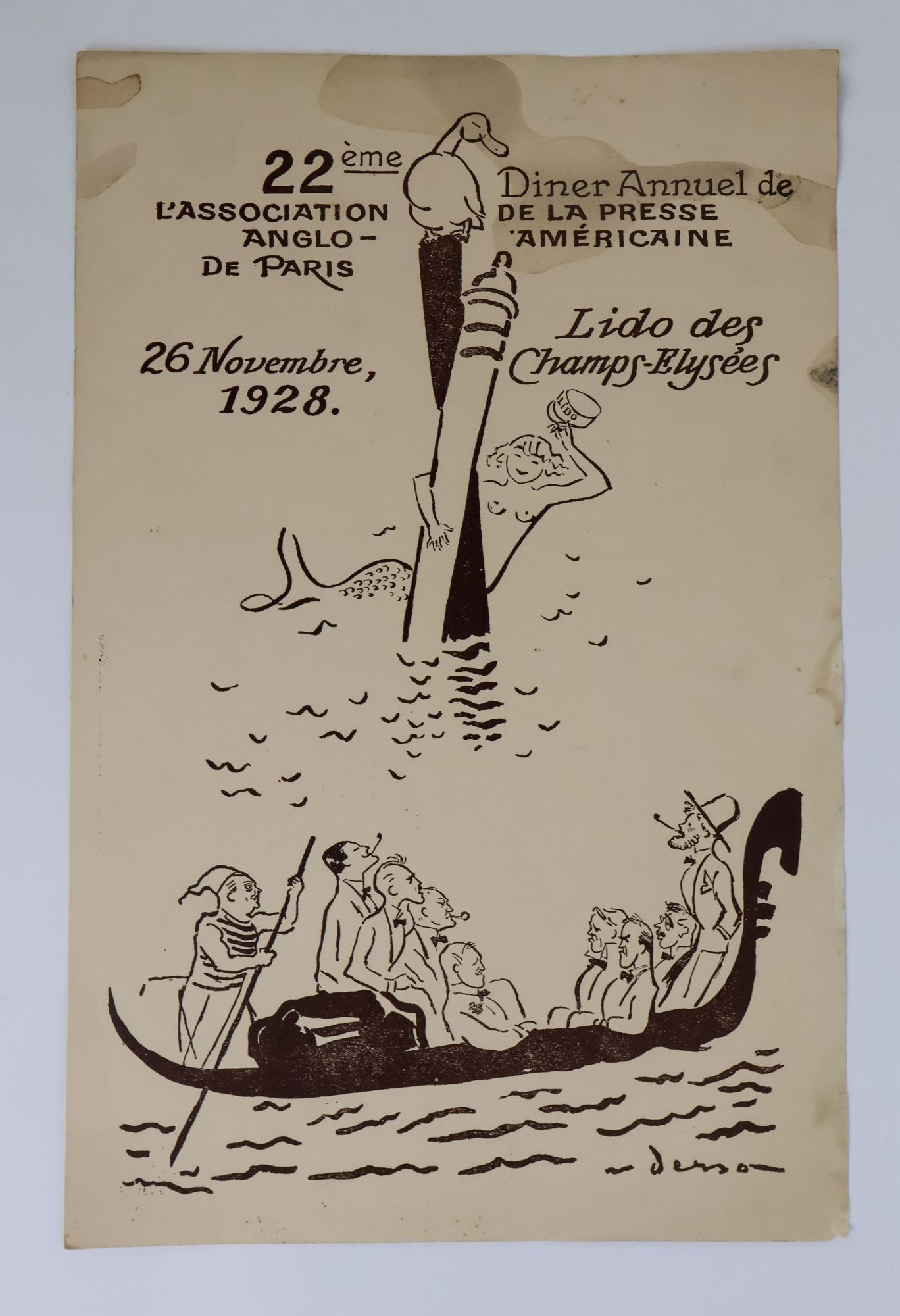 Paris: L'Association de la Presse Anglo-Americaine de Paris, 1928. Other. Three Programs, one sheet each. In Very Good condition. Illustrated on the front, with entertainment and food menu on the rear. Each program is lightly age toned, with some chipping and soiling along the right edge. Large, faint stains on the front of two of the programs near the top edge. Varying levels of soiling on the backs of the programs, with one being very lightly soiled along the edge, another with more moderate soiling, and the third showing heavier soiling and food stains. SH consignment. Shelved in Room A Oversize. . L'Association de la Presse Anglo-Americaine de Paris (The Association of the Anglo-American Press of Paris) is a journalist's organization, founded in 1907, that held weekly lunches and annual dinners for journalists and French politicians. The programs were produced for the association's 1928 dinner, held at the Lido des Champs Elysees, an iconic Parisian theater and cabaret that had opened earlier that year.